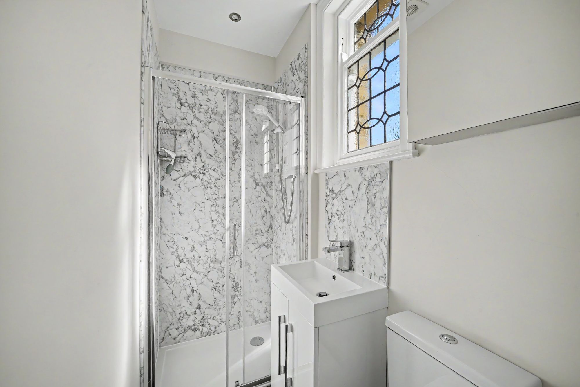 With inset LED downlighters, extractor fan, leaded and glazed window, floor to ceiling tiled walls, tiled floor and fitted with a corner shower cubicle with chrome shower fitting.