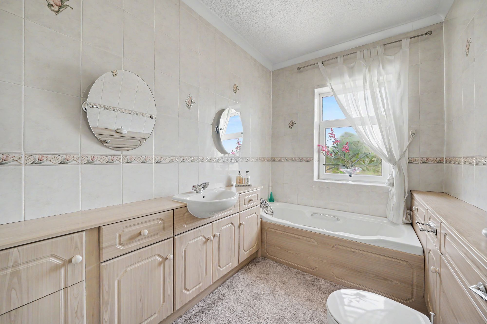 With a ceiling light point, ceiling coving, frosted uPVC double glazed window, ladder style heated towel rail, central heating radiator, shaver socket and fitted with a suite comprising vanity unit incorporating wash basin, Bidet, low flush w.c with concealed cistern and panelled bath with mixer tap incorporating hand spray.