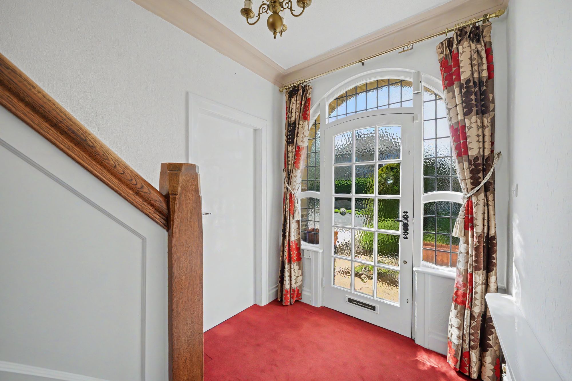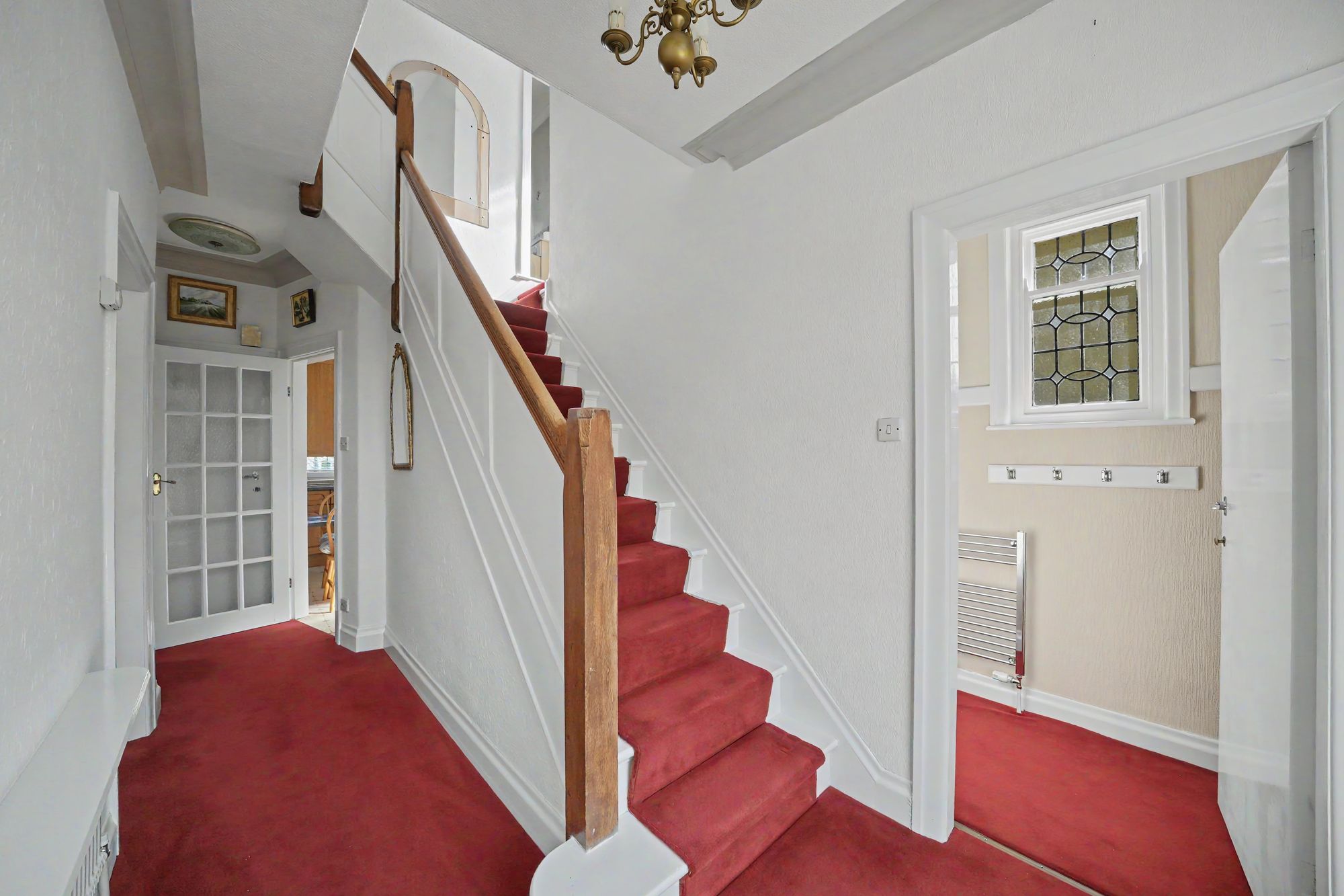 With a split staircase. The landing has a ceiling light point, frosted leaded stained-glass window and central heating radiator.