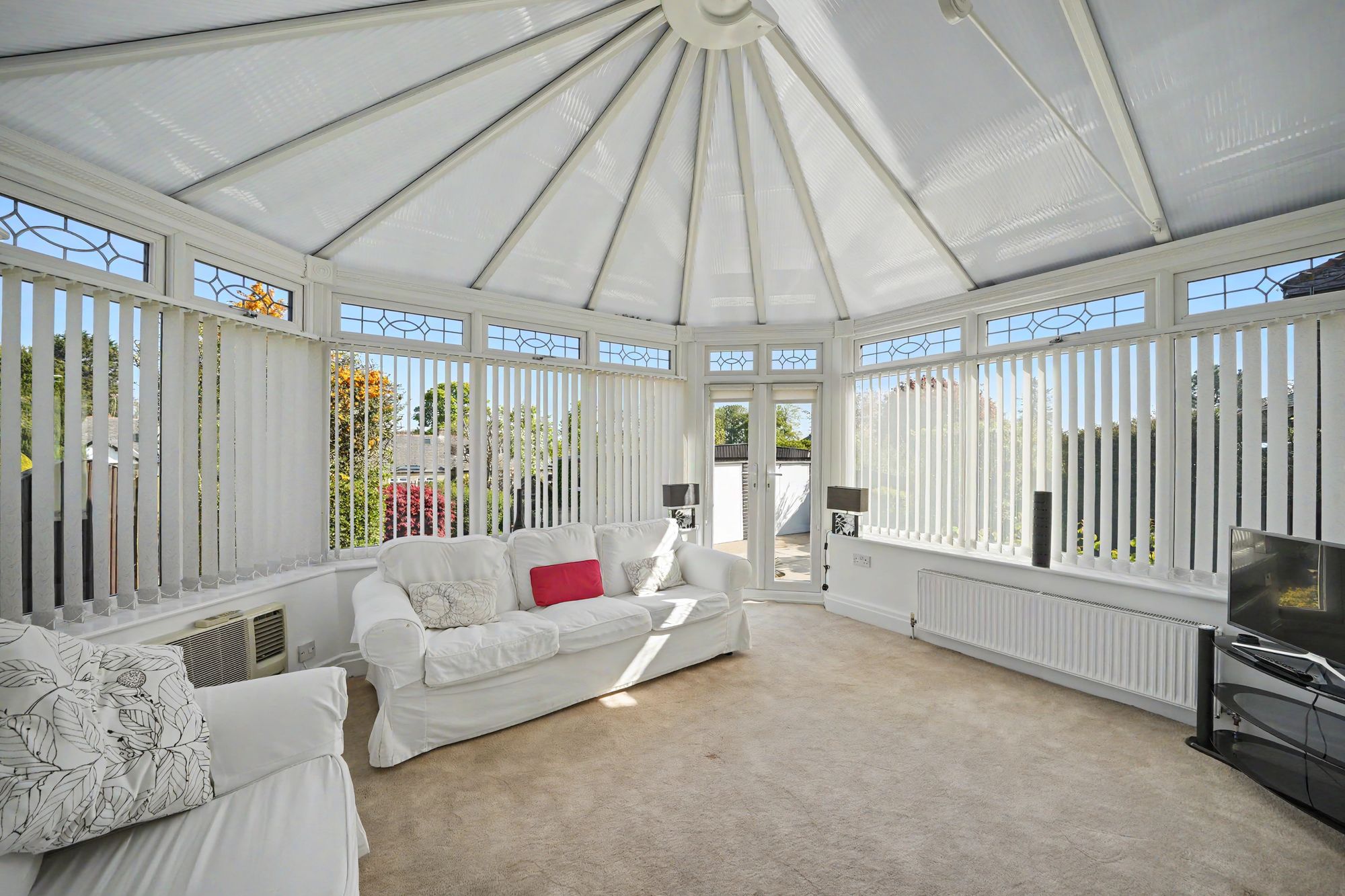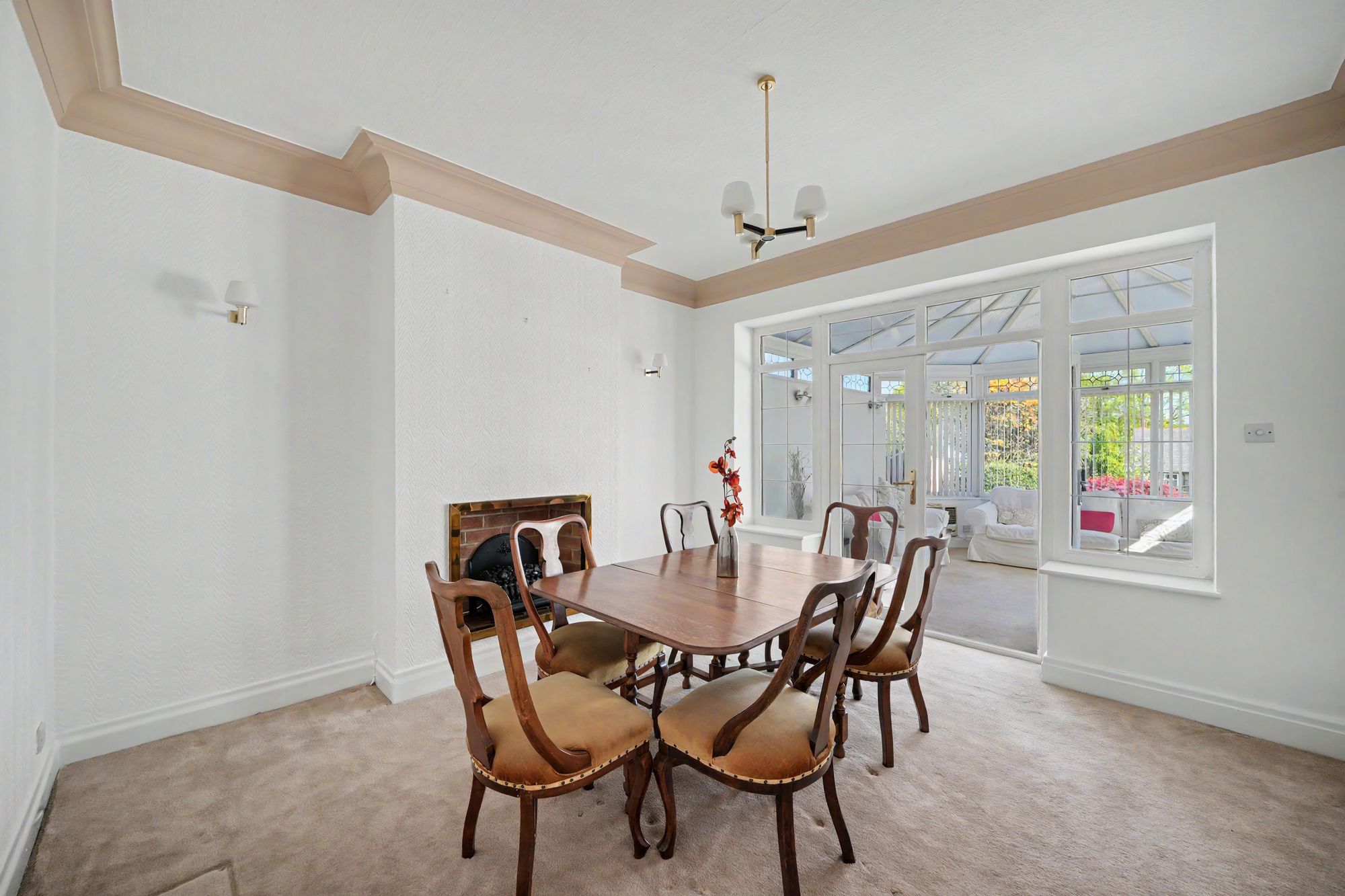 This has a ceiling light point, ceiling coving, three wall light points, central heating radiator and housed within the chimney breast there is a coal effect electric fire which rests on a quarry tiled hearth. To the rear elevation there are uPVC double glazed windows with central French doors which open into the conservatory.