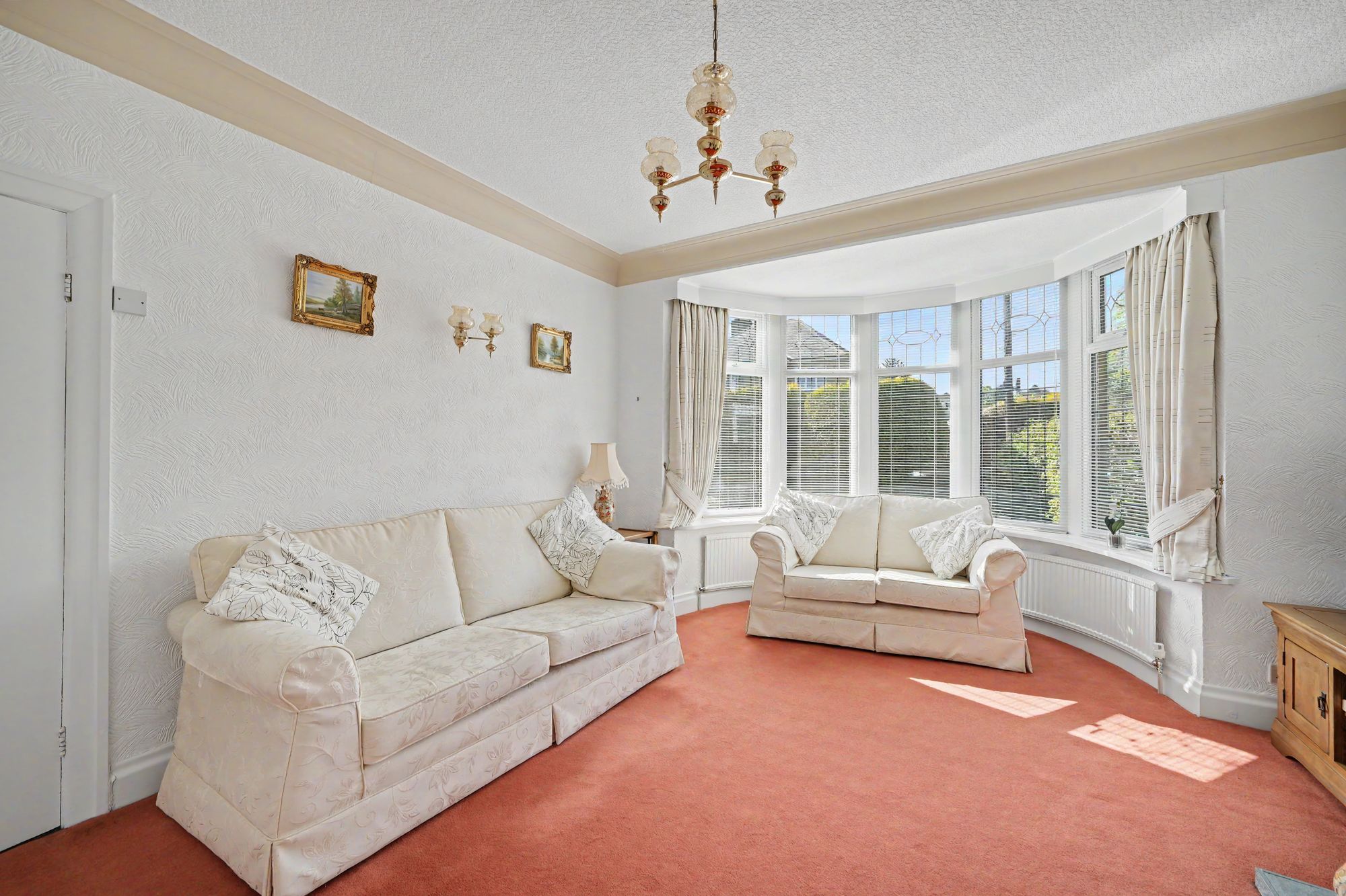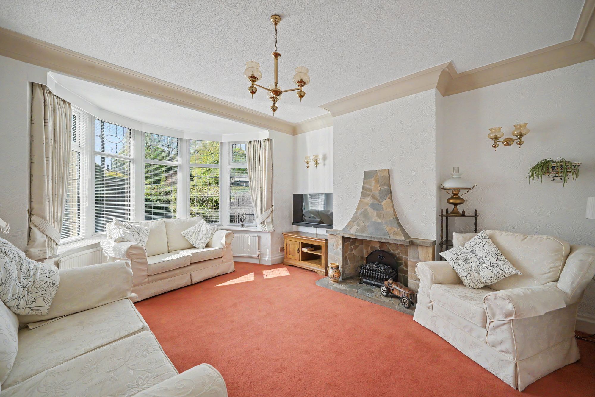 A generously proportioned principal reception room with a walk-in semi-circular bay with uPVC and leaded double-glazed windows looking out over the front garden. There is a ceiling light point, ceiling coving, three wall light points, two central heating radiators and as the main focal point of the room there is a random stone fireplace which is home to a coal effect electric fire which rests on a random stone hearth.