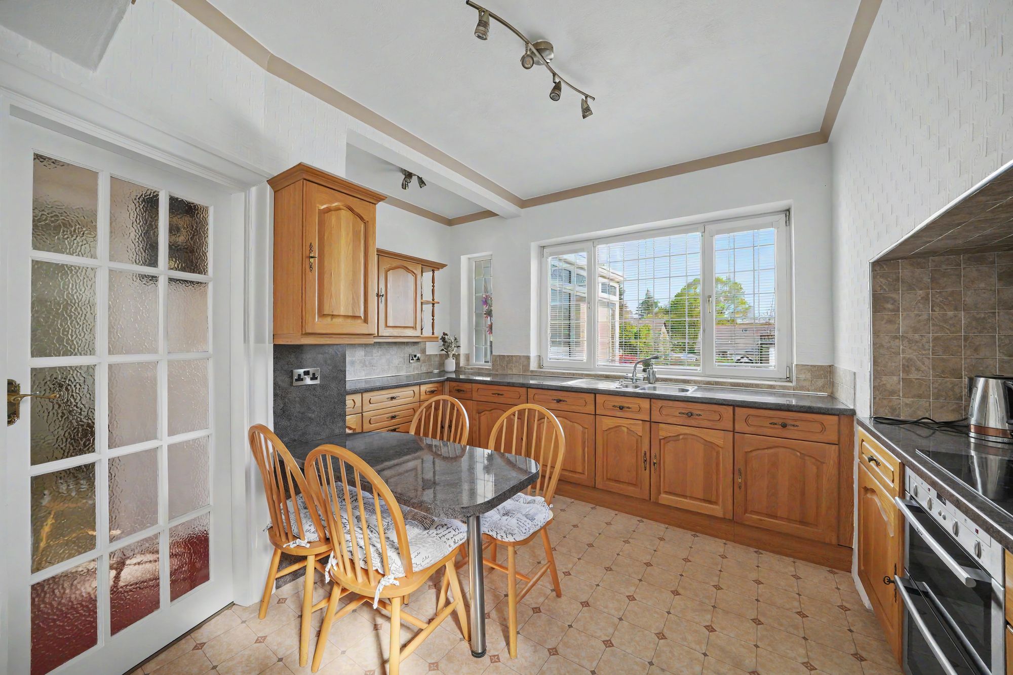 This is situated adjacent to the dining room and has two uPVC double glazed windows to the rear elevation, uPVC and frosted double glazed stable style door giving access to the driveway, two ceiling light points, ceiling coving, central heating radiator, useful storage cupboard beneath the stairs. The kitchen is fitted with a range of light oak faced base and wall cupboards with leaded and glazed display cupboard, drawers, pan drawer, contrasting overlying worktops with tiled splashbacks, breakfast bar, inset one and half bowl single drainer stainless steel sink with chrome mixer tap, integrated fridge, integrated dishwasher, stoves four ring halogen hob with Neff electric double oven beneath, kick space heater and concealed lighting beneath the wall cupboards.