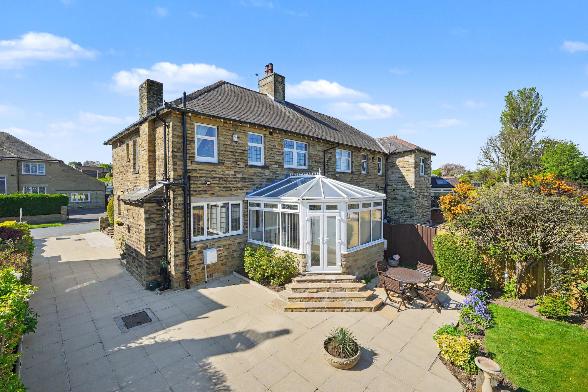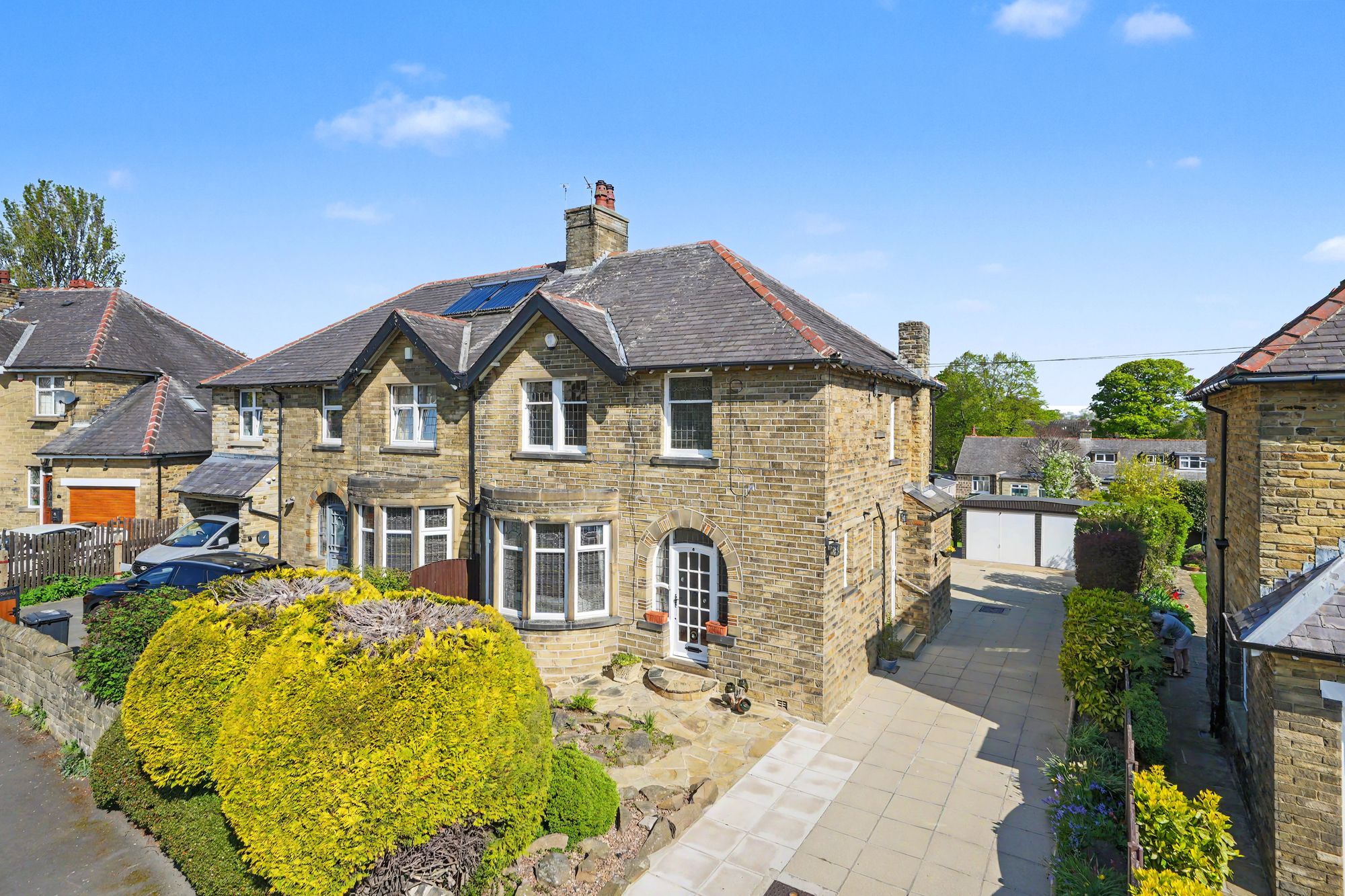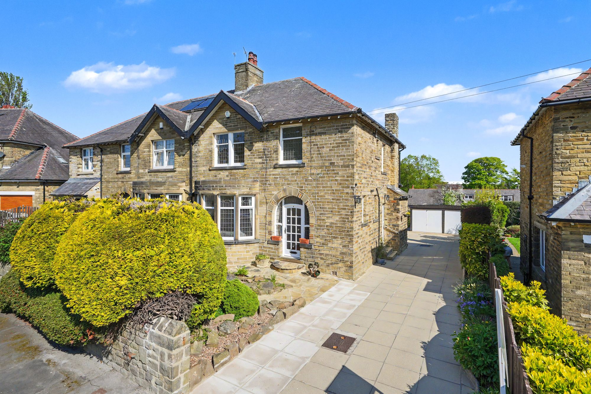 Available with vacant possession and no onward chain, a lovely stone built semi-circular bay fronted, 4-bedroom semi-detached house occupying generous established gardens along with a wide flagged driveway and detached double garage.