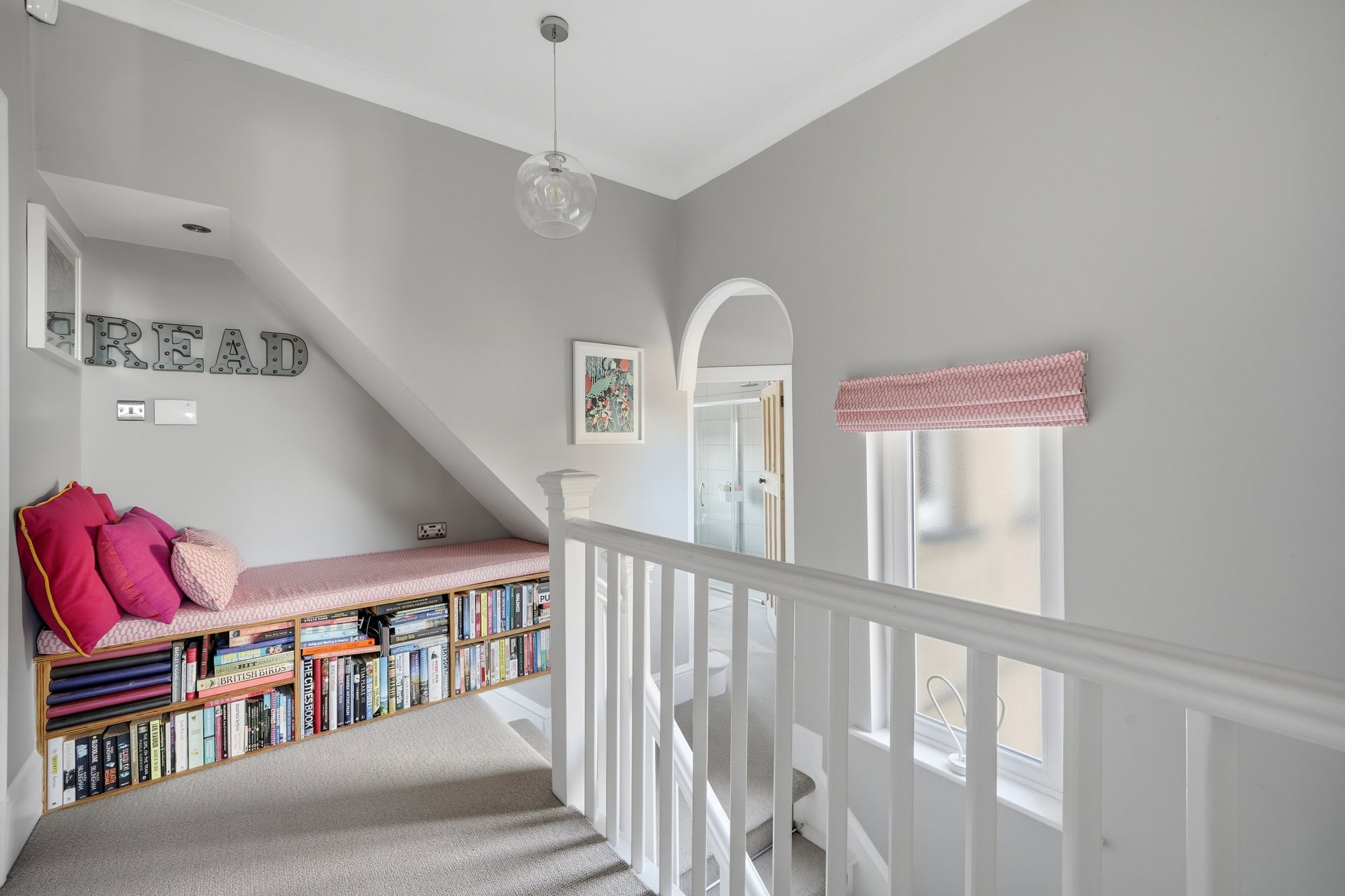 With two pvcu double glazed windows (one frosted), ceiling light point, ceiling coving and beneath the staircase rising to the second floor there is a fitted day bed with book shelving beneath and inset LED downlighter above. From the landing access can be gained to the following rooms: -