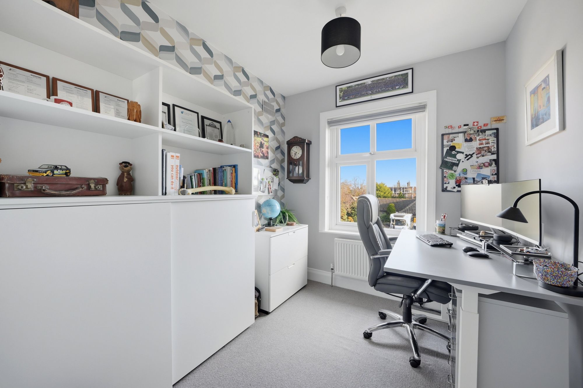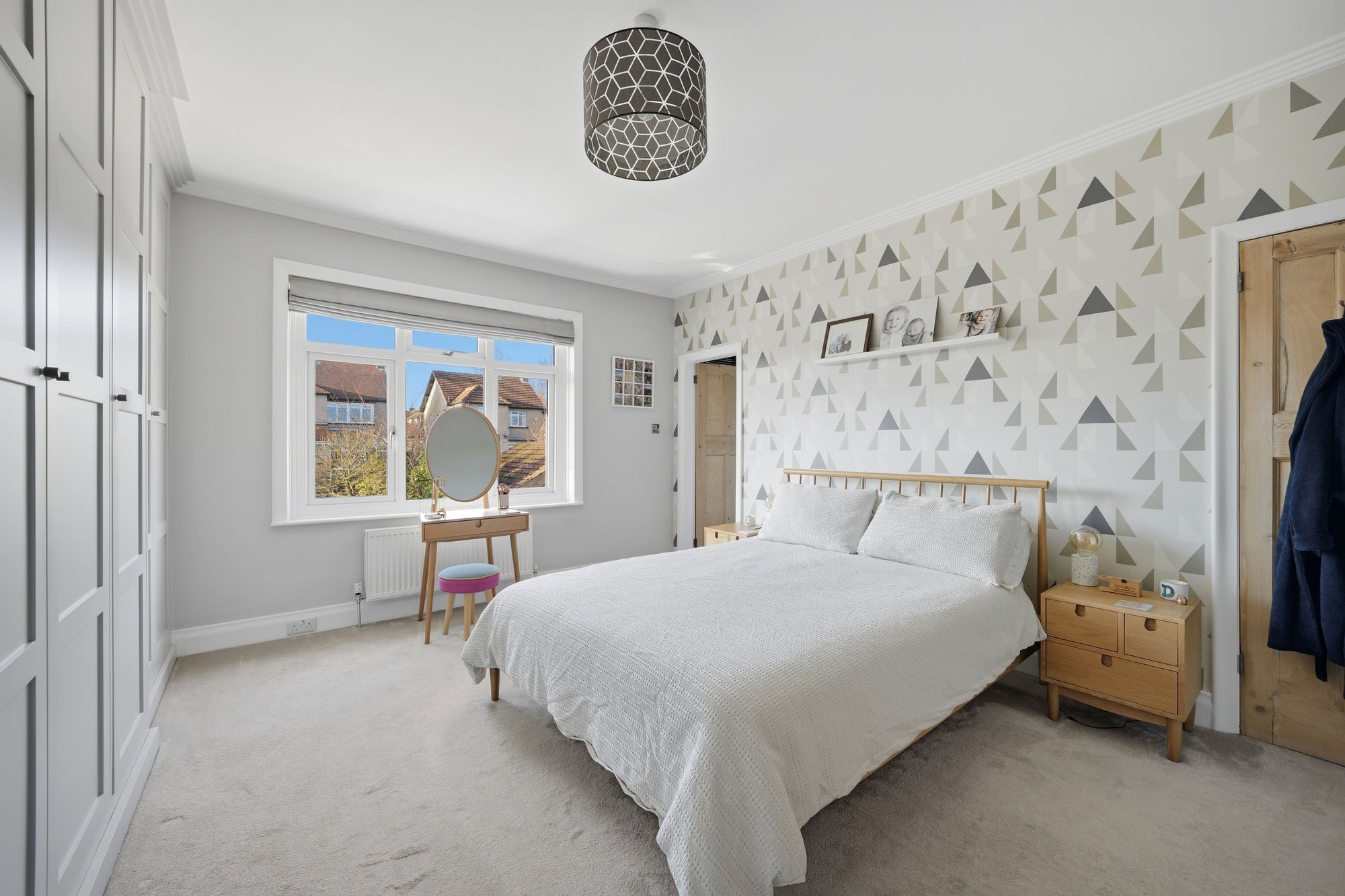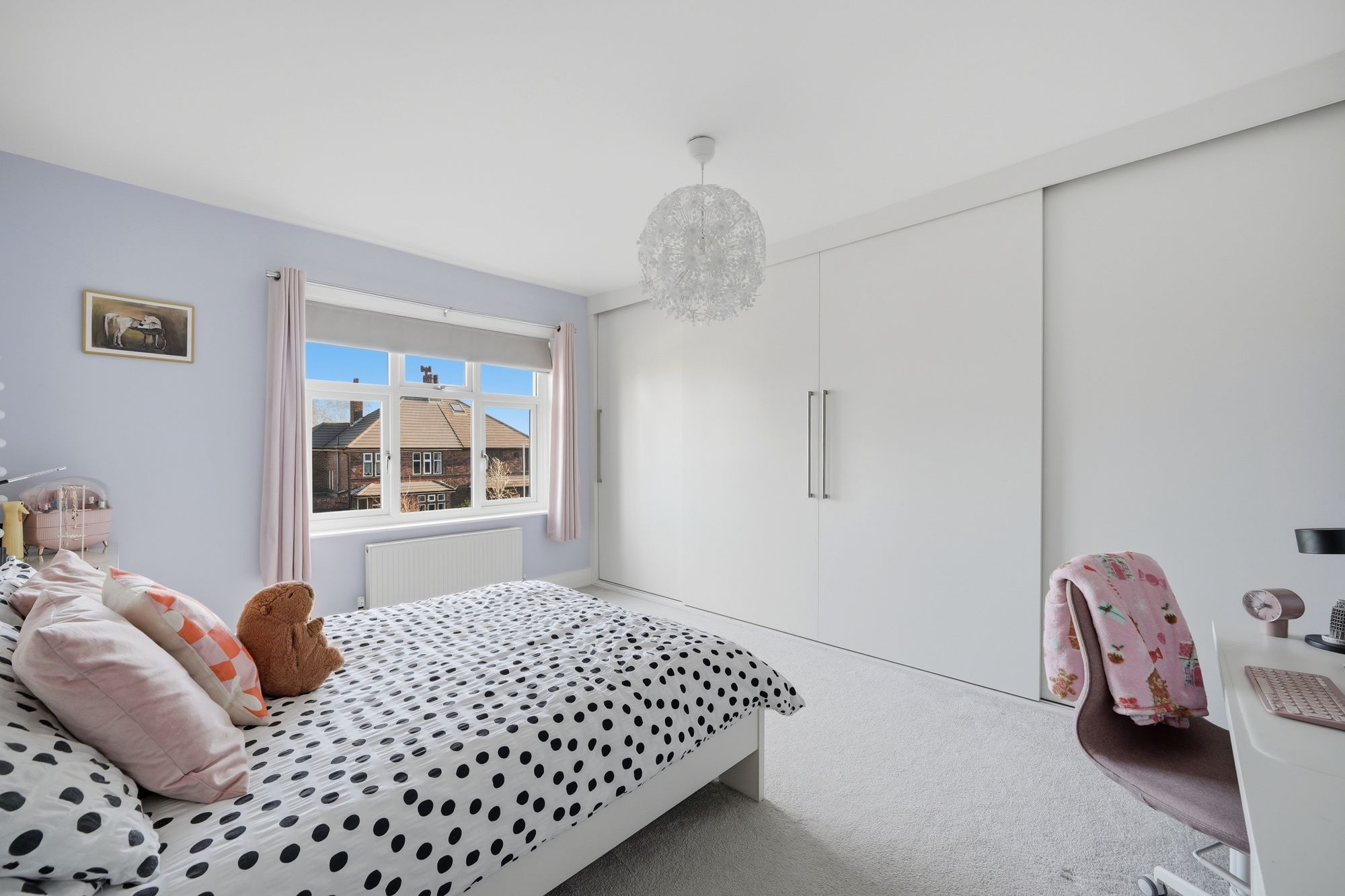 Another good-sized double room which has a pvcu double glazed window looking out over the front garden. There is a ceiling light point, central heating radiator and to one wall there are a bank of fitted matte white floor to ceiling sliding door wardrobes.