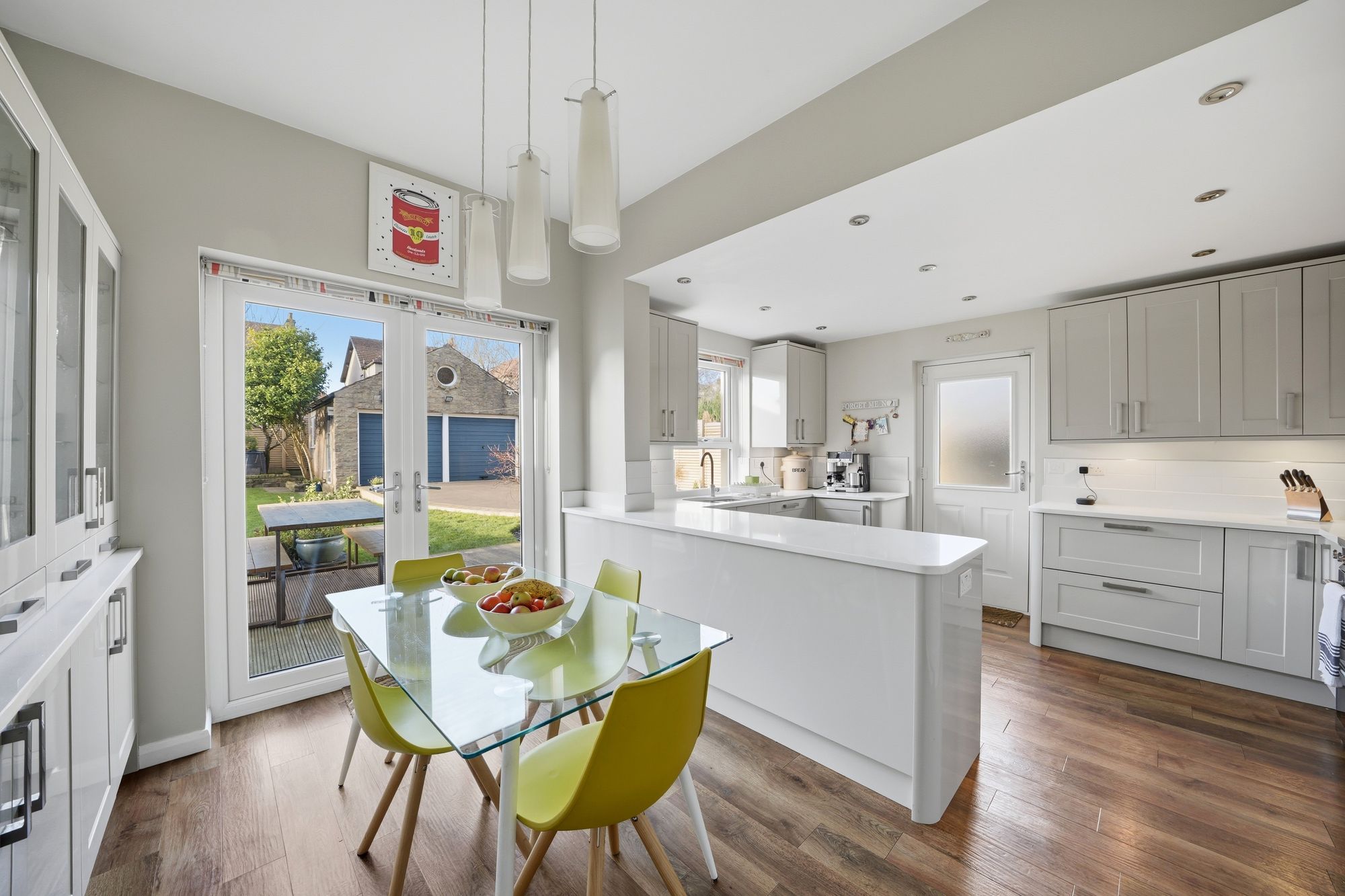 This is situated adjacent to the sitting room once again enjoys a pleasant aspect over a generous west facing rear garden with pvcu double glazed French doors and window whilst the side elevation there is a composite panelled and frosted double glazed door giving access to the driveway. There are inset LED downlighters, ceiling light point above the dining section, vertically hung column style radiator, Karndean flooring and fitted with a range of grey gloss shaker style base and wall cupboards, drawers, these are complimented by brushed stainless-steel handles and overlying quartz worktops with quartz and tiled splashbacks.