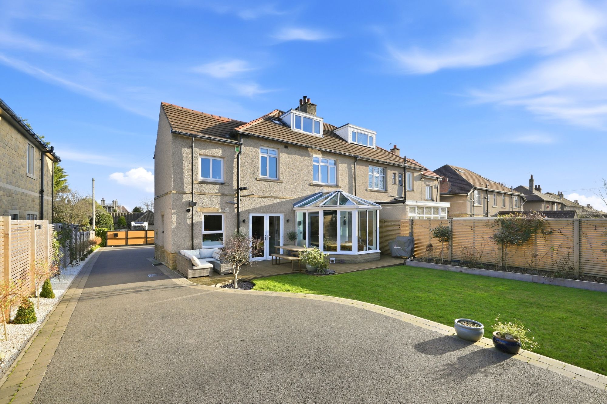 Beautifully presented part stone and remained rendered four bedroomed (2 En-suite) semi-detached house, constructed circa 1927 and standing within generous gardens together with equally generous electric gated driveway with off road parking for several cars and detached double garage.