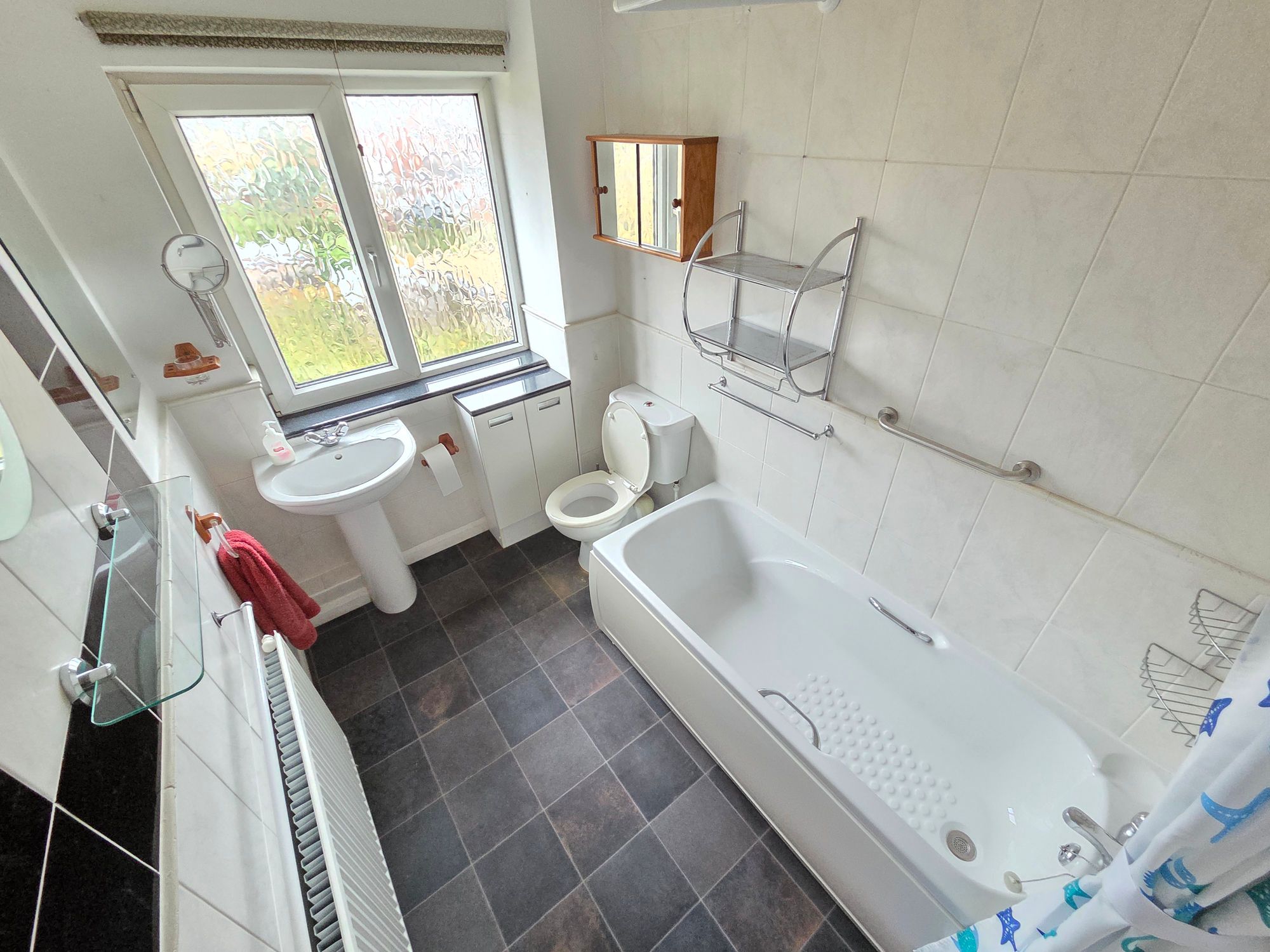 BATHROOMA three-piece suite comprising of a close coupled W.C, pedestal basin with chrome taps over, and bath with chrome mixer taps over. The room has a built in vanity unit, ceiling light, part tiling to walls, tiled floor, shaver socket, central heating radiator and uPVC obscure glazed window.
