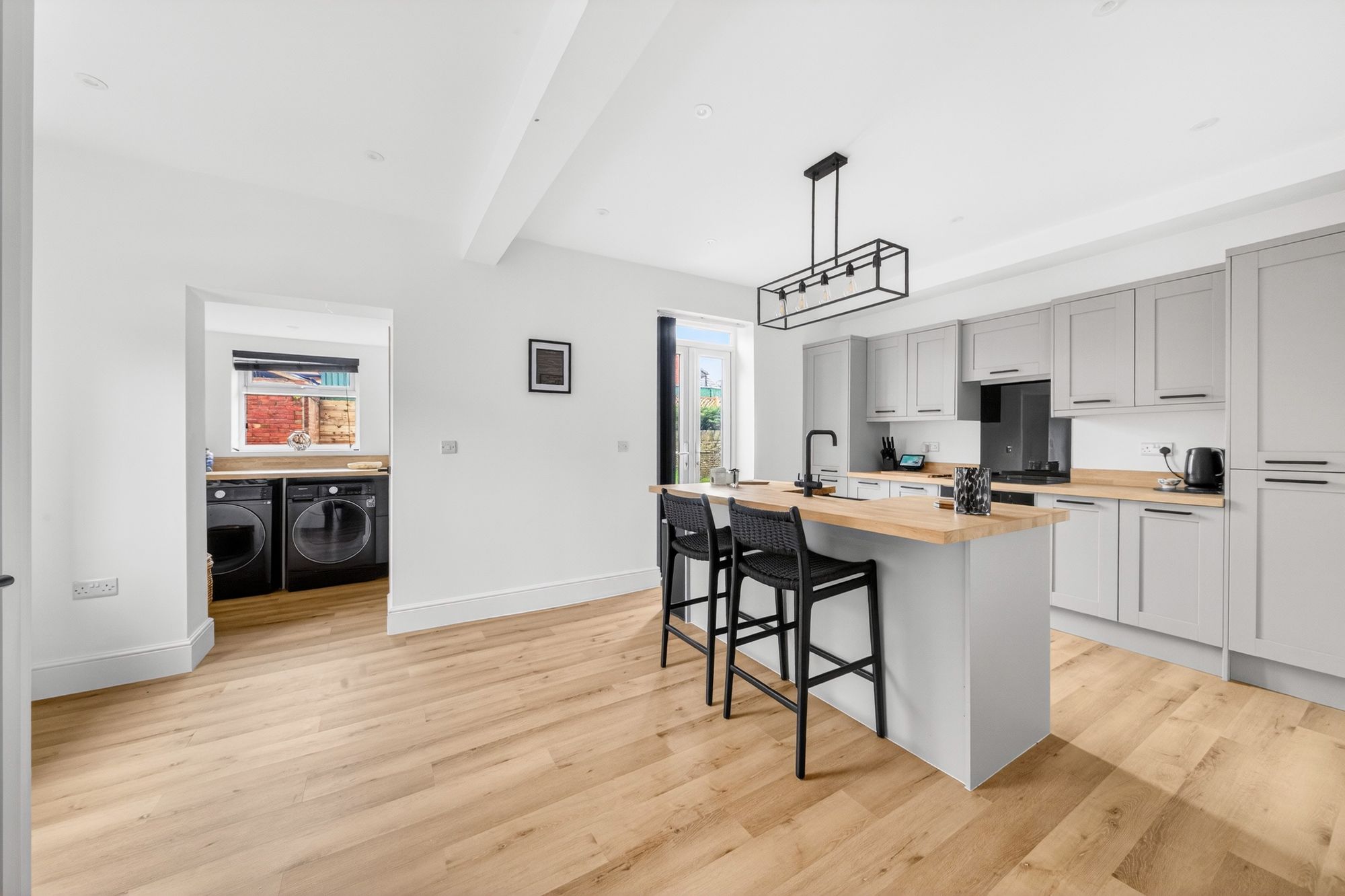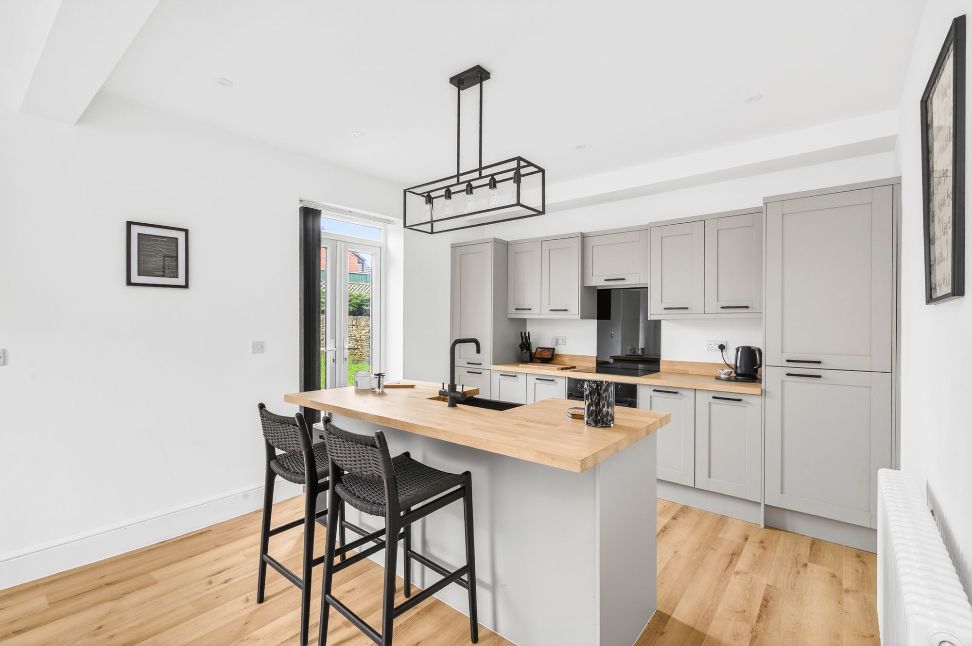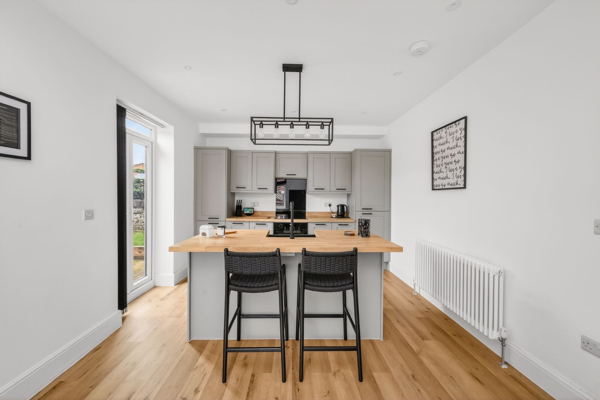 DINING KITCHENWe have the dining kitchen area with a range of base and wall mounted and pantry units with shaker front with a with oak worktop over. There is a Zanussi induction four-ring hob with integrated Zanussi oven below with integrated fridge and freezer. The room is complemented by a kitchen island in the same style as the units and worktop. On here we find a Belfast style sink in black with a black mixer tap over top with integrated dishwasher and further storage. The room contains inset spotlights as well as a ceiling light point, 2 column style radiators and UPVC double glazed patio style doors leading to the rear of the property. From here we also find a UPVC double glazed window to the side of the property. There is also access to a handy storage cupboard.