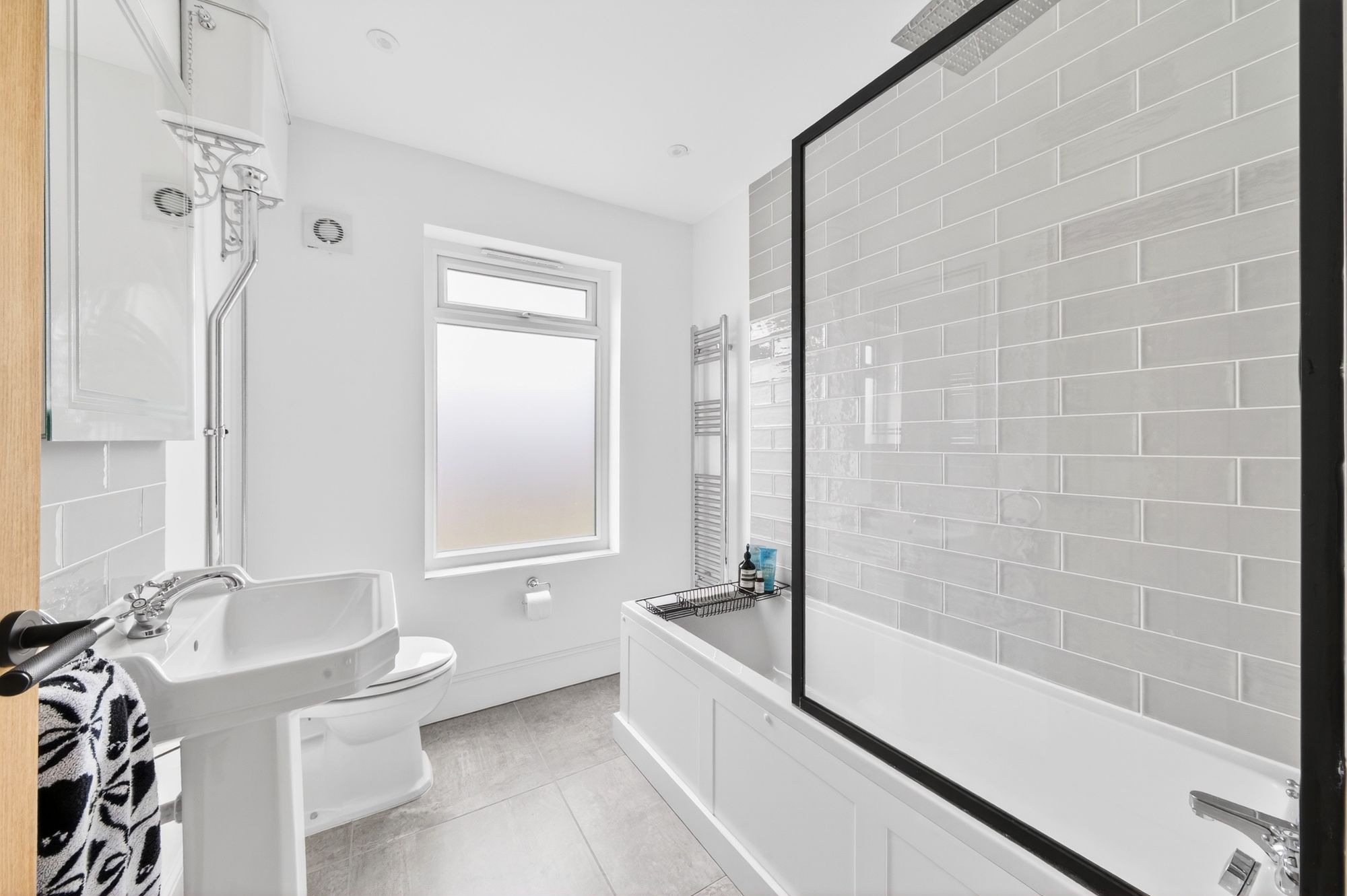 HOUSE BATHROOMThe bathroom compromises of a three-piece suite in white. Which consists of a high-level cistern flush toilet, a white pedestal hand basin with antique style mixer tap over, and a bath with Victorian style mixer tap over with an mains-fed shower. With rainfall effect shower heads, inset spotlights to the ceiling, a chrome ladder style radiator, UPVC double glazed opaque window and the room is partially tiled.