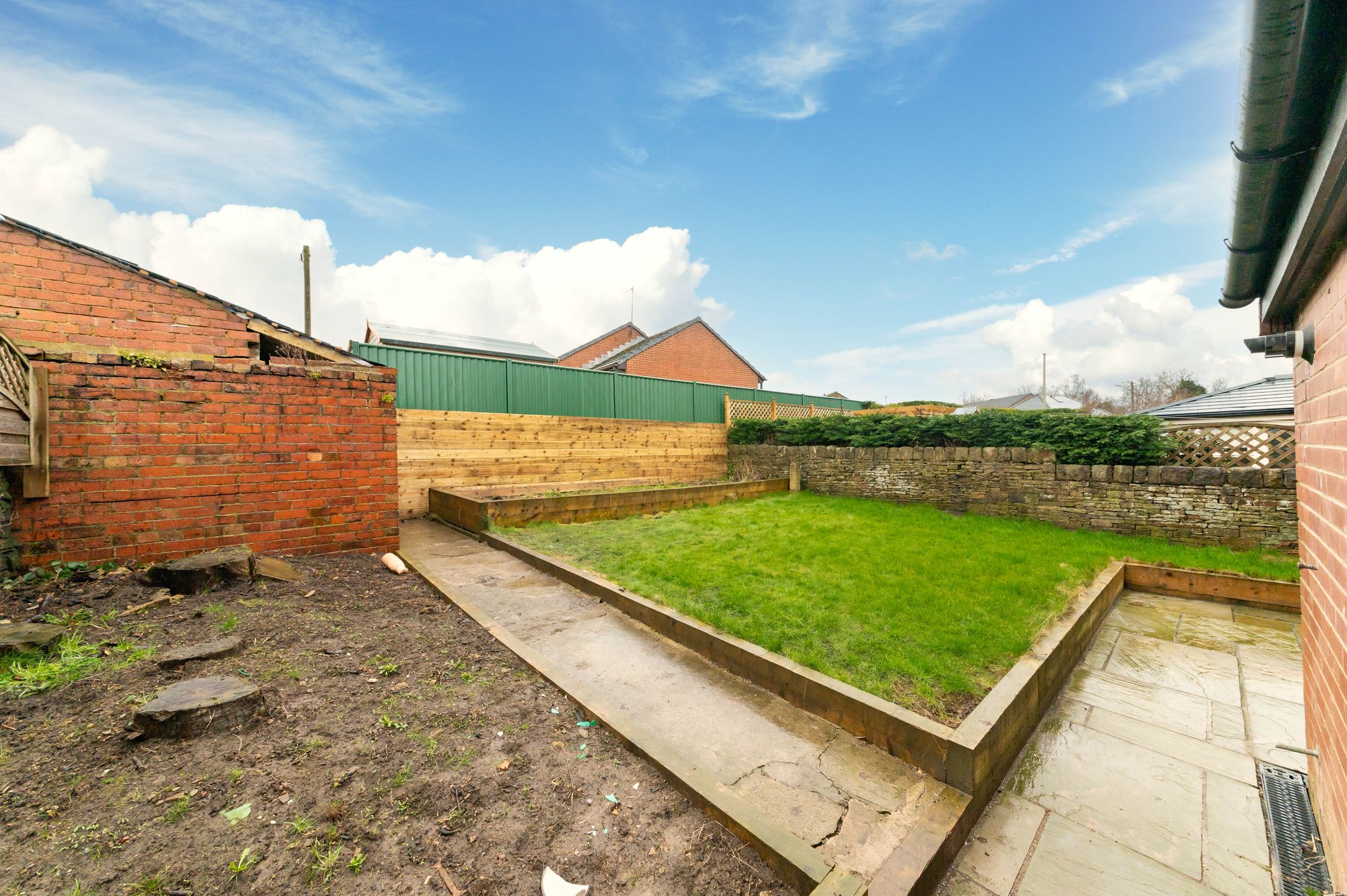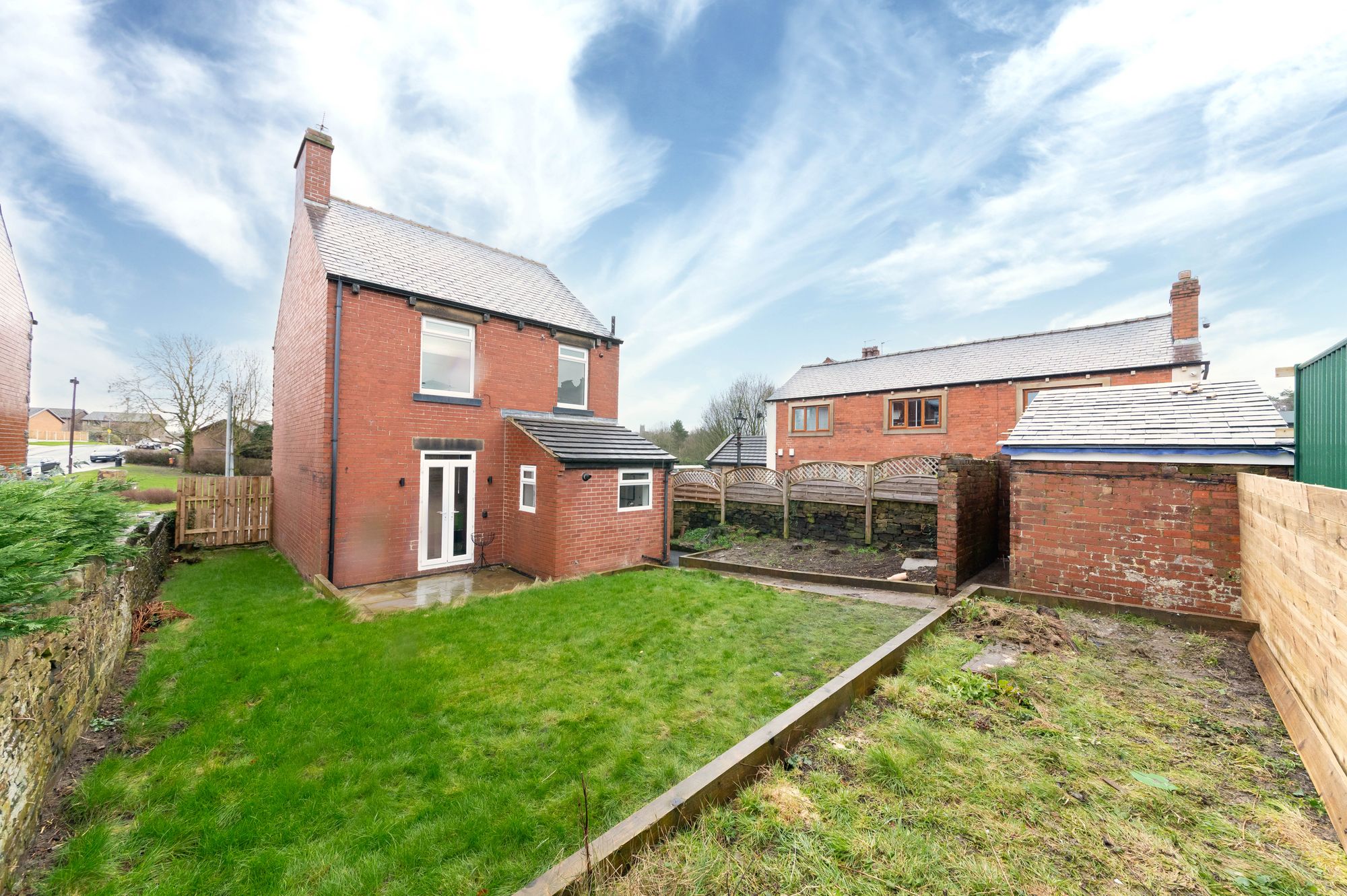 REAR EXTERIORThe rear garden of the property consists of a patio area, a lawn and borders. One of these lawns continues from the other side of the house. At the rear of the garden, there is an outbuilding which is currently being re-roofed.