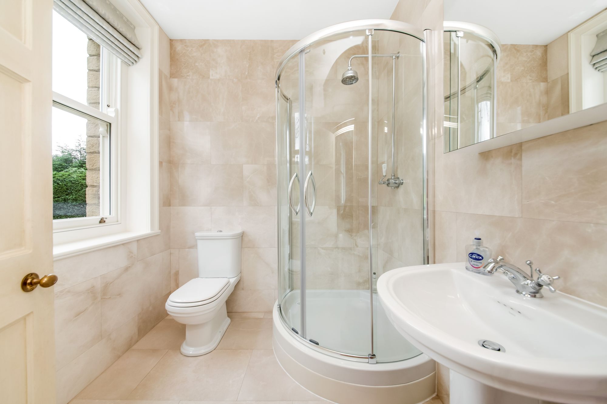 With a large shower cubicle, low-level w.c. and pedestal wash hand basin, the en-suite is finished to a very high standard with travertine tiling to the walls and floor, towel radiator, coving, and inset spotlighting.