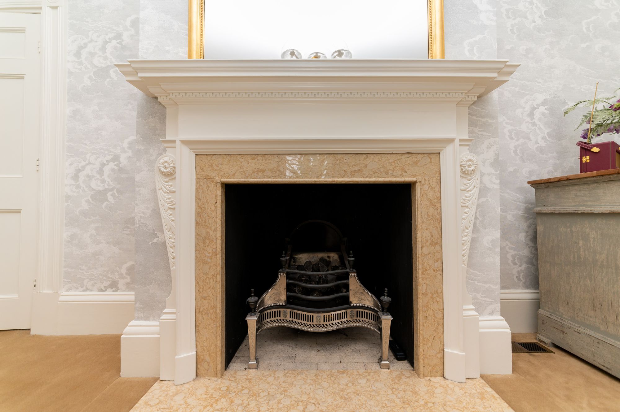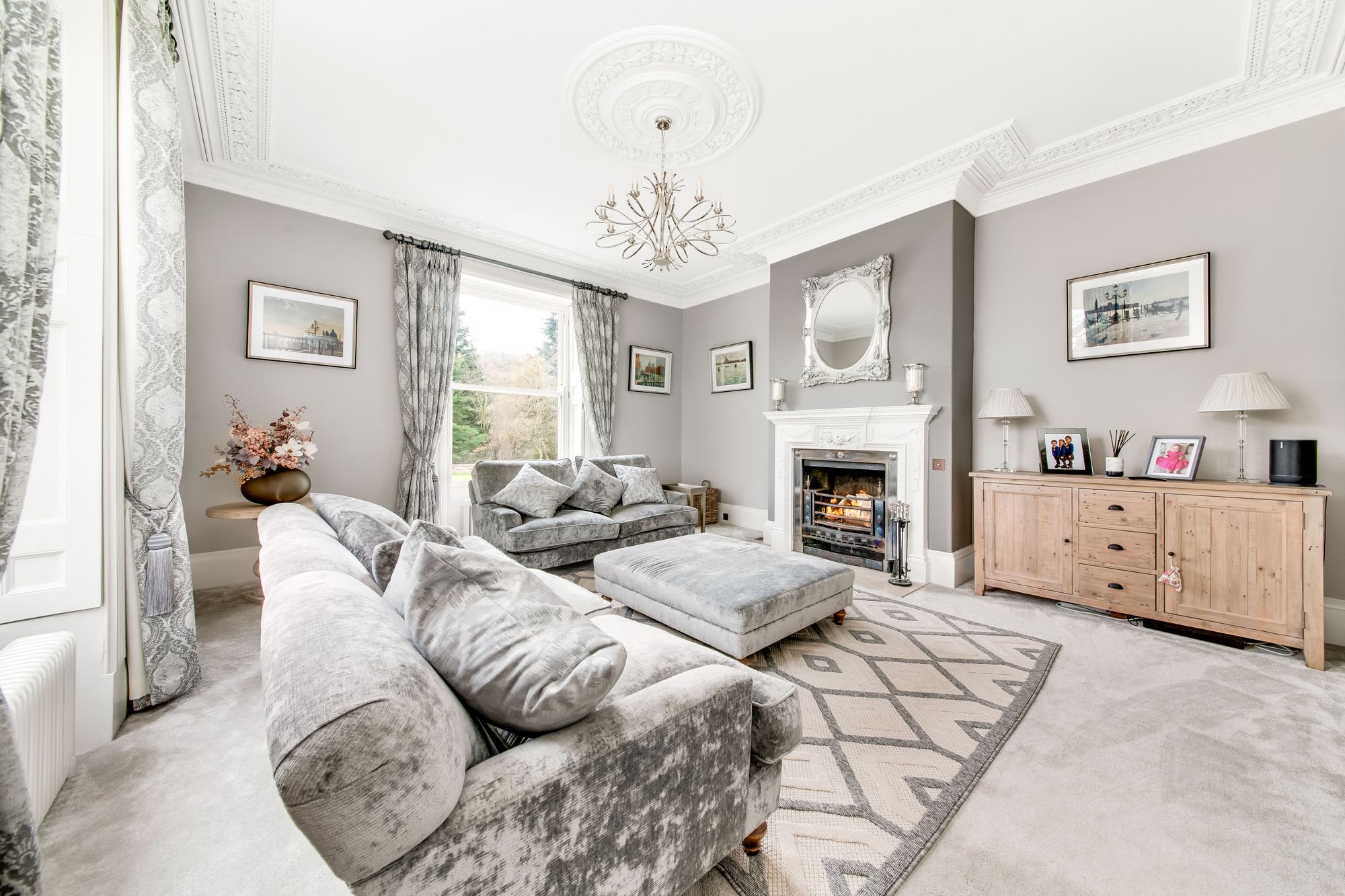 As the photographs indicate, this is a fabulous room. The light and bright room enjoys two large period sash windows with original period shutters that give a fantastic outlook over the property’s gardens and views beyond. The sitting room has a wonderful ceiling rose with chandelier point, decorative coving to the ceiling, and beautiful period style fireplace with outstanding broad open fire grate.