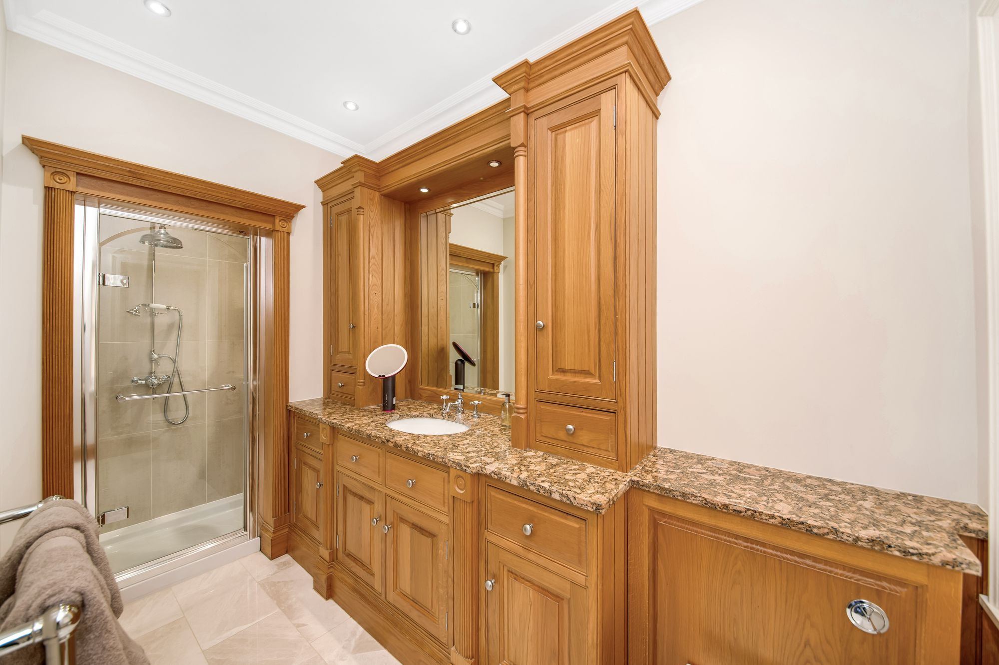Beautifully fitted, the en-suite shower room has been wired for a sound system, has inset spotlighting to the ceiling, ceramic tiled flooring, high-quality inbuilt furniture with granite work surface, and inset wash hand basin. There is a good-sized shower cubicle fitted with a high-quality shower unit, and a concealed cistern w.c.