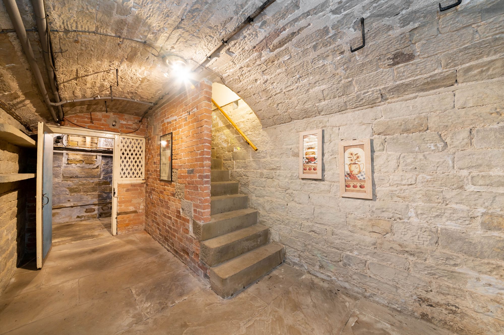 CELLARSFrom the hall beneath the staircase, stone steps lead down to the basement level/cellars. At the bottom of the stone steps is a large hallway with stone vaulted ceiling, stone flagged floor, and exposed stone walling. A doorway gives access through to the games room.