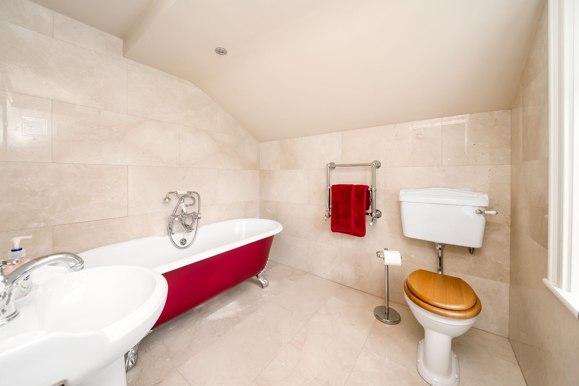 As the photograph suggests, this bathroom is beautifully finished with freestanding ball-and-claw foot bath with Victorian mixer tap unit over. There is a pedestal wash hand basin, and low-level w.c.