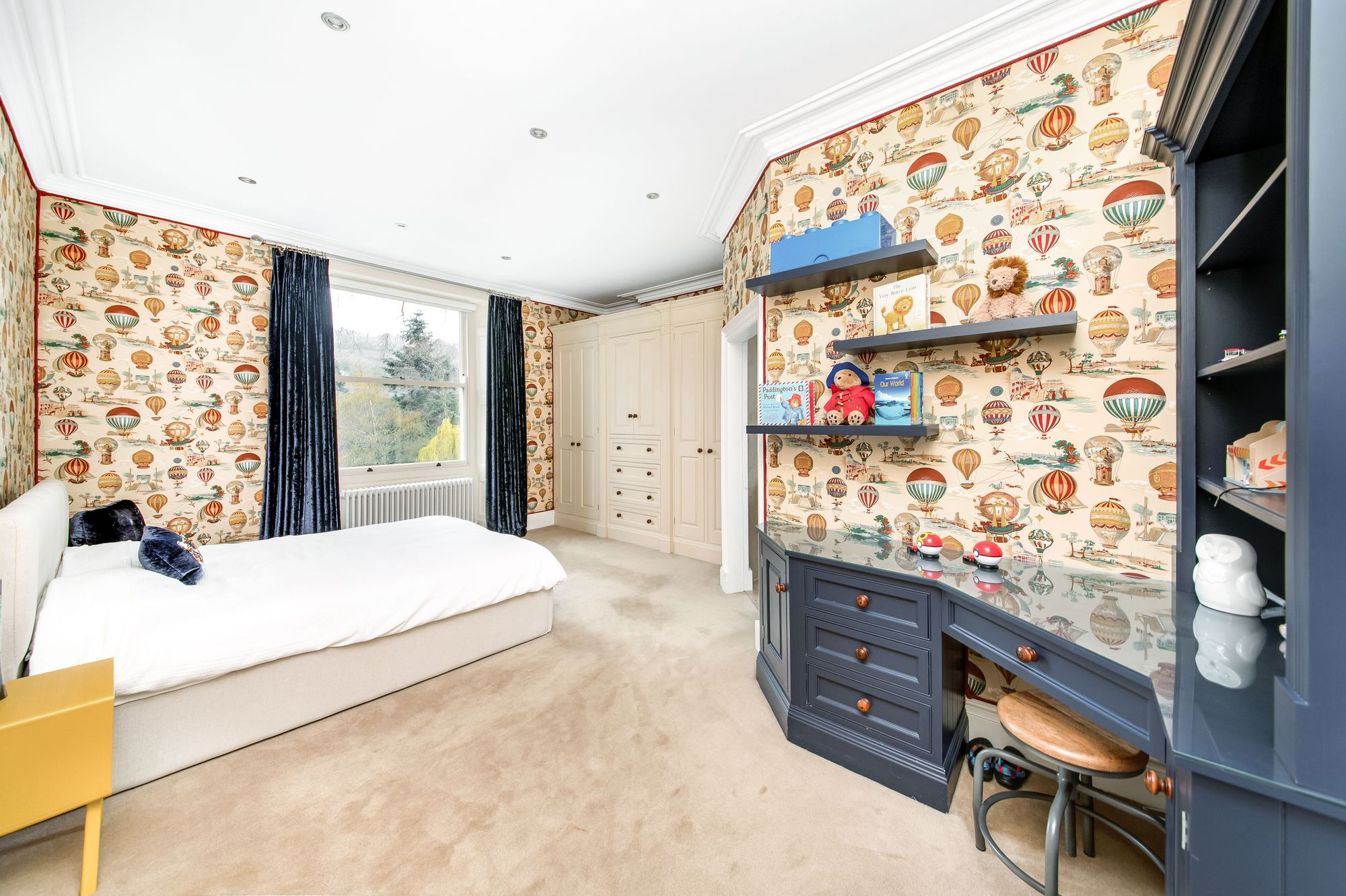 Bedroom six is fitted with library-style book shelving, storage cupboards, and a large desk. There is a window giving an outlook over the gardens, and bedroom six is served by its own en-suite.