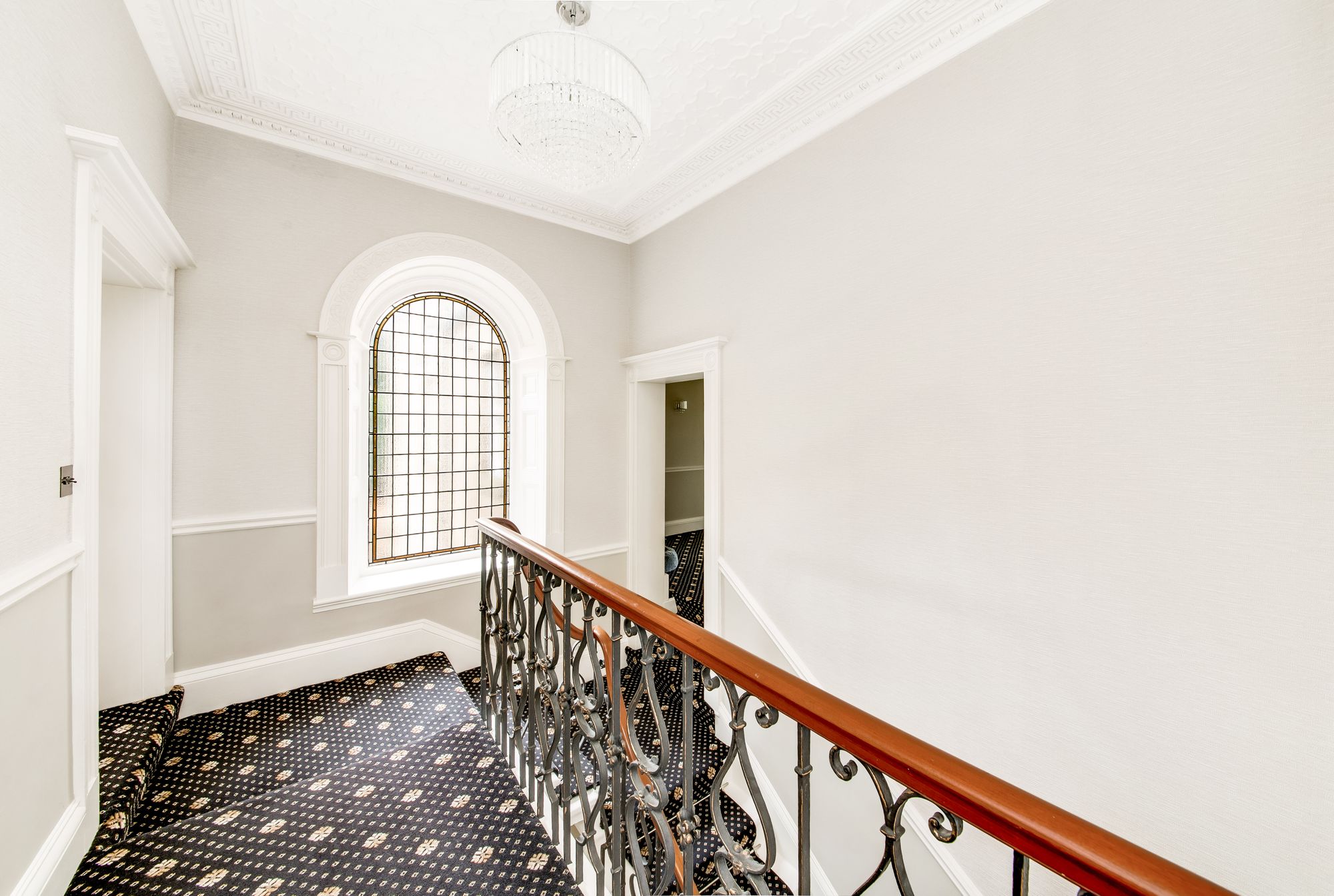 STAIRCASE TO FIRST FLOOR LANDINGFrom within the hallway the beautiful staircase, as previously described, rises to the half landing which in some part is a gallery down to the entrance hall and has the feature arch-topped window. The staircase then further rises to the first-floor landing