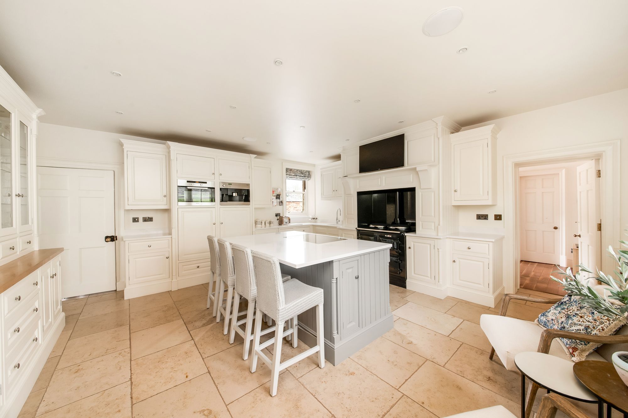 As the photographs demonstrate, the kitchen has been wonderfully fitted and is a fine feature of the home. Having windows to both the front and rear, there is inset spotlighting to the ceiling. The room has underfloor heating beneath the high-quality flooring. The kitchen is fitted with the highest quality wall cupboard and base units with a beautiful central island that continues to create a fantastic breakfasting area. The island is fitted with a Miele hob and a Bosch stainless steel and glazed oven beneath. There is a Miele coffee machine and a combination microwave/oven. The kitchen also features a beautiful black Aga with the usual chrome-topped hot plans and a three-oven design. There is an inset one-and-a-half bowl sink unit with Qooker tap over, integrated dishwasher, and integrated fridge freezer.