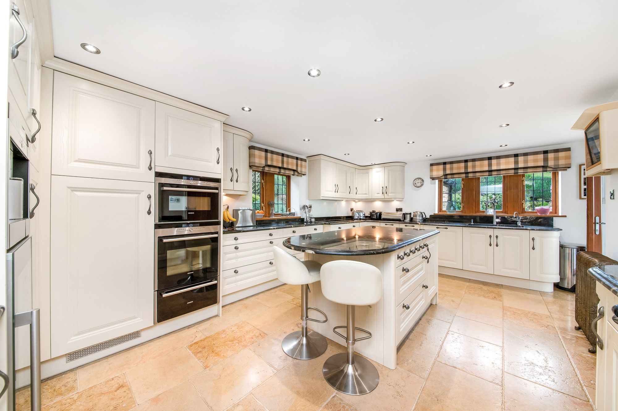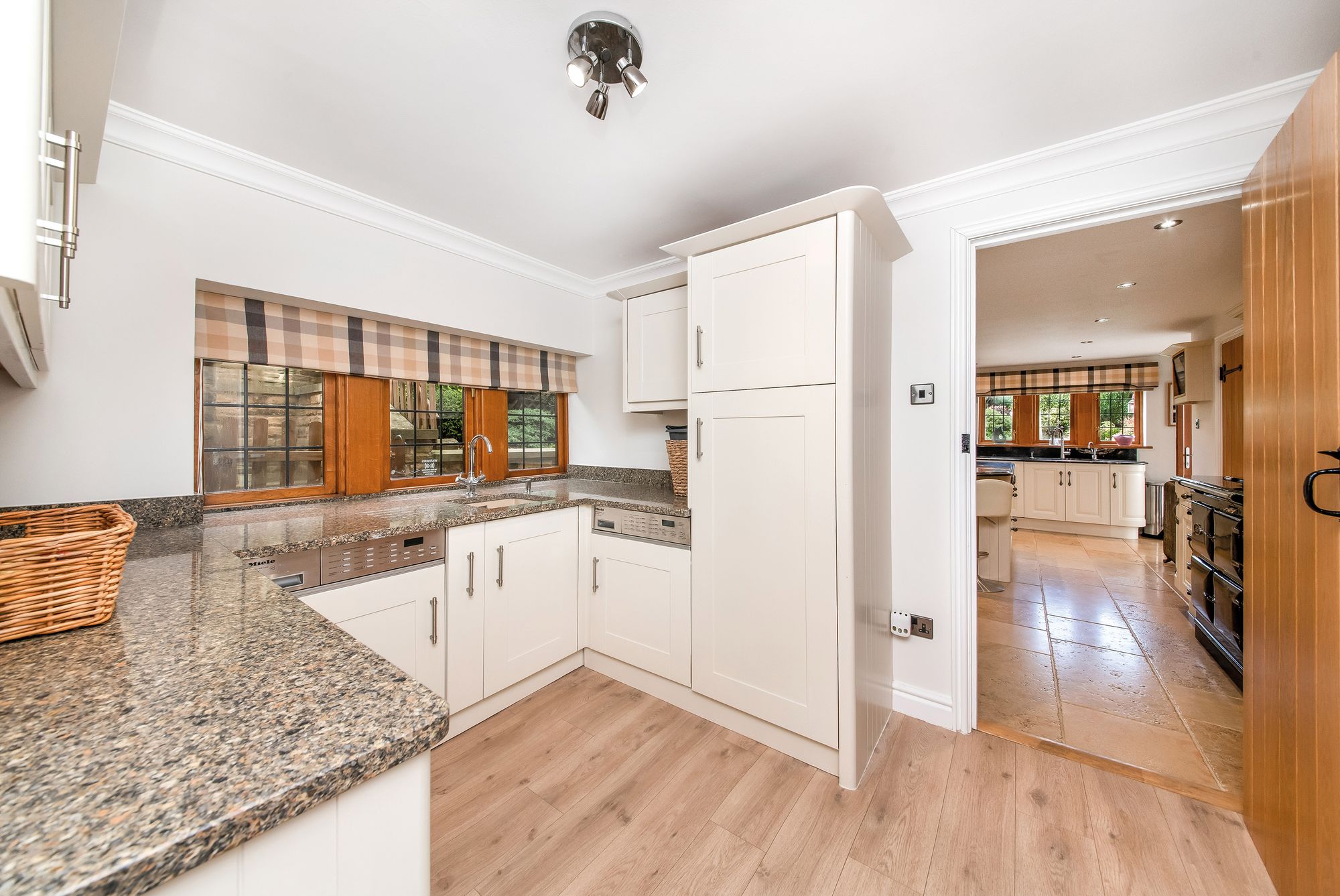 BREAKFAST KITCHENThe breakfast kitchen is a beautifully appointed room. It has limestone flooring, period-style central heating radiator, inset spotlighting to the ceiling, mullioned windows giving views to the gardens in two directions. There is a wealth of ivory bespoke units at high and low level, black granite surfaces throughout, with a substantial central island unit which has seating at the breakfast bar to one end. The room has a full range of Siemens appliances, including an induction 4 ring hob with extractor above, double main oven, microwave combination oven, warming drawer, integrated dishwasher, integrated coffee machine, integrated fridge and wine cooler. There is a black, electric, 3 oven AGA with 2 hot plates with AIMS control technology. The splashback is a very attractive mosaic tiled feature with a delightful, fitted surround. Twin Blanco sinks, a Grohe mixer tap, a boiler/water filter tap, an integrated soap dispenser and integrated trash bins.