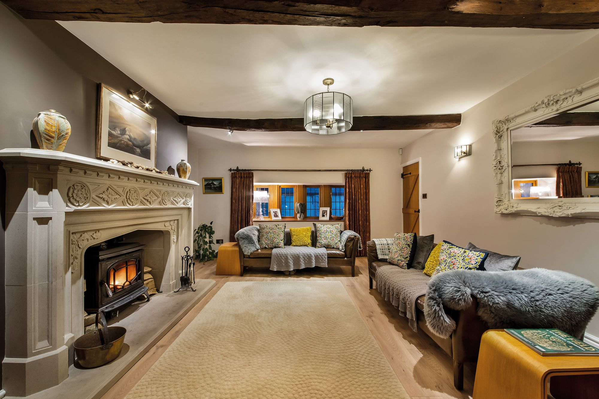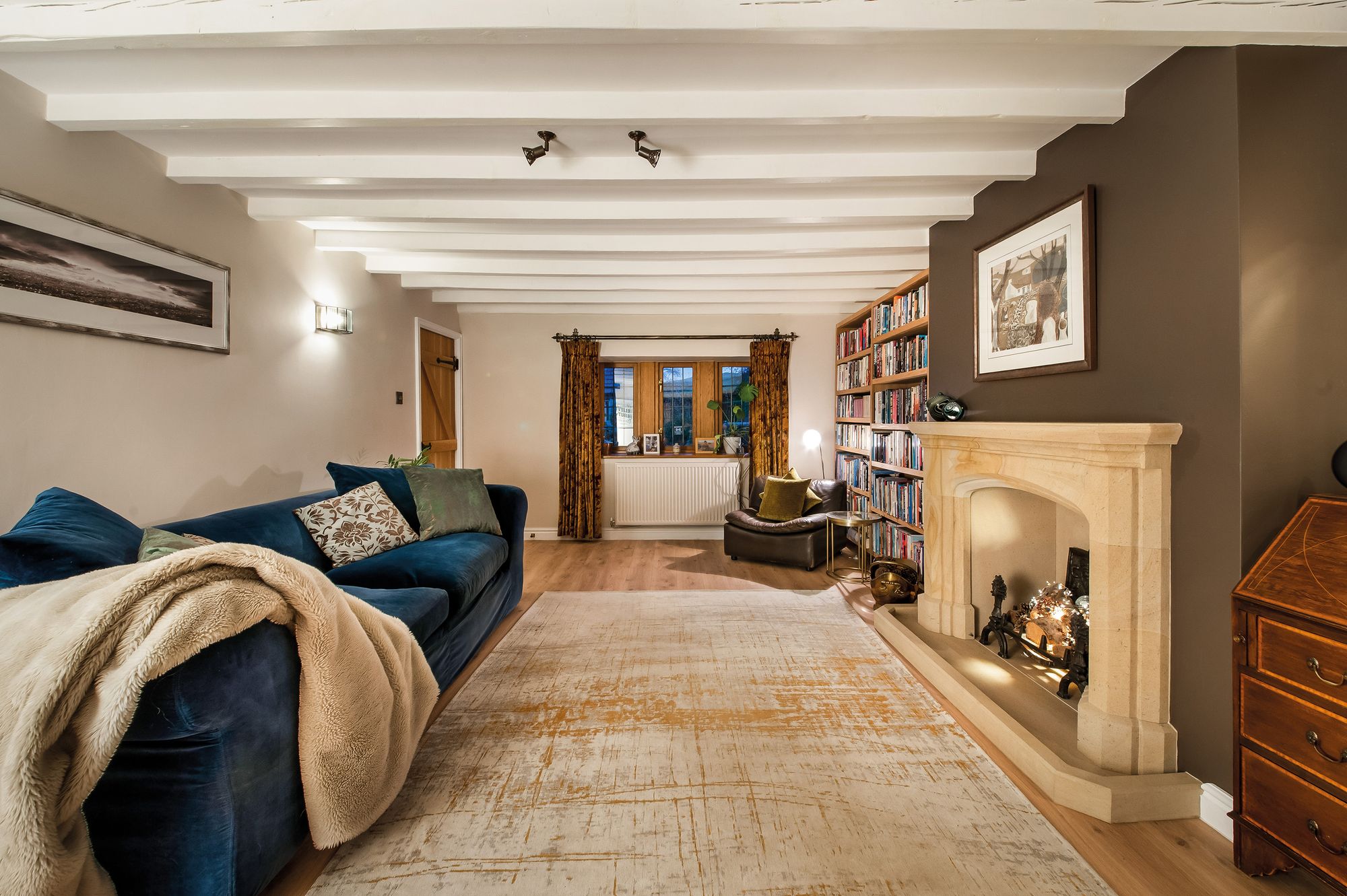 SNUGA delightful room, with mullioned windows to two sides, one bank of which gives a lovely view out over the property’s front courtyard and gardens, the other bank gives a view into the garden room/orangery. The room has beams to the ceiling, broad chimney breast with a beautifully carved, bespoke, stone fireplace. with raised hearth and attractive, light flooring. It has two wall light points, a picture light point and ceiling spot lights with two hand-carved steps leading up to the breakfast kitchen.