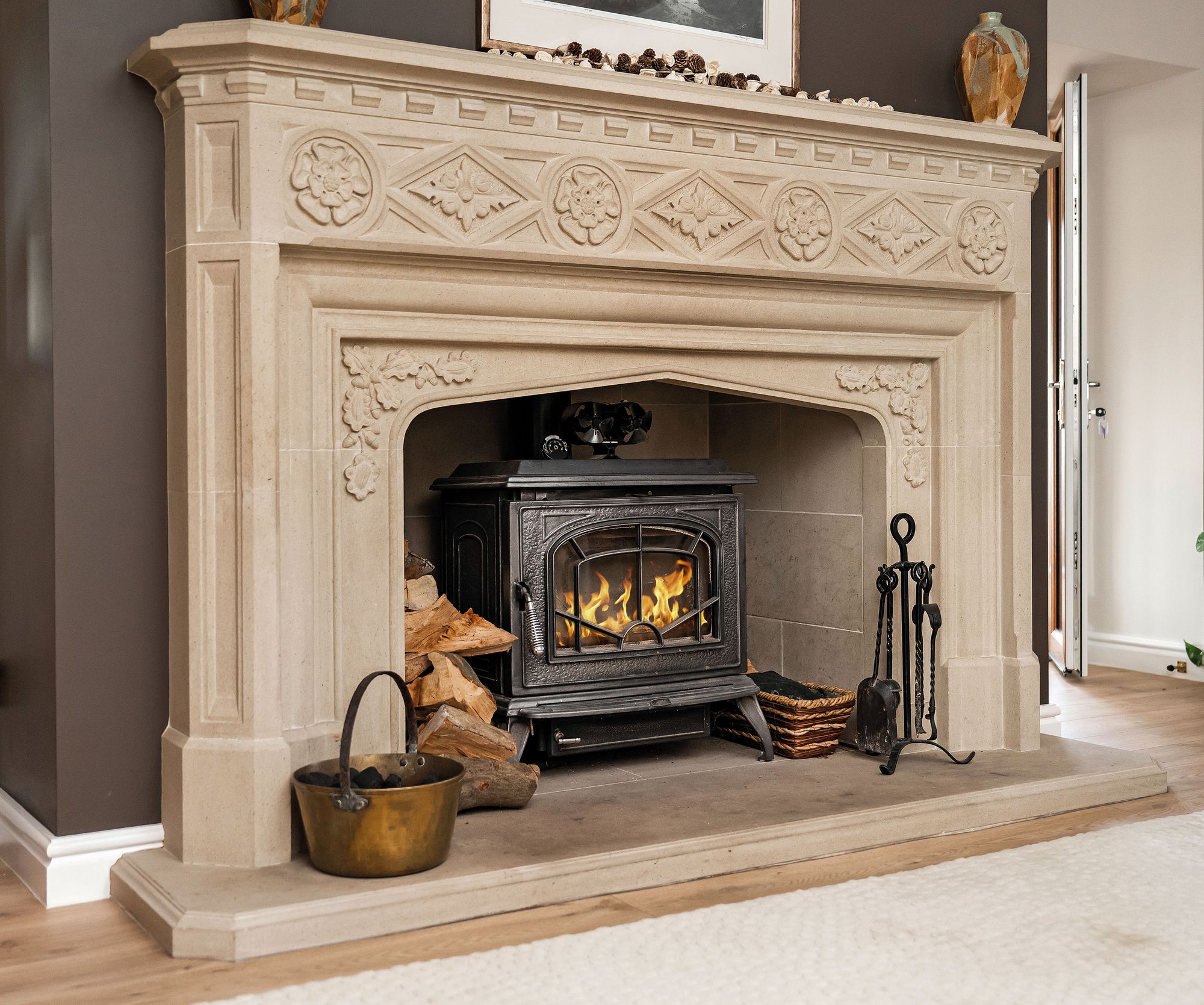 SITTING ROOMThe hallway leads through to the sitting room – a magnificent room which enjoys a huge amount of natural light, courtesy of two banks of mullioned windows and double glass doors to three sides, giving views out over the front courtyard, gardens and – via the conservatory – superb long-distance views down the valley. It has a quite exceptional carved stone fireplace. This imposing, bespoke feature displays carved acorns, oak leaves and Yorkshire roses. It has a raised hearth with a fabulous cast iron AGA Berrington multifuel stove within. Exposed ceiling beams, chandelier point, spotlighting, two wall light points, TV point, attractive light flooring and tasteful décor.