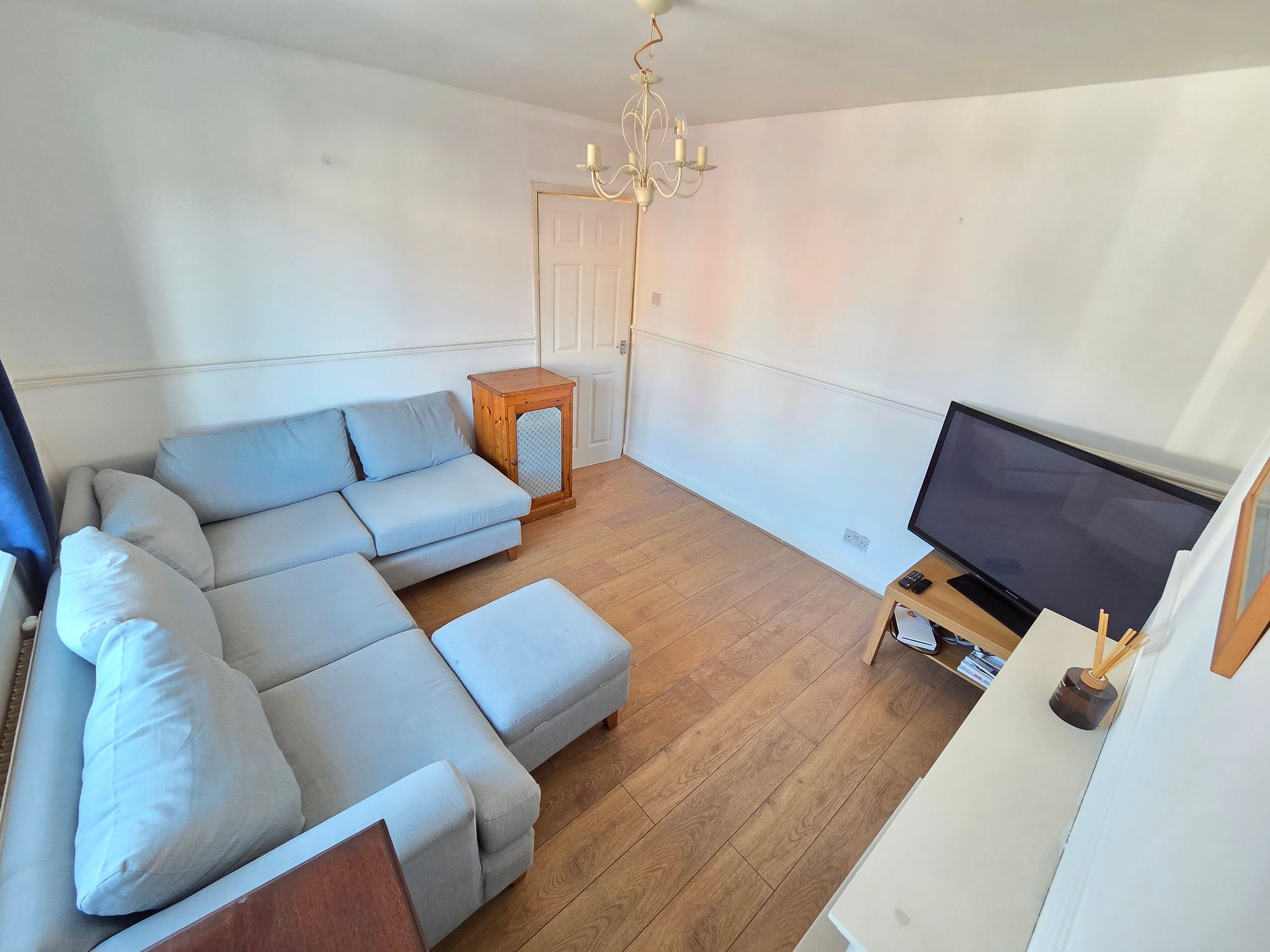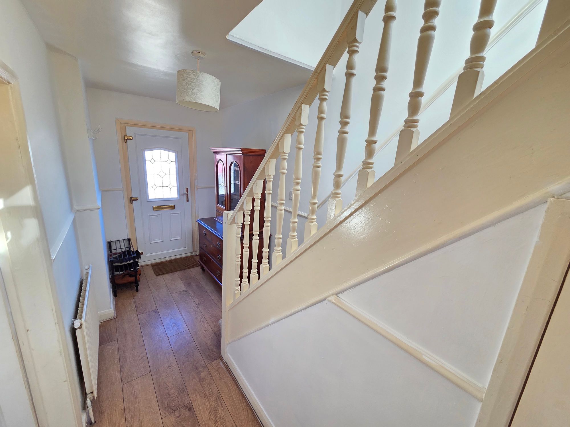 Entrance is gained via a uPVC door with inset opaque glass panel into the entrance hall with ceiling light, dado rail, central heating radiator, wood effect laminate flooring, understairs storage and staircase rising to first floor landing. From here we gain entrance to the following rooms.
