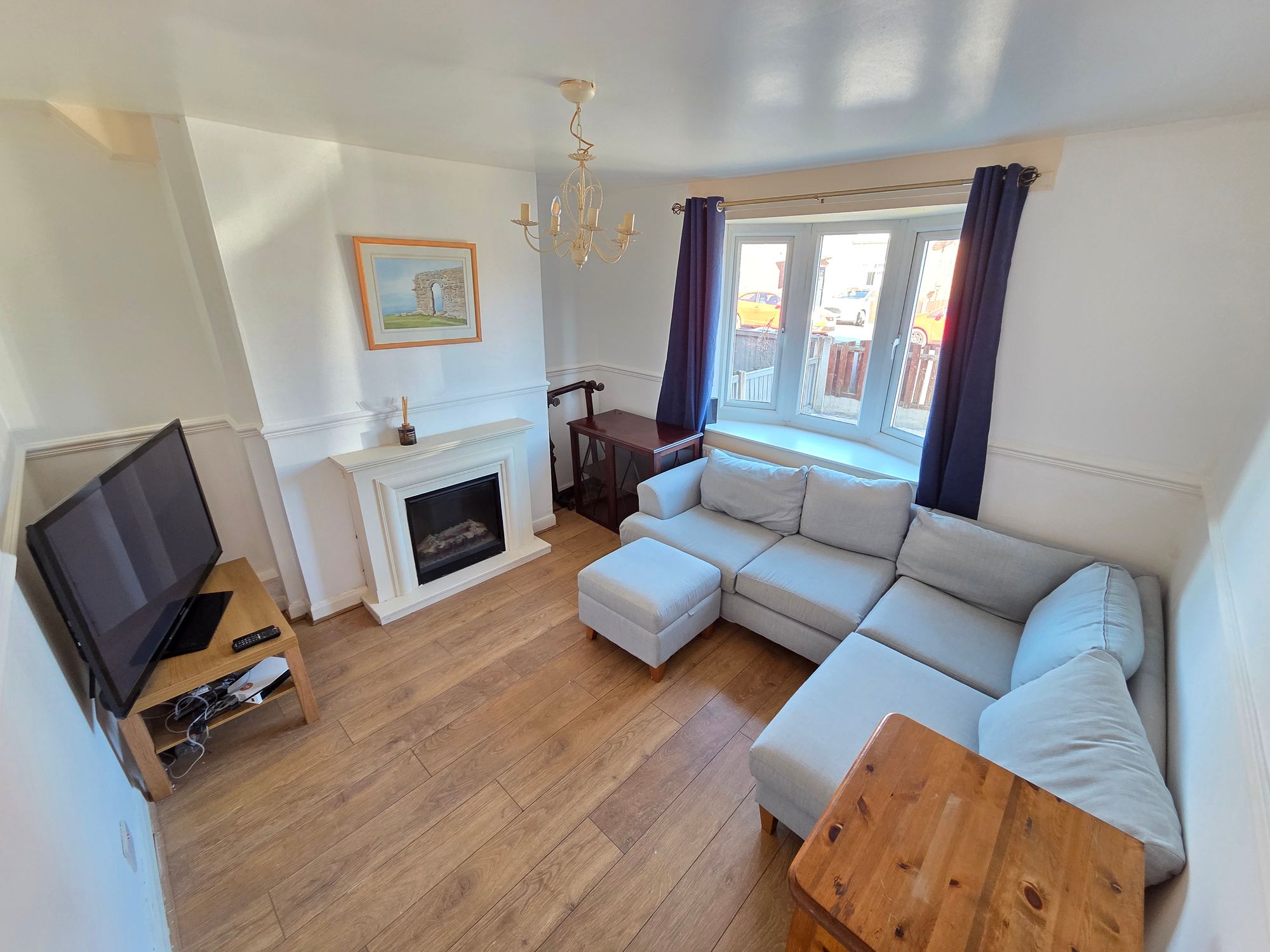 LIVING ROOMA well-proportioned room with the main focal point being an electric log effect fire with wooden surround mantelpiece and hearth. There is a ceiling light, dado rail, central heating radiator, wood effect laminate flooring and uPVC double glazed bay window to the front.