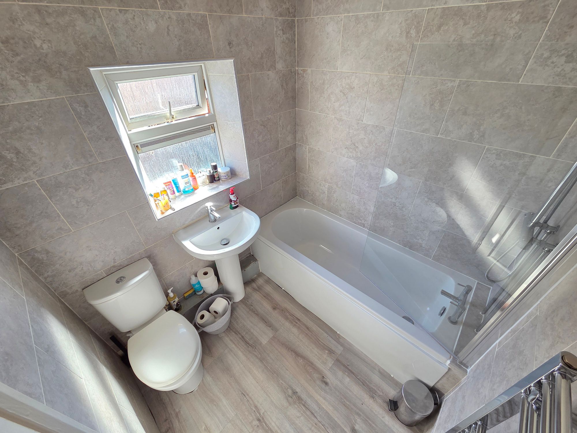BATHROOMComprising of a three-piece white sanitary ware in the form of low flush W.C, pedestal hand basin with chrome mixer tap over, bath with chrome mixer tap over and a mains fed shower with rain effect shower within with separate handheld attachment and glazed shower screen. The room has a ceiling light, fully tiling to walls, chrome towel rail / radiator and obscure uPVC double glazed window.