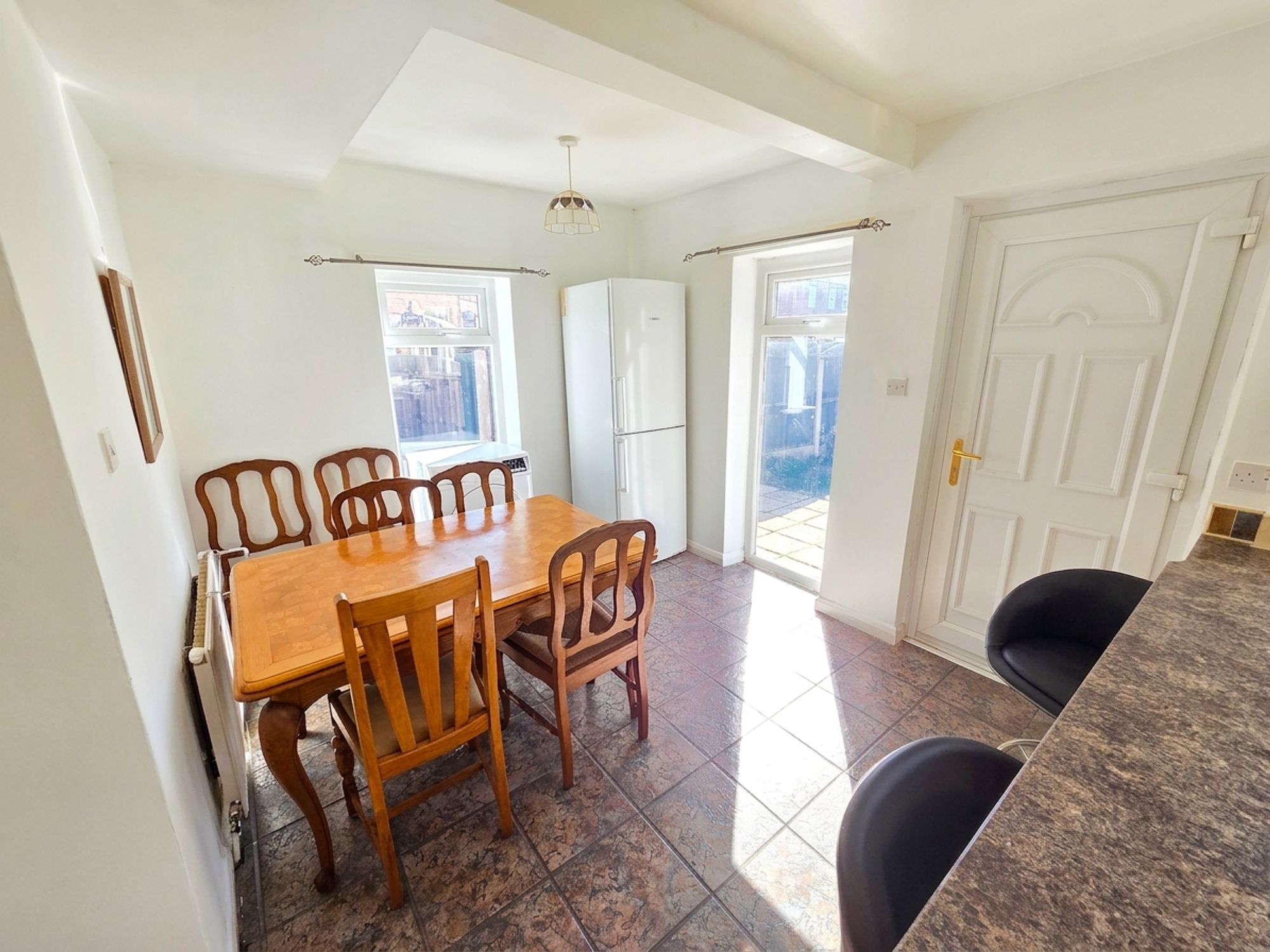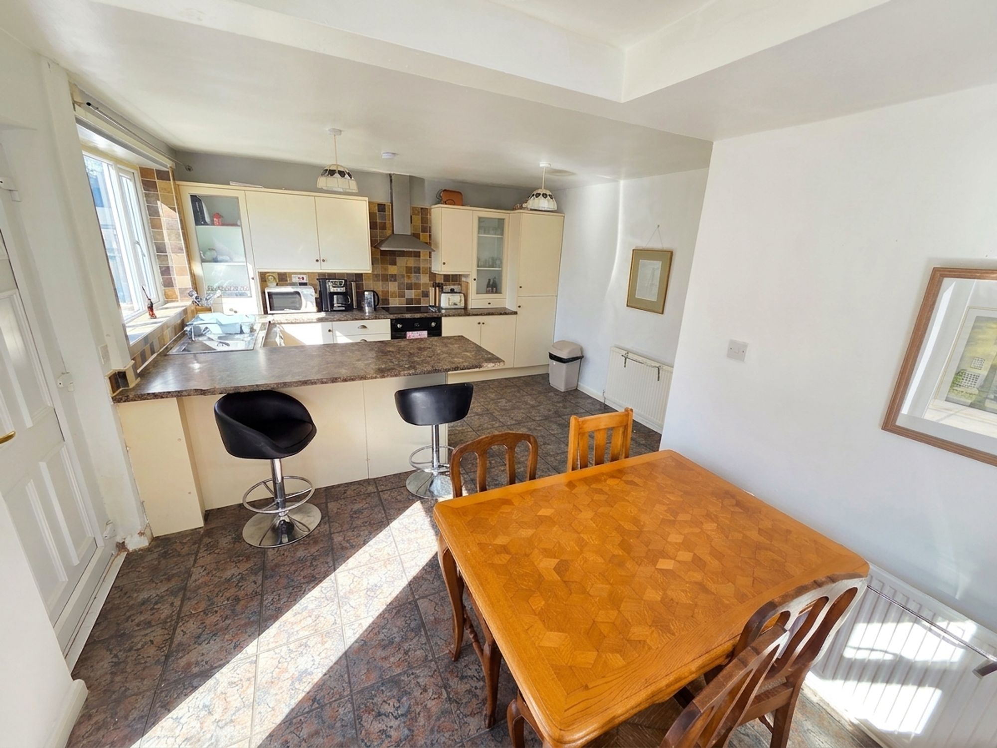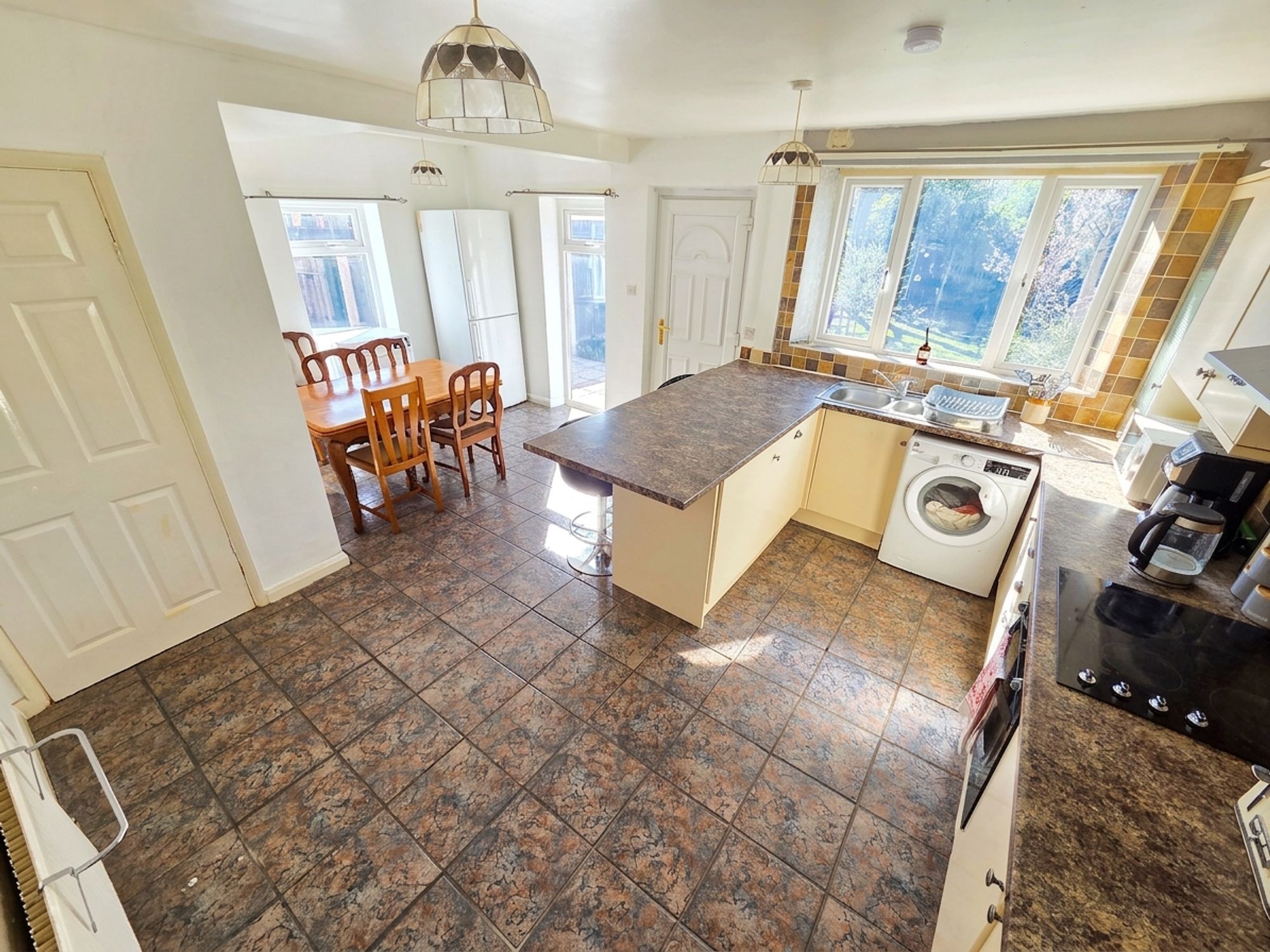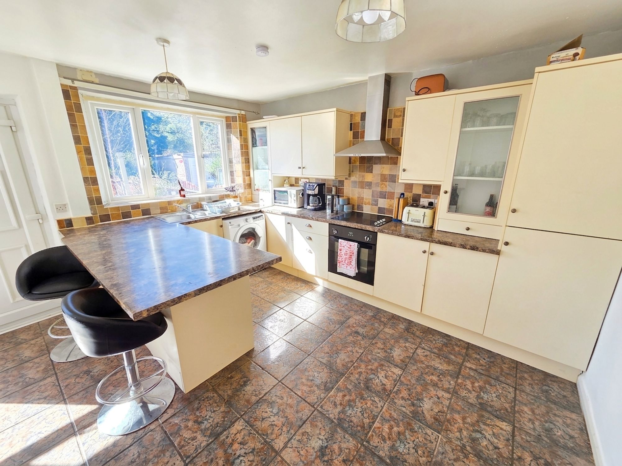 KITCHENThe kitchen itself has a range of wall and base units with contrasting marble effect laminate worktops over with tiled splashback. There is a integrated dishwasher, plumbing for a washing machine, one and a half bowl stainless steel sink with chrome mixer tap over, four ring electric hob with integrated electric oven with stainless steel chimney style extractor fan over. The room has a breakfast bar seating area, ceiling light, tiled flooring, two central heating radiators, three sets of uPVC double glazed windows on dual aspect and a uPVC door leading to the rear of the property.