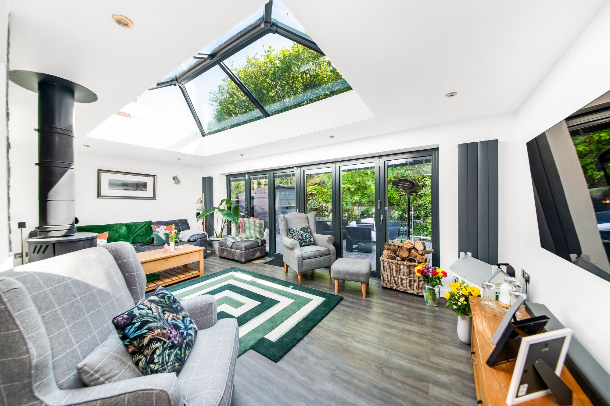 This fabulously proportioned space enjoys a great deal of natural light courtesy of a bank of windows to the front elevation, a double-glazed external stable style door to the side elevation, and two fabulous openings which provide seamless access to the garden room. The dining area and living area both feature ceiling light points, decorative coving, vertical anthracite column radiators, and high-quality flooring.