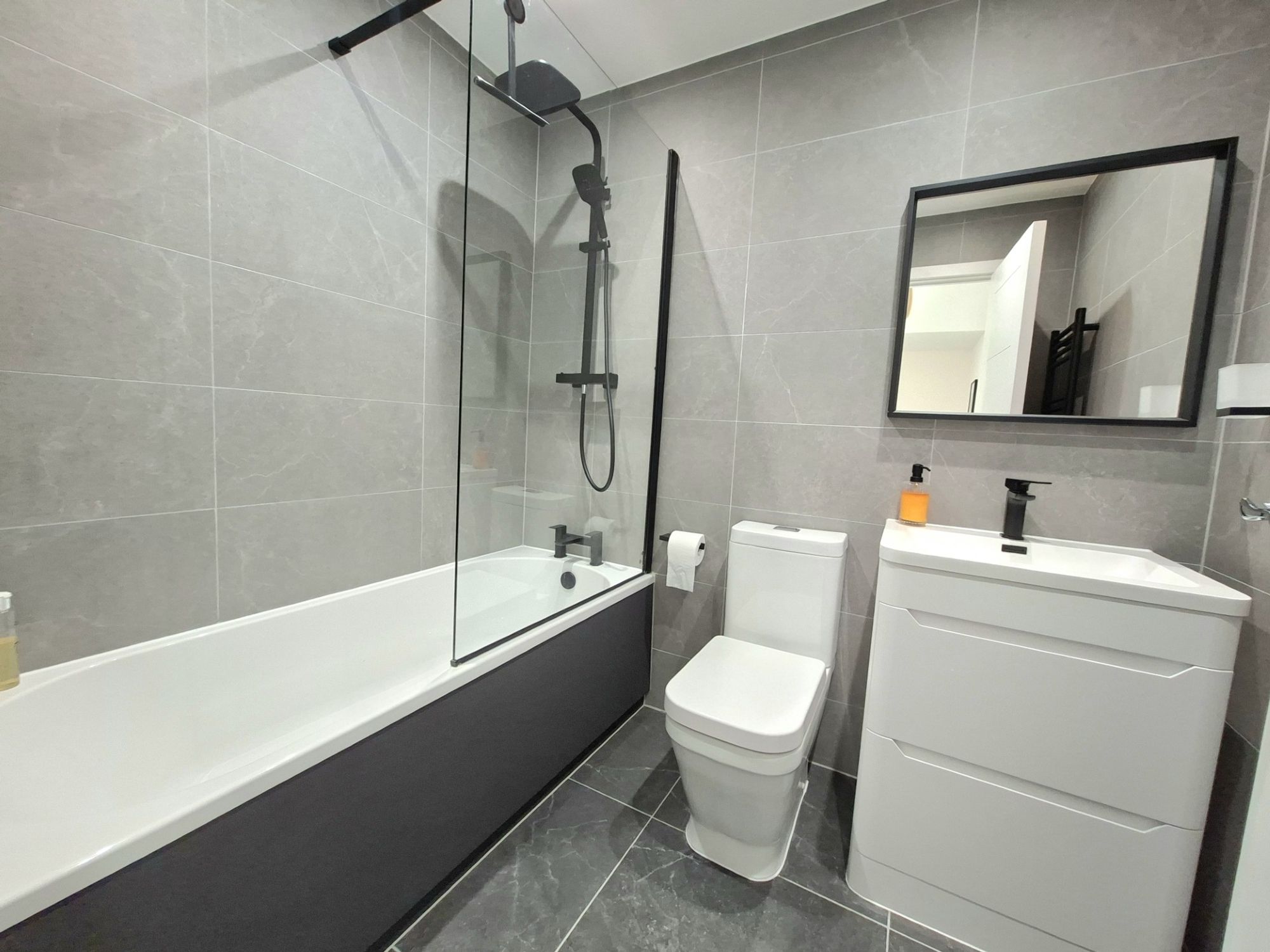 FAMILY BATHROOMThe family bathroom is very modern in design with floor to ceiling tiled walls and a shower over the bath with glass shower screen.