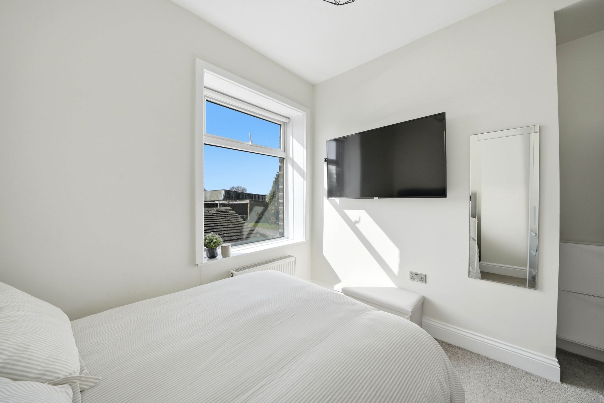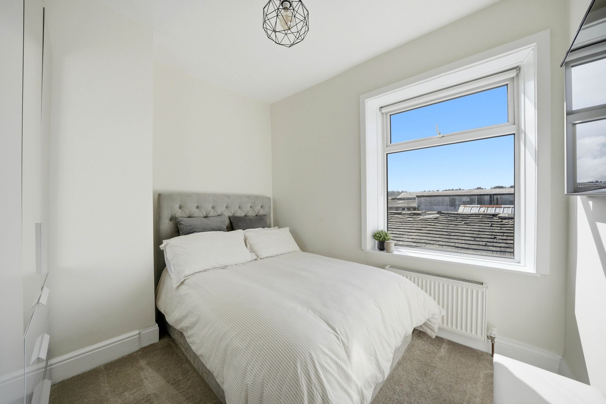 A double room with ceiling light point, central heating radiator, uPVC double glazed window and chimney breast.