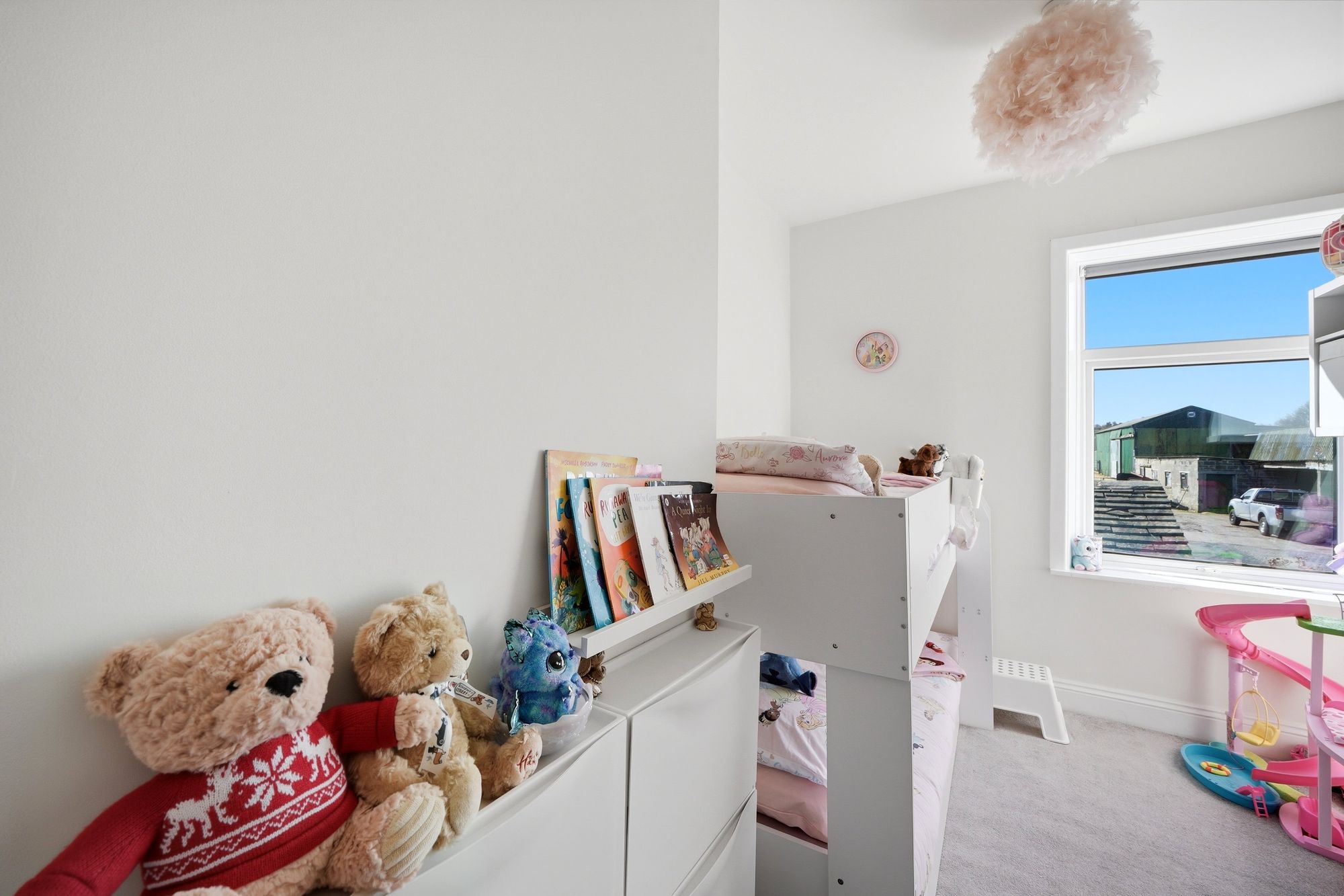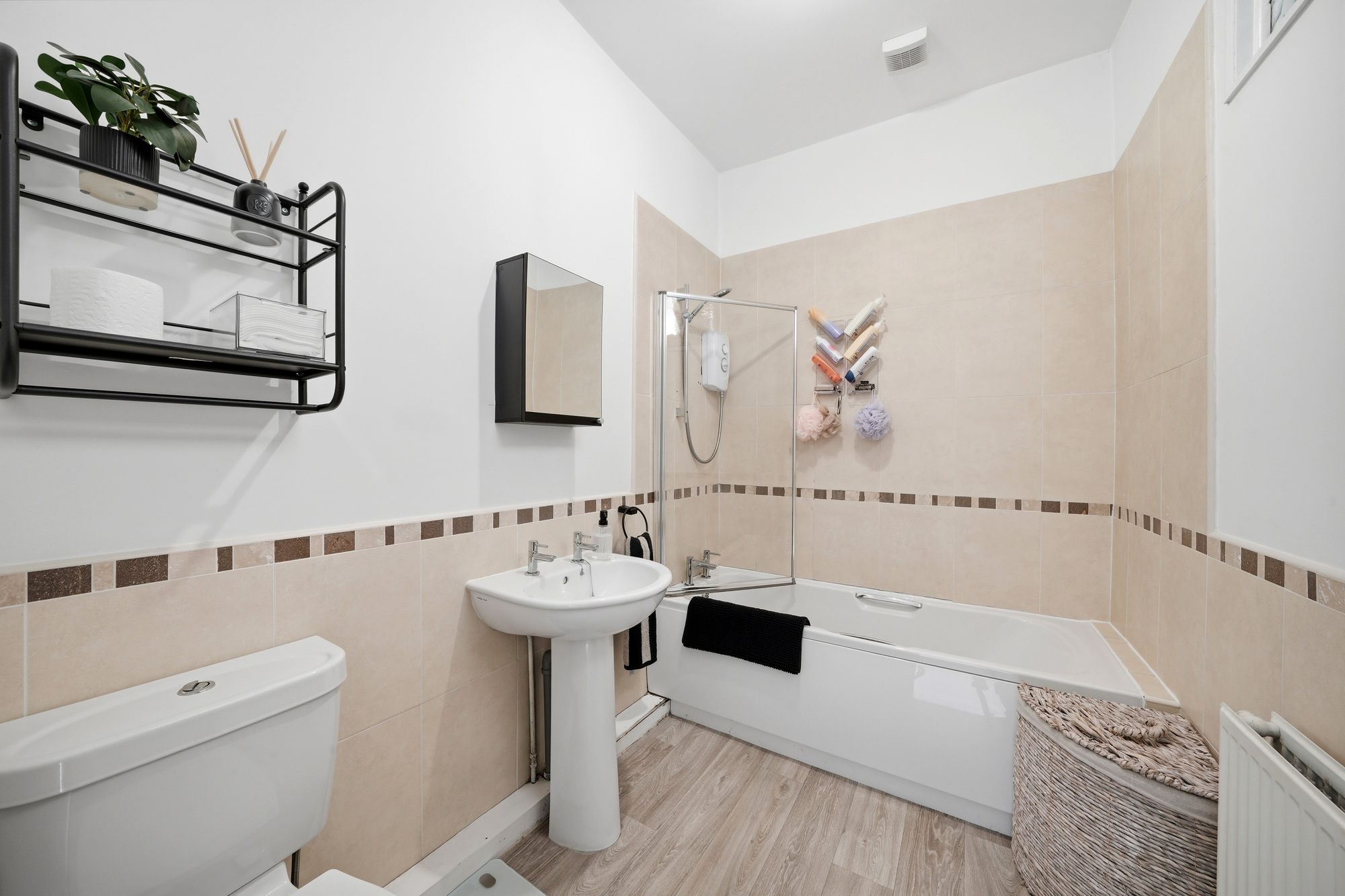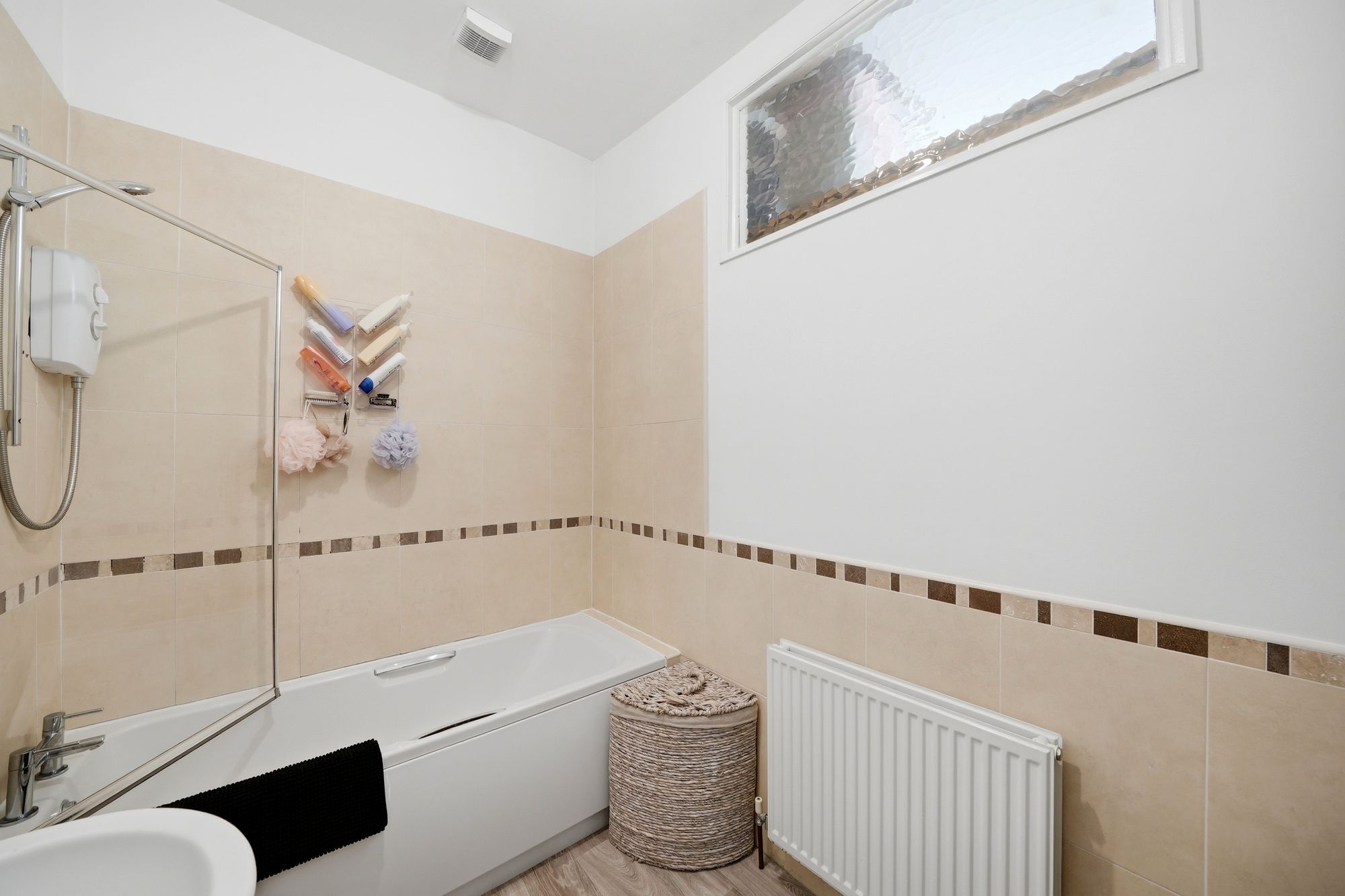 With ceiling light point, extractor fan, there is borrowed light from a high-level frosted timber and glazed window from bedroom one. There are part tiled walls and fitted with a suite comprising panelled bath with glazed shower screen and Triton electric shower fitting over, pedestal wash basin and low flush w.c.