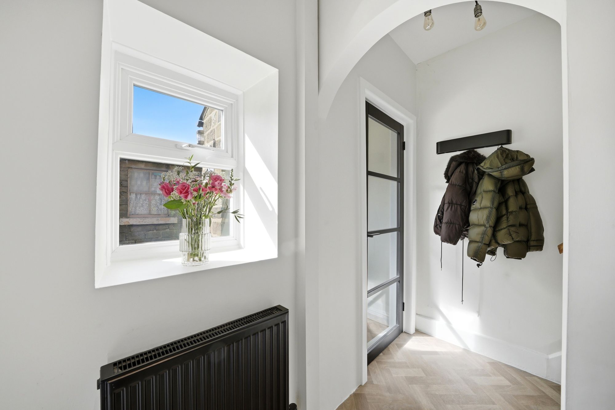 With a composite panelled and sealed unit double glazed door with integrated blind, there is a uPVC double glazed window, ceiling light point and herringbone wood effect flooring. From the porch a timber and multi pane glazed door opens into an entrance lobby.