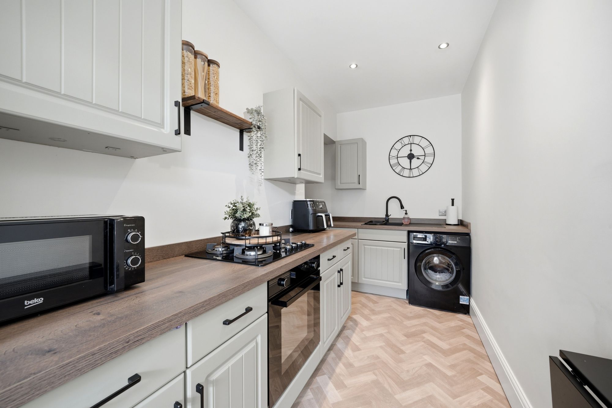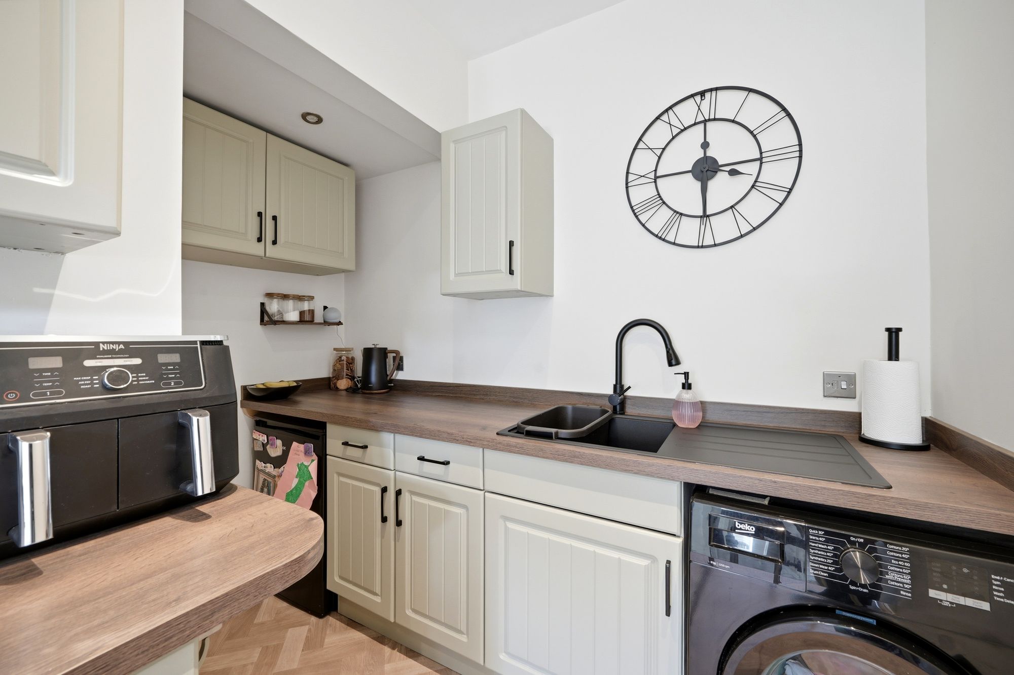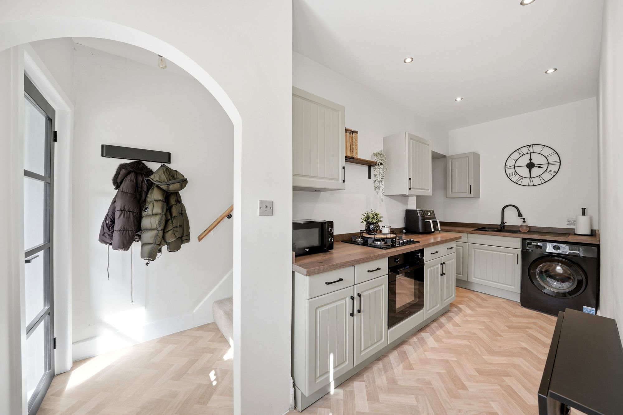 With a uPVC double glazed window, inset LED downlighters, central heating radiator, herringbone wood effect flooring and fitted with a good range of Farrow and Ball ‘Vert De Terre’ painted base and wall cupboards and drawers these are complimented by contrasting overlying timber effect worktops with matching splashbacks, there is an inset single drainer sink with monobloc tap, black four ring gas hob with black electric fan assisted oven beneath, under counter space for fridge, under counter space for washing machine, wall hung folding breakfast table and beneath the staircase there are twin timber panelled doors giving access to the basement.