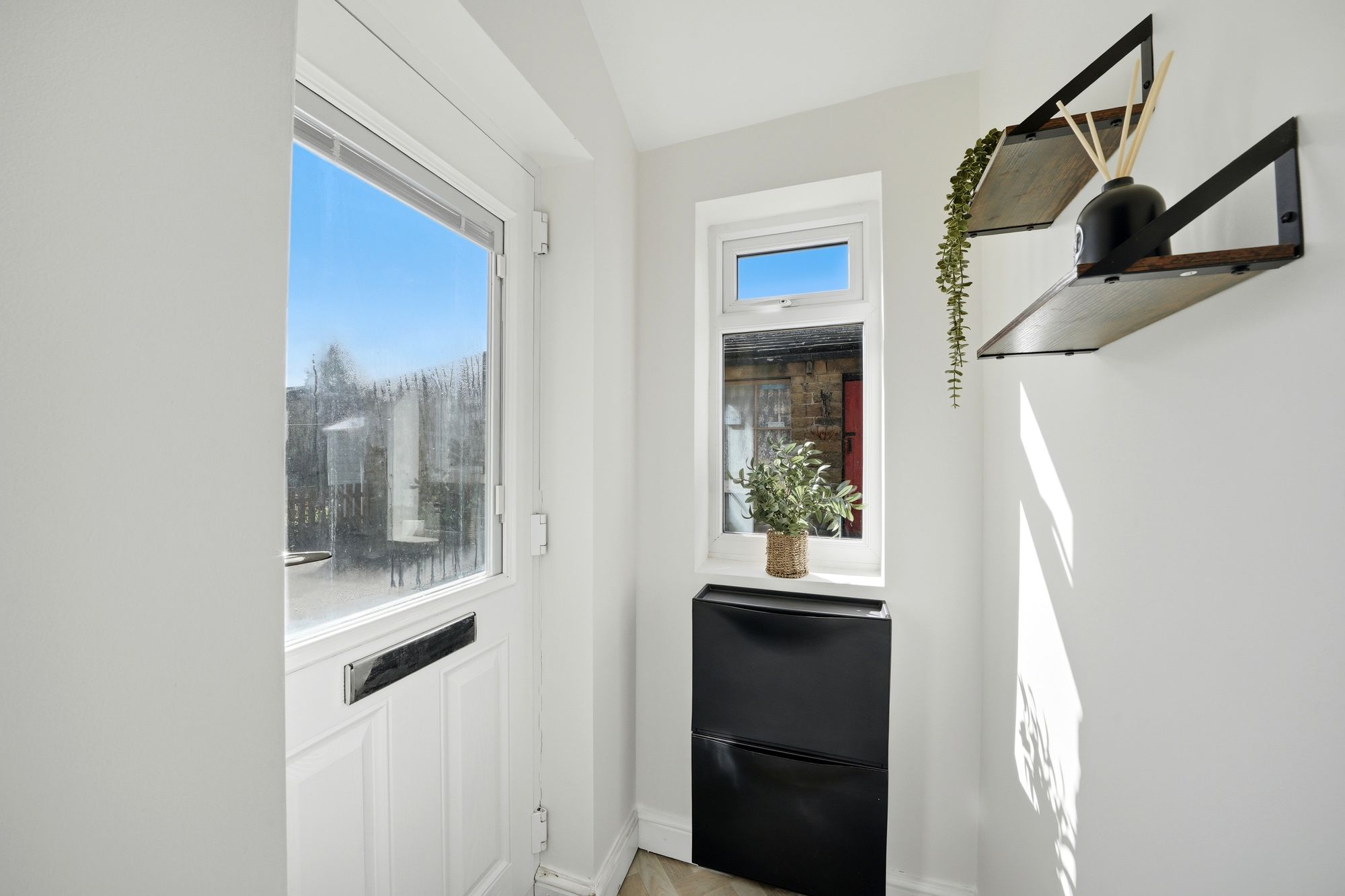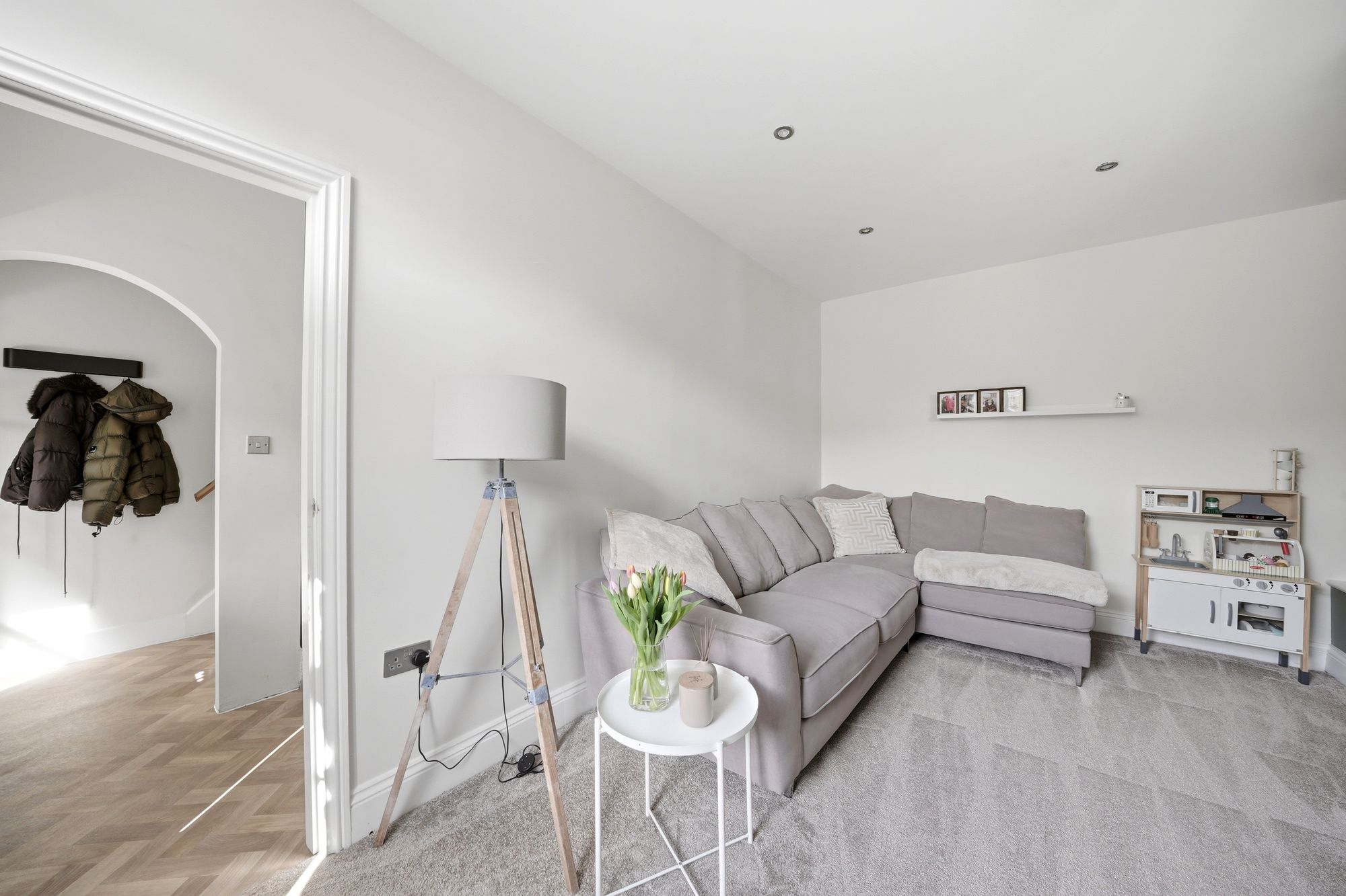 This comfortable reception room has a large uPVC double glazed window which provides plenty of natural light, inset LED downlighters, central heating radiator and with Farrow and Ball painted walls in ‘pointing’ and a wall of colour to the chimney breast and to either side in Farrow and Ball ‘Lichen’.