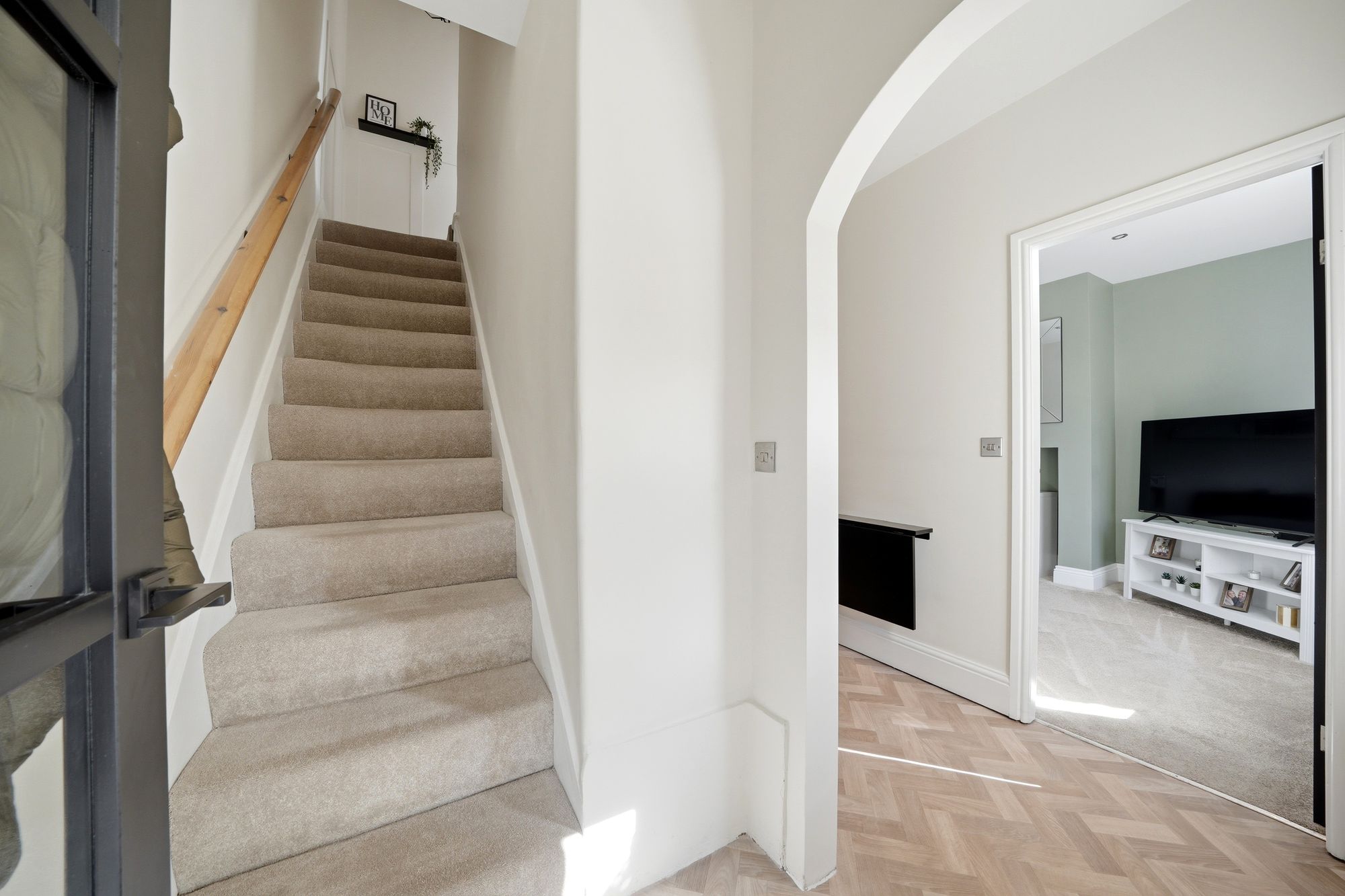 With herringbone wood effect flooring which continues through into the kitchen. There is a ceiling light point and staircase rising to the first floor.