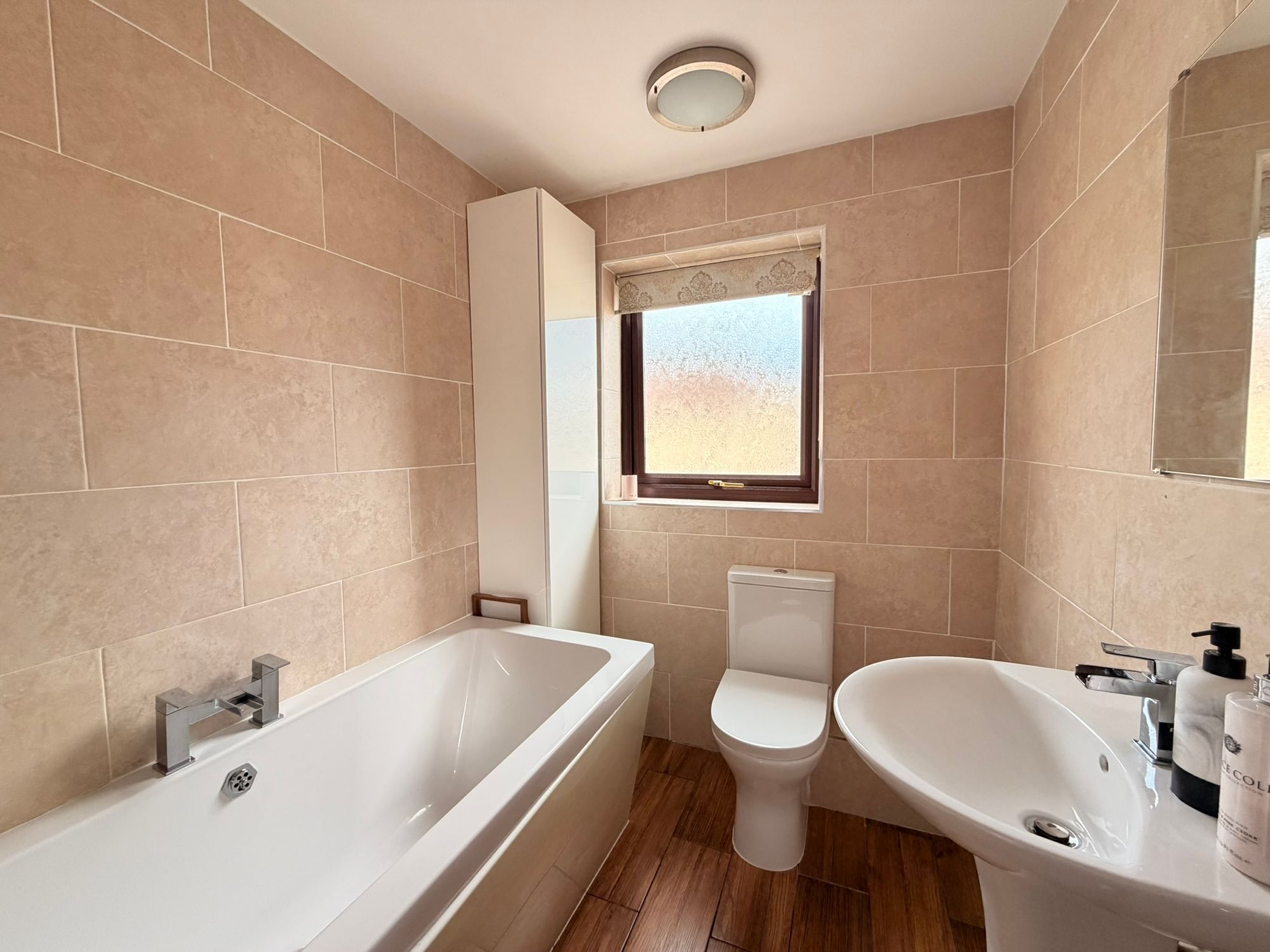 BATHROOMComprising a three white piece suite, including a close-coupled WC, pedestal basin with chrome mixer taps, and a bath with a chrome mains-fed shower and shower attachment, fitted with a foldable glass shower screen. The bathroom features tiled walls and flooring, a ceiling light, a chrome heated towel rail/central heating radiator, and an obscure uPVC double-glazed window to the front.