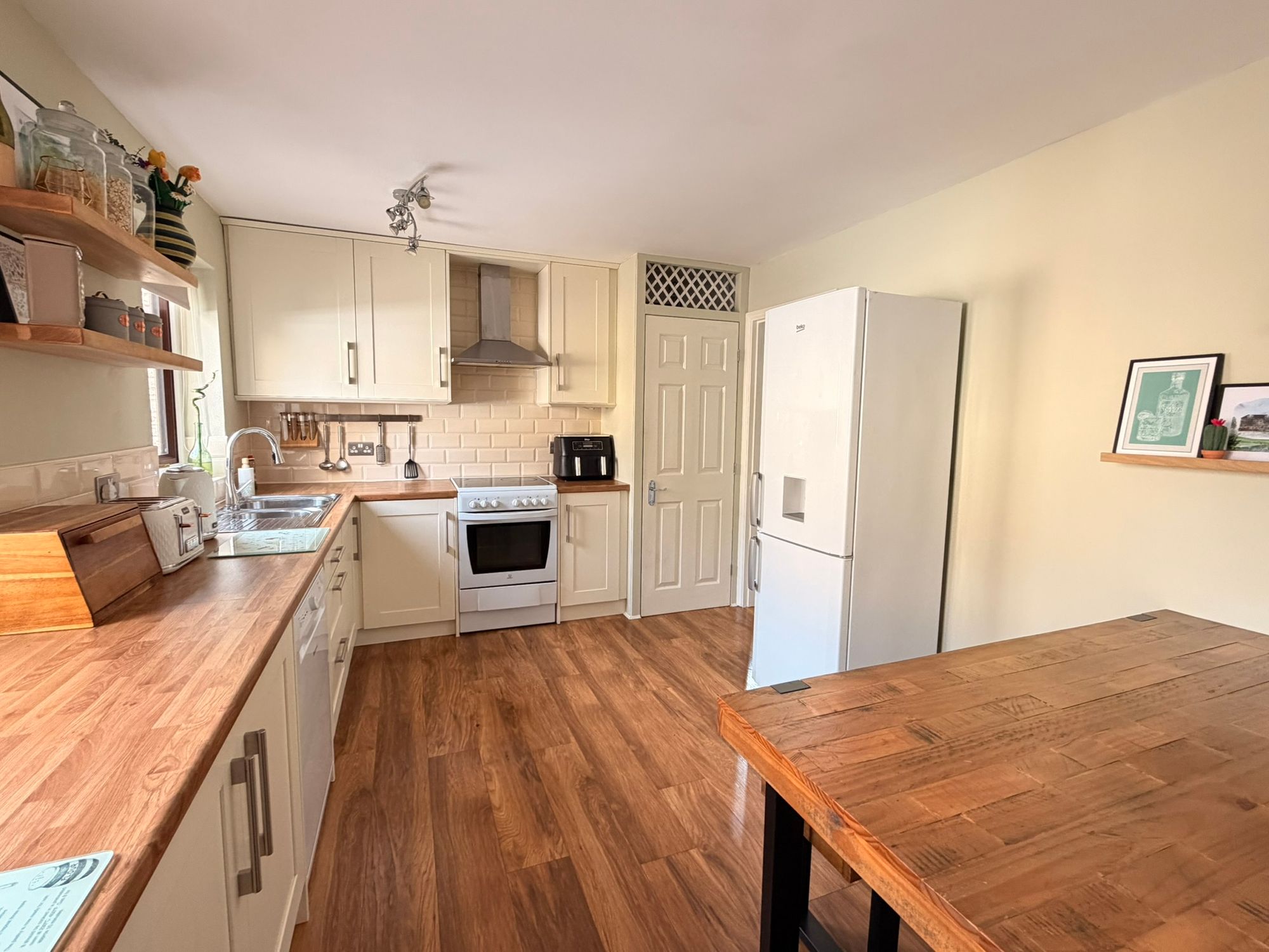 DINING KITCHENFully renovated and upgraded by the current vendor, the kitchen is fitted with a range of white wood shaker-style wall and base units complemented by contrasting laminate worktops and tiled splashbacks. There is a stainless steel sink with chrome mixer tap, space for a cooker with extractor fan over, plumbing and space for a dishwasher, and further space for a freestanding fridge freezer. The room offers ample space for a dining table and chairs if so desired and also benefits from an airing cupboard providing useful storage and housing the property’s boiler. Finishing touches include wood-effect laminate flooring and ceiling light points. Natural light is provided via two uPVC wood-effect double-glazed windows to the front elevation, one of which is a bay window, enjoying pleasant views and providing an abundance of natural light throughout.