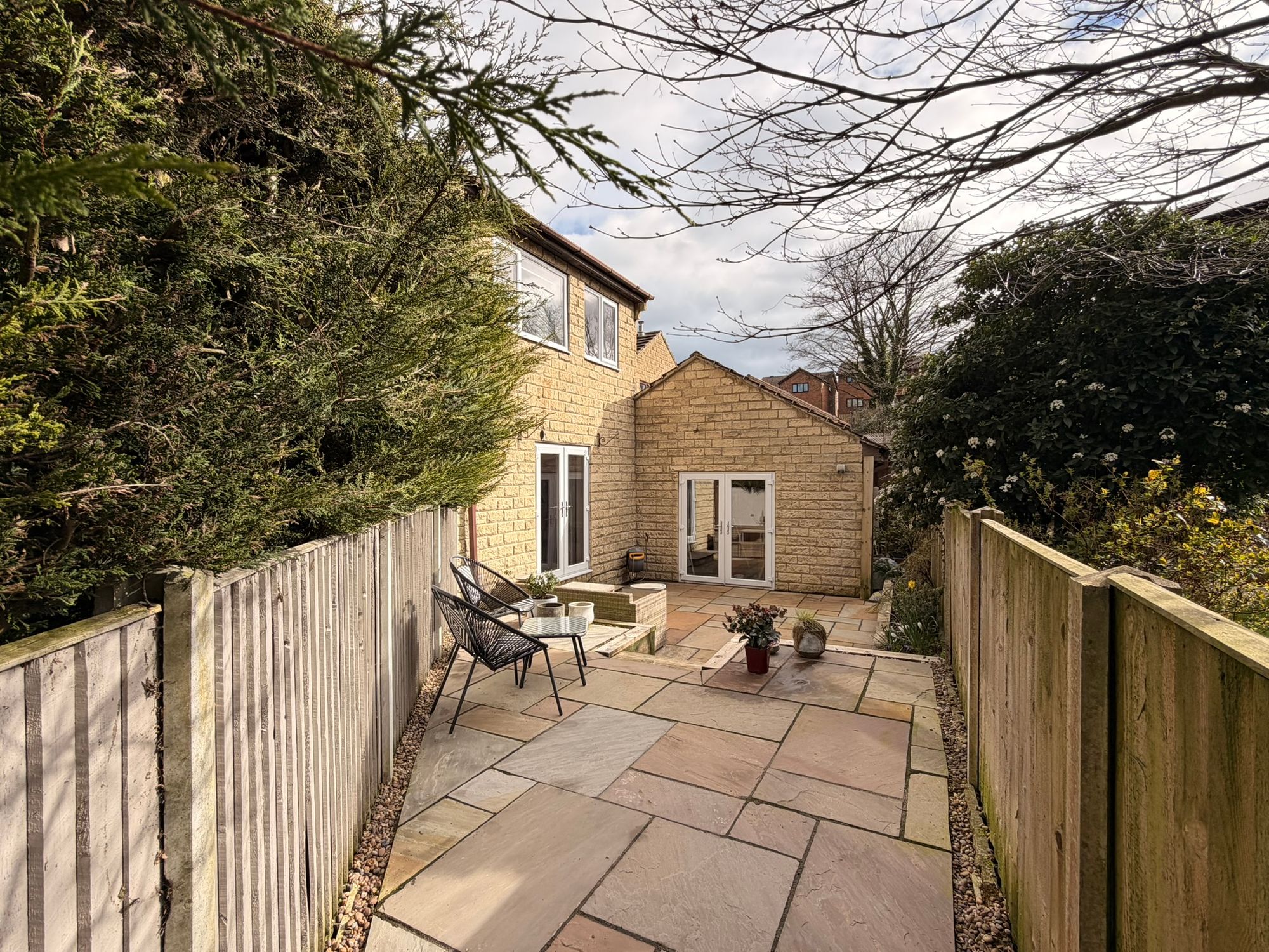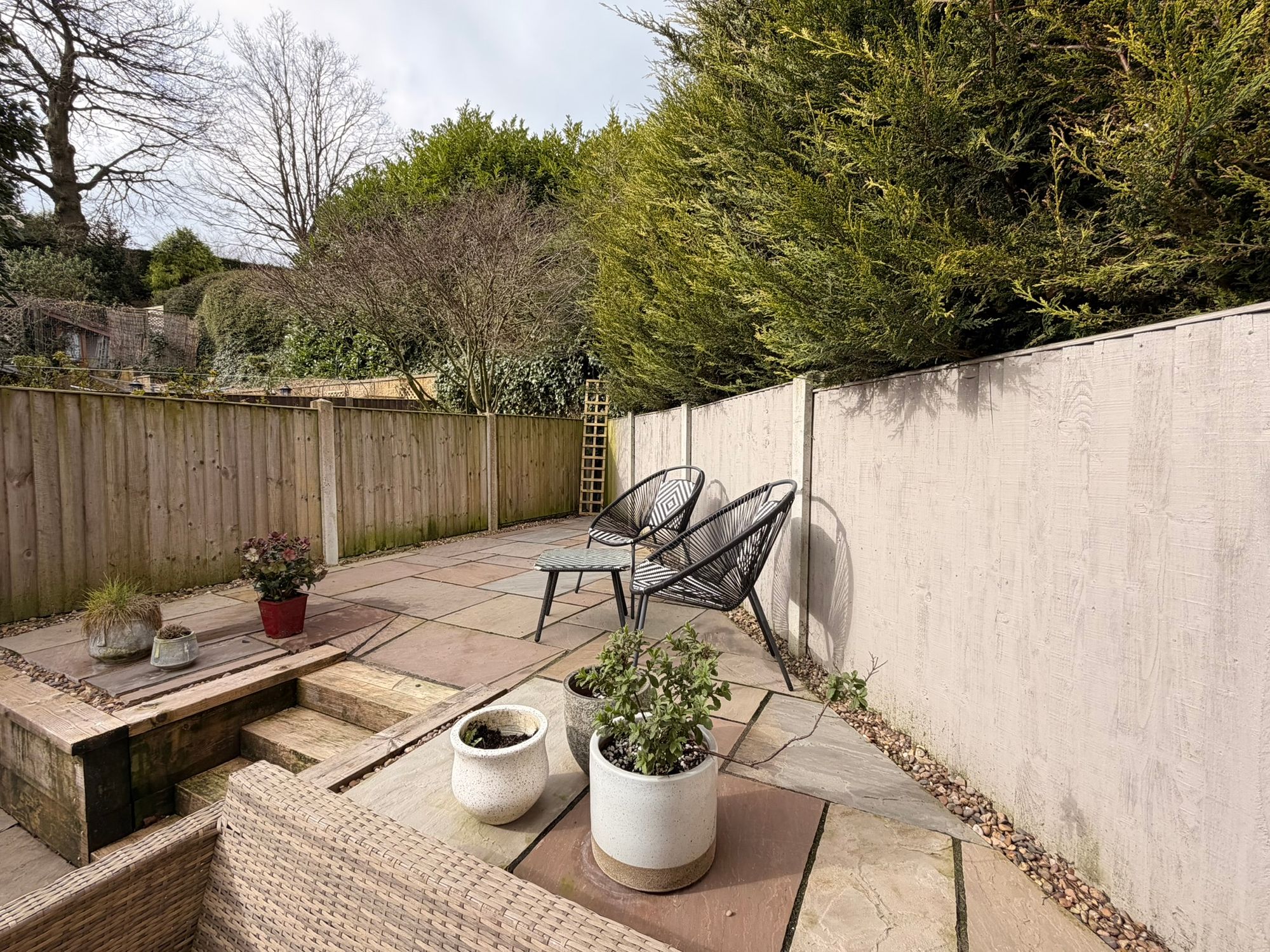 OUTSIDEThe property is situated on a quiet cul-de-sac off Mortimer Road, and benefits from a low-maintenance, slated front garden with a tarmacked driveway providing off-street parking. This leads to a single garage with an up-and-over door and pitched roof, offering additional storage, lighting, and plumbing for a washing machine. The garage also features uPVC twin French doors giving access to the rear garden, making it an ideal space for potential conversion while still functioning effectively as a garage. The rear garden is accessible via twin French doors from the living room or from the garage and is fully enclosed by perimeter fencing and hedging. It has been comprehensively landscaped by the current vendor, creating an Indian stone-flagged, low-maintenance space divided into two distinct areas, with steps leading to a raised terrace—perfect for outdoor furniture and enjoying a high level of privacy.