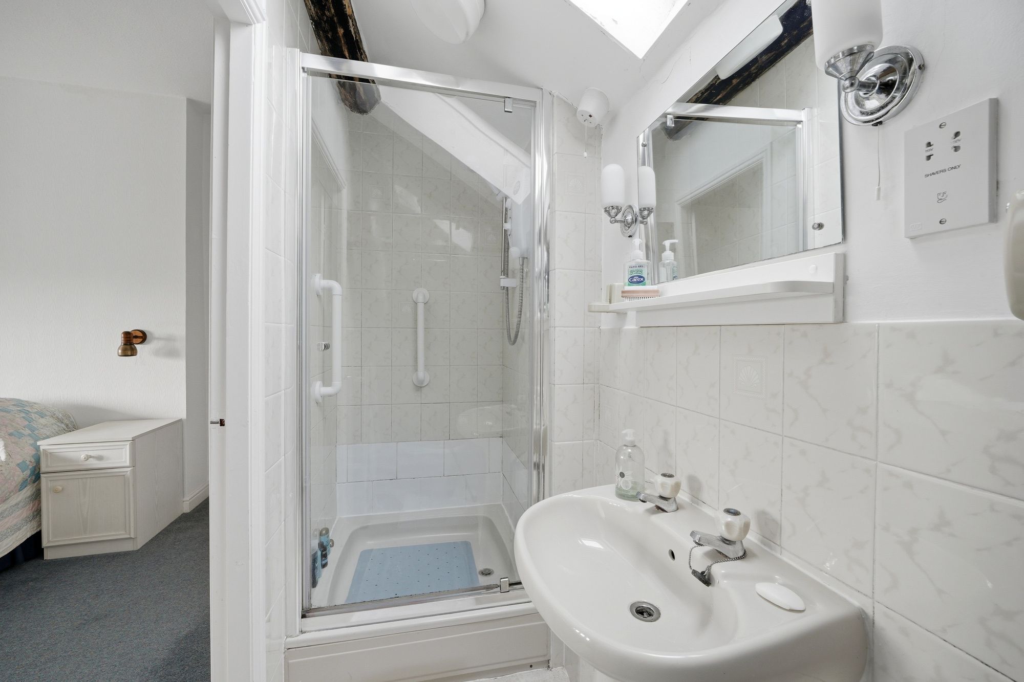 With a Velux double glazed window, partly exposed roof truss, ceiling light point, two wall light points, shaver socket, part tiled walls, chrome ladder style heated towel rail and fitted with a suite comprising pedestal wash basin, low flush wc and a shower cubicle with Mira electric shower fitting.
