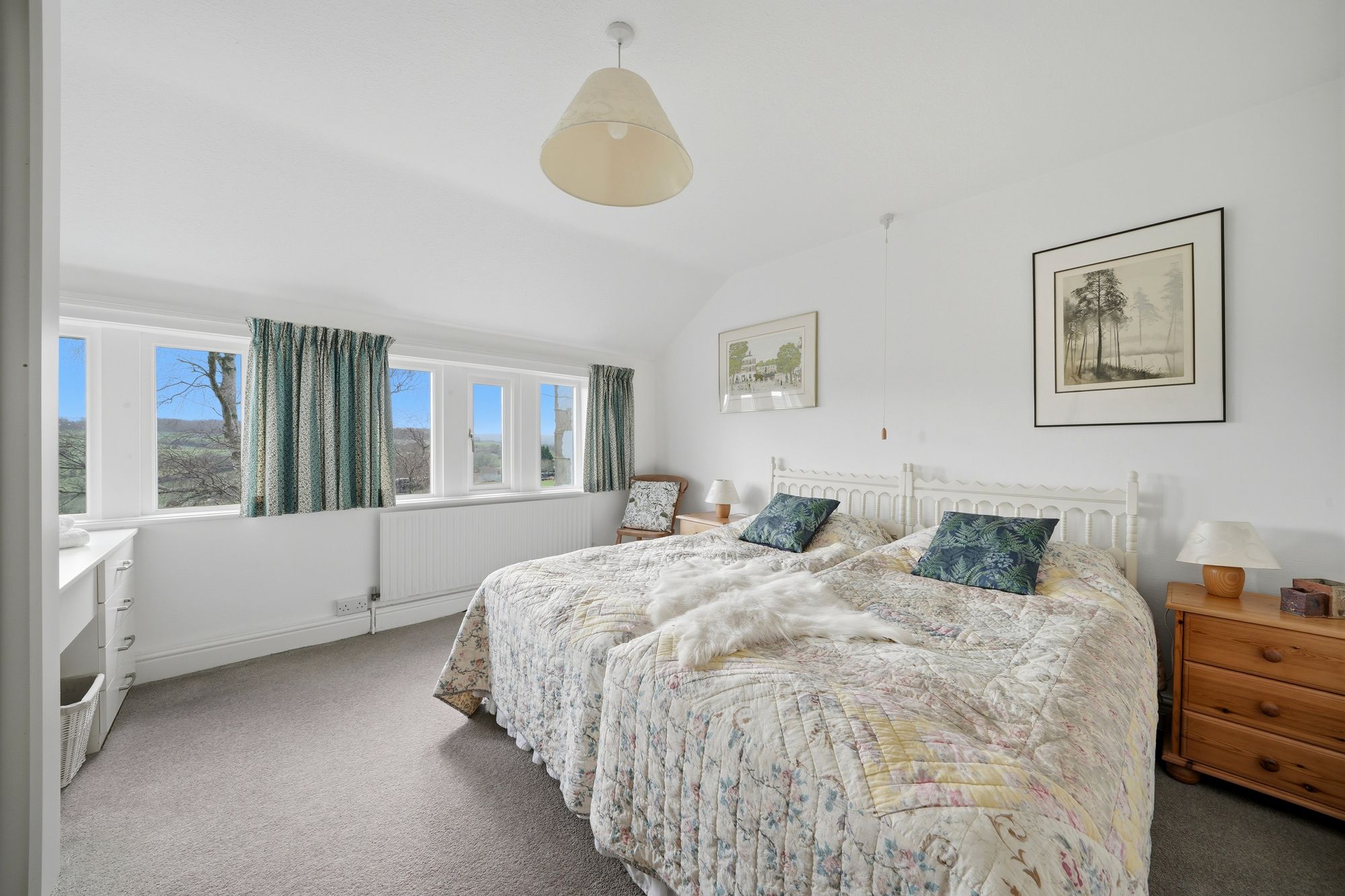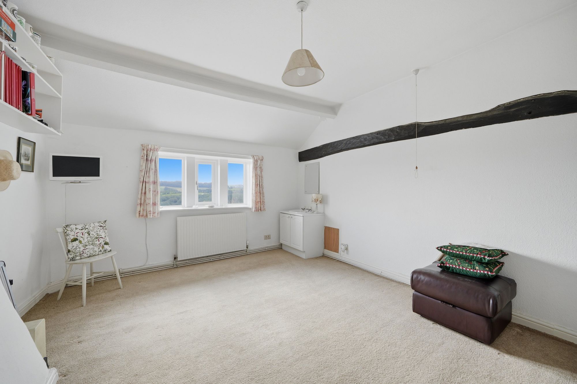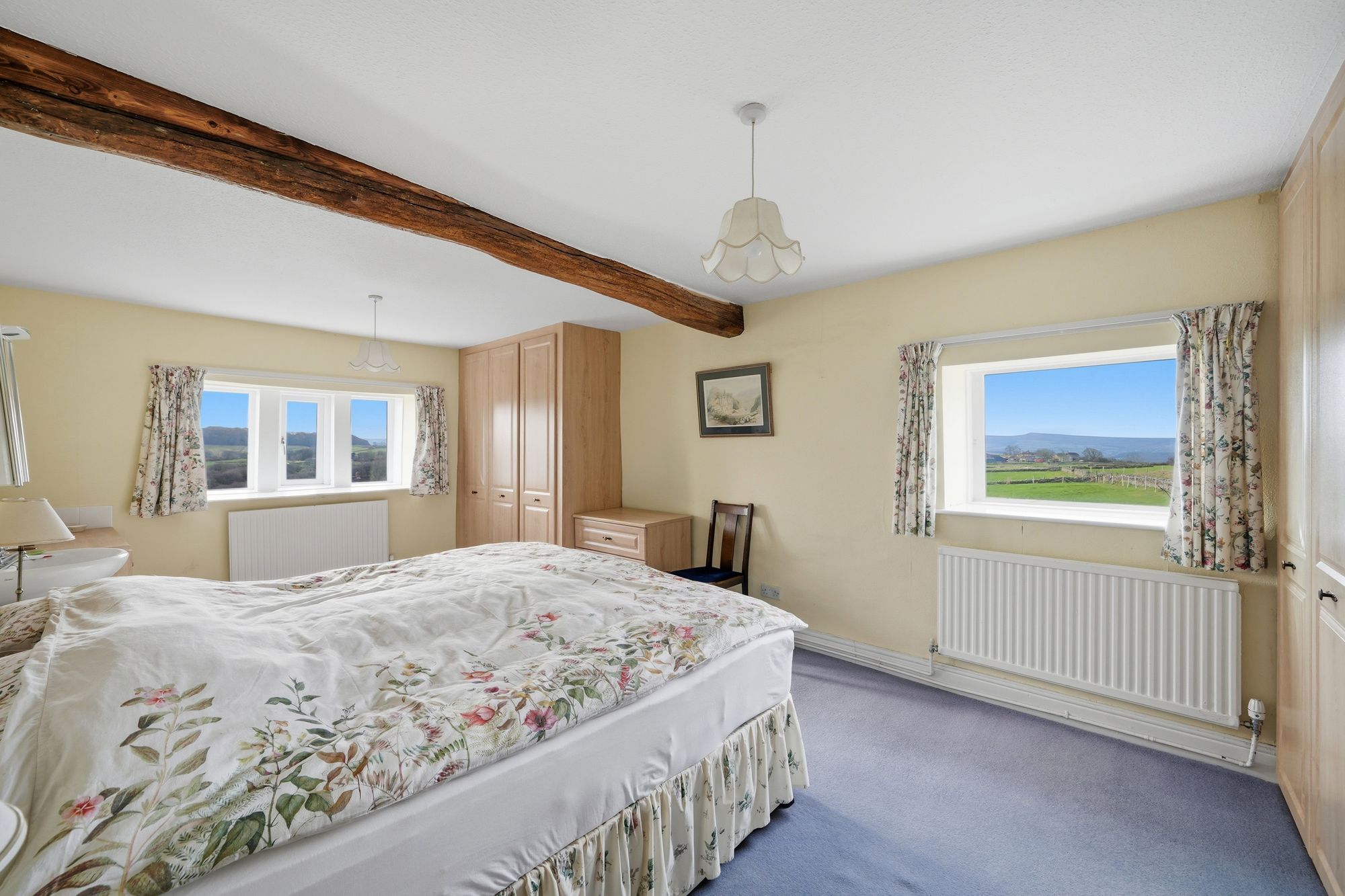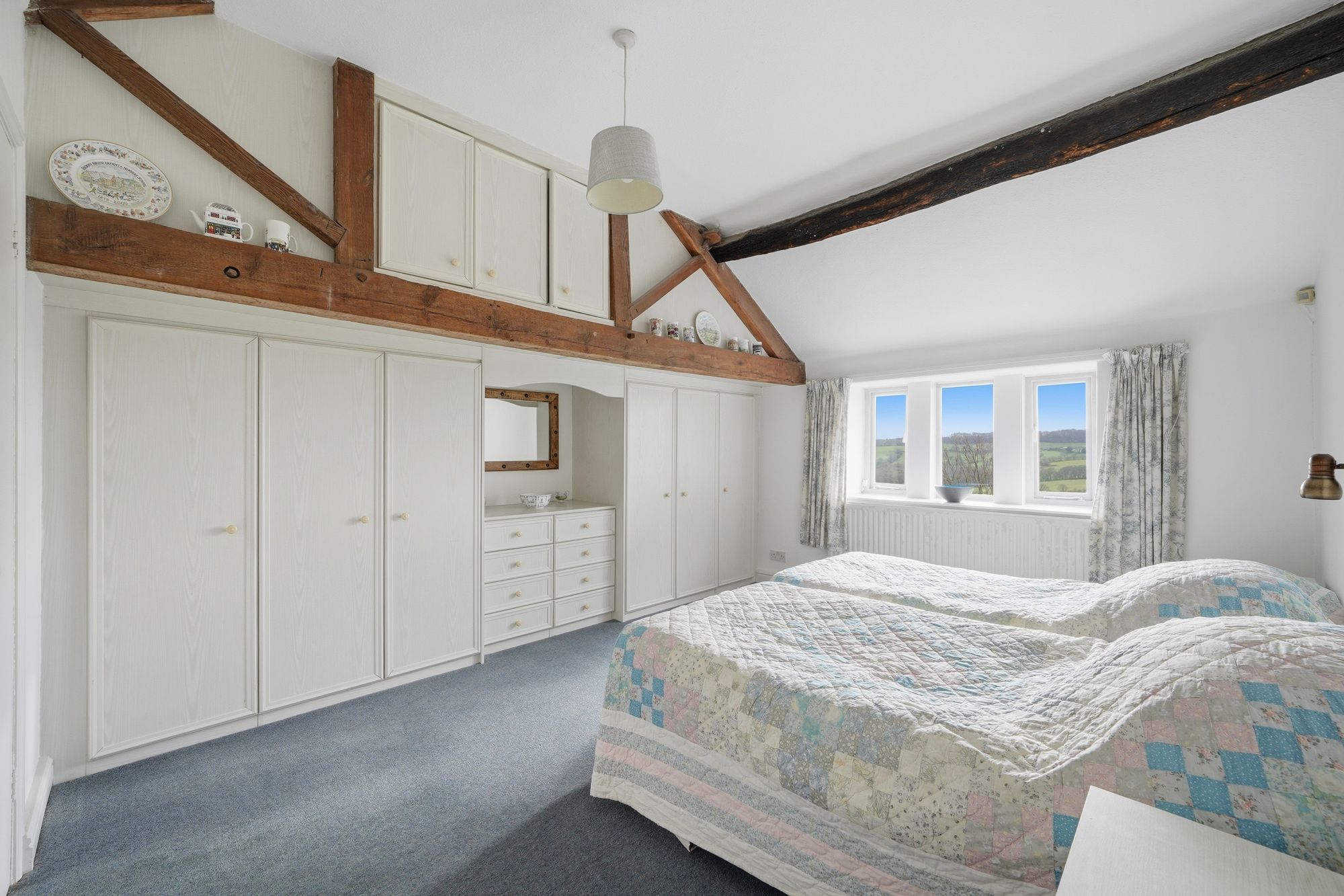 A generous double room situated at the far end of the property and above the dining room and enjoying glorious views across open countryside from timber sealed unit double glazed windows to both front and side elevations. There is a beamed ceiling, central heating radiator, chimney breast with decorative cast iron fireplace, to the left-hand side of the chimney breast there is a fitted floor to ceiling wardrobe, there is a further bank of fitted floor to ceiling wardrobes to one side together with drawers, cupboards and pedestal wash basin with tiled splashback.