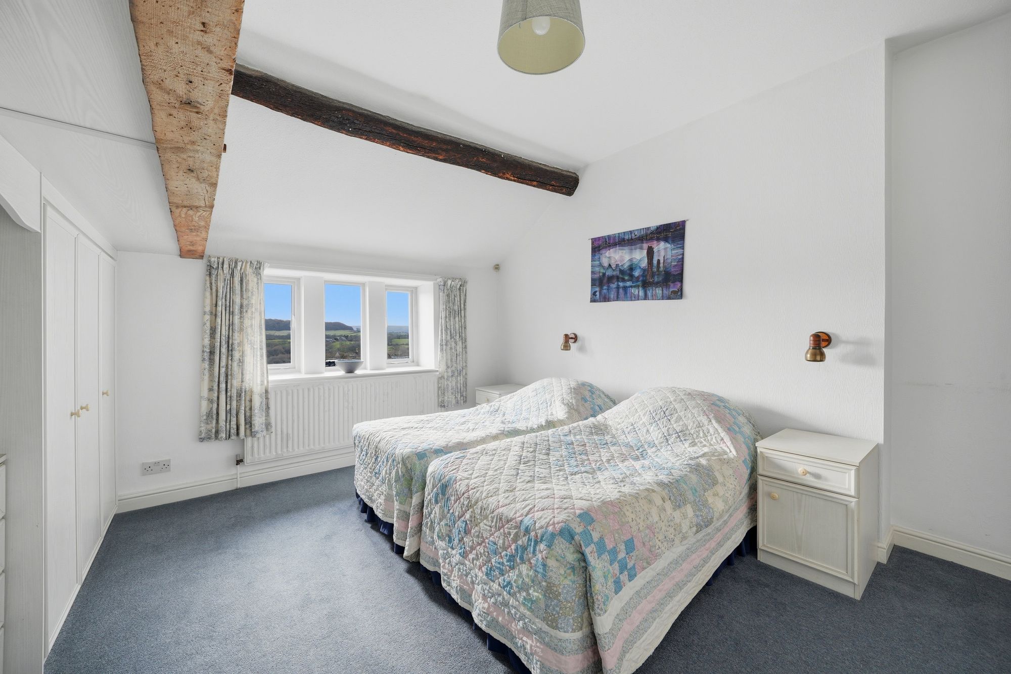 This has a beamed ceiling together with partly exposed truss, there are timber and sealed unit double glazed windows with stunning views over the Woodsome Valley, ceiling light point, two wall light points, central heating radiator and a bank of fitted wardrobes, high level cupboards and a dressing table with drawers beneath. To one side a door gives access to an en-suite shower room.