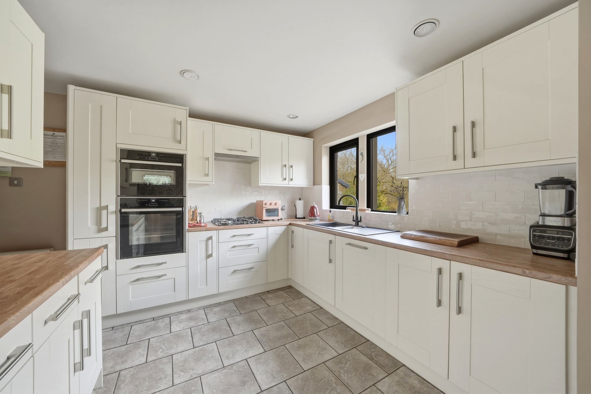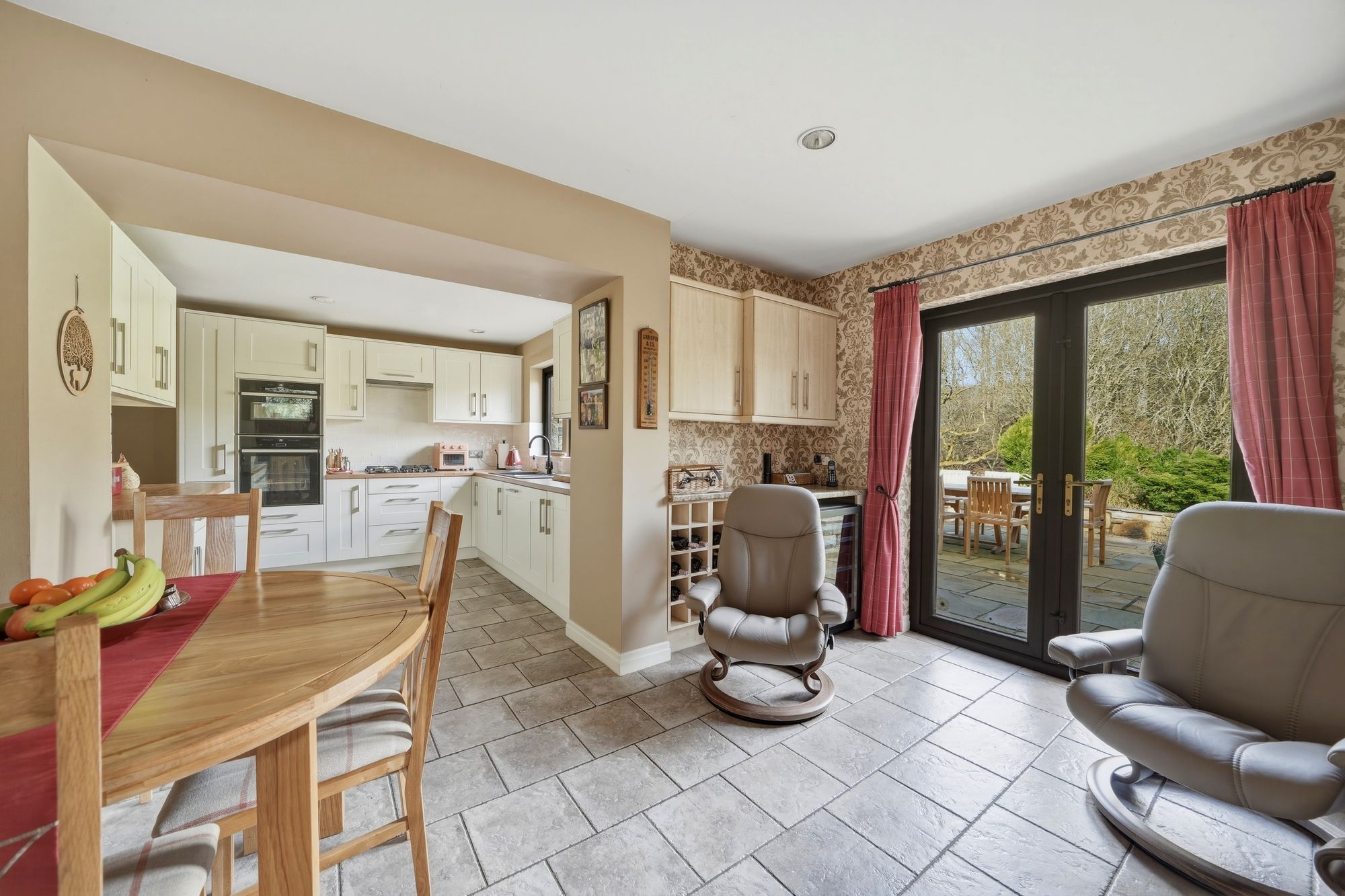This has uPVC double glazed windows which once again enjoy a lovely aspect over the rear garden with woodland beyond, there are inset ceiling spotlights, tiled floor which continues through into the dining/snug area and fitted with a range of matt cream shaker style base and wall cupboards, drawers, these are complimented by brushed stainless steel handles with contrasting overlying timber effect worktops with tiled splashbacks. There is an inset one and a half bowl single drainer sink with waste disposal, with mixer tap, AEG four ring gas hob with a Neff extractor hood over, Neff electric fan assisted oven, Neff combi oven, AEG integrated dishwasher, carousel unit. At the side of the kitchen there is a dining/snug area.