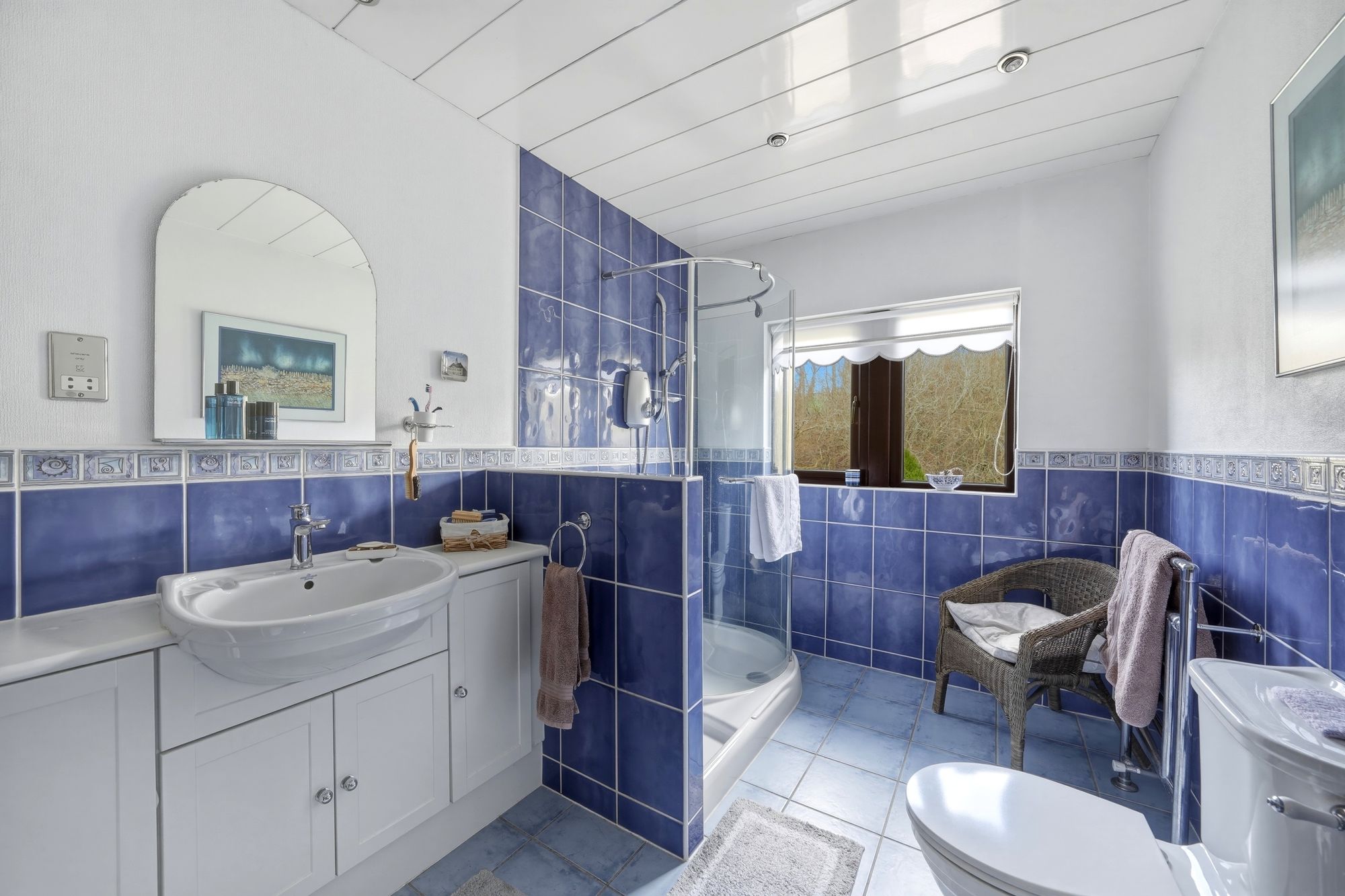With a frosted uPVC double glazed window, inset ceiling downlighters, part tiled walls, Louvre door cylinder cupboard, tiled floor, chrome ladder style heated towel rail and fitted with a suite comprising vanity unit incorporating wash basin with chrome monobloc tap, there are fitted cupboards above together with mirror and pelmet downlighting, low flush w.c and panelled bath with glazed shower screen and mixer tap incorporating hand spray.