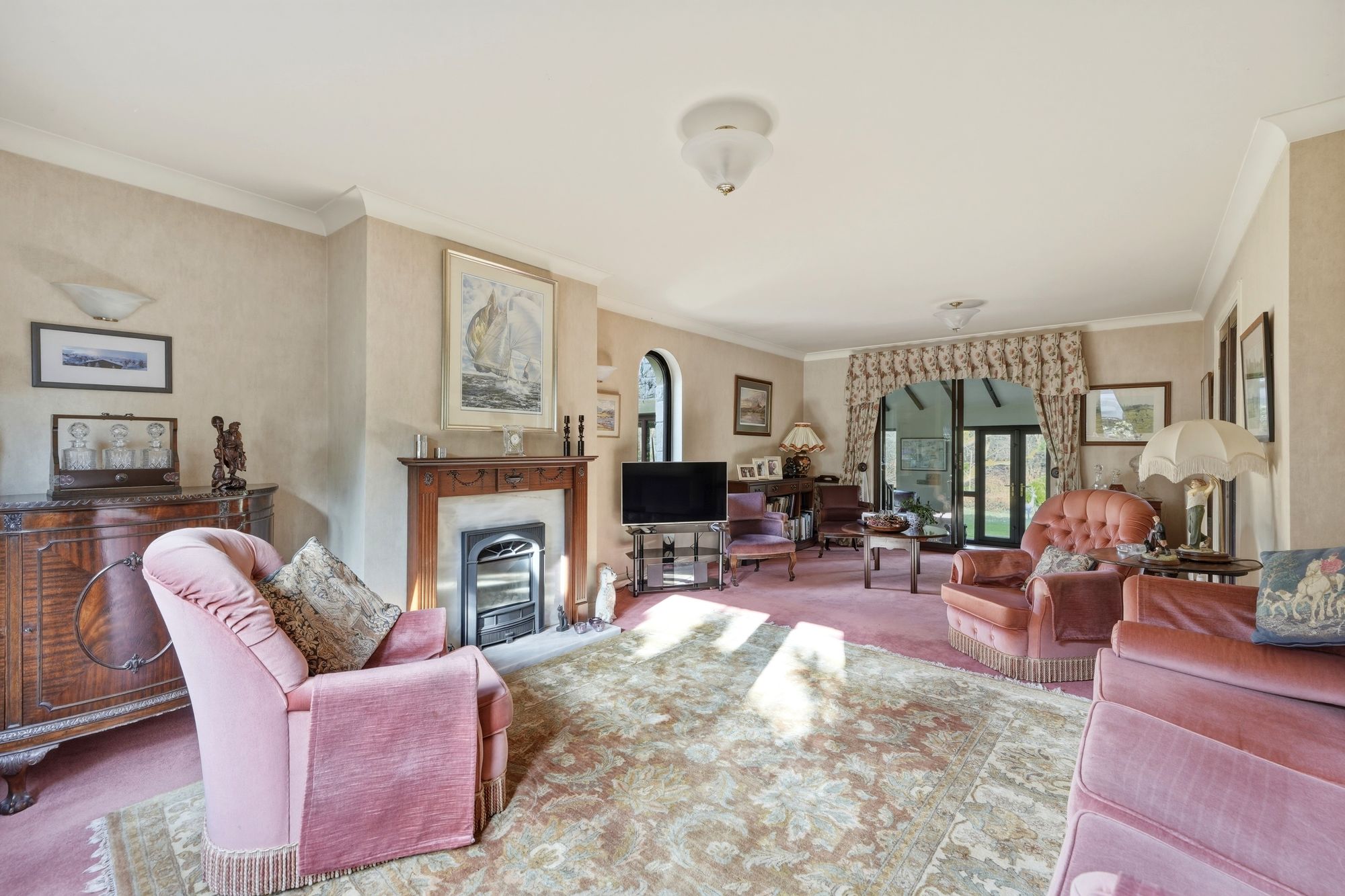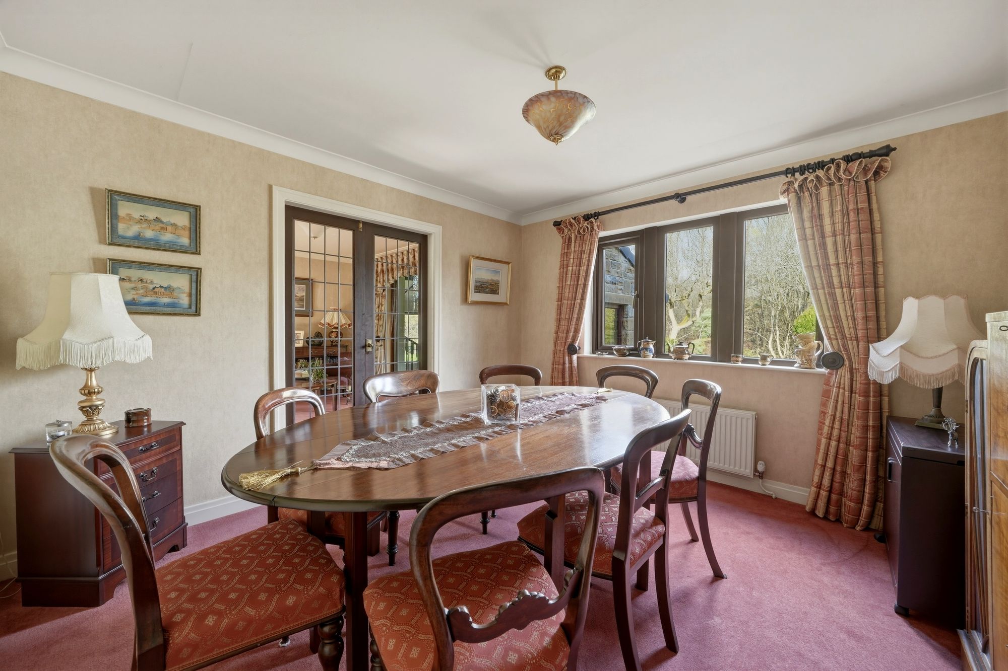 A generous reception room with uPVC double glazed windows to the front and side elevations together with aluminium double glazed sliding patio doors giving access to the garden room. There are two ceiling light points, ceiling coving, three wall light points, two central heating radiators and as the main focal point of the room there is a feature fireplace with Adam’s style fire surround with marble inset and home to a coal effect gas fire resting on a marble hearth. To one side there are twin timber and leaded glazed doors giving access to the dining room.