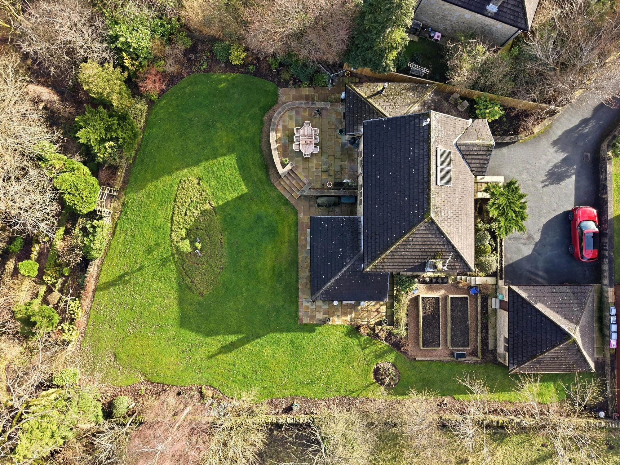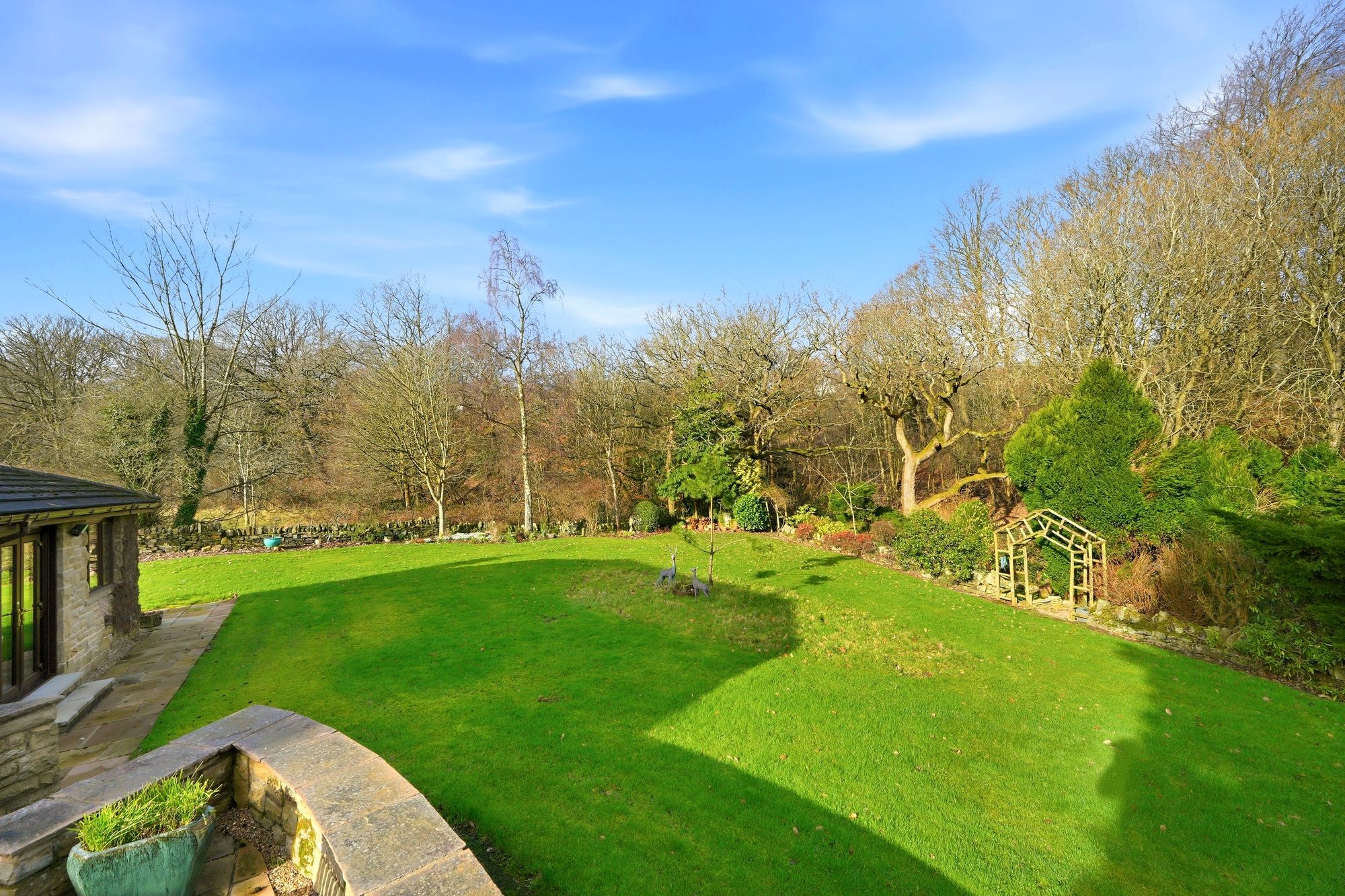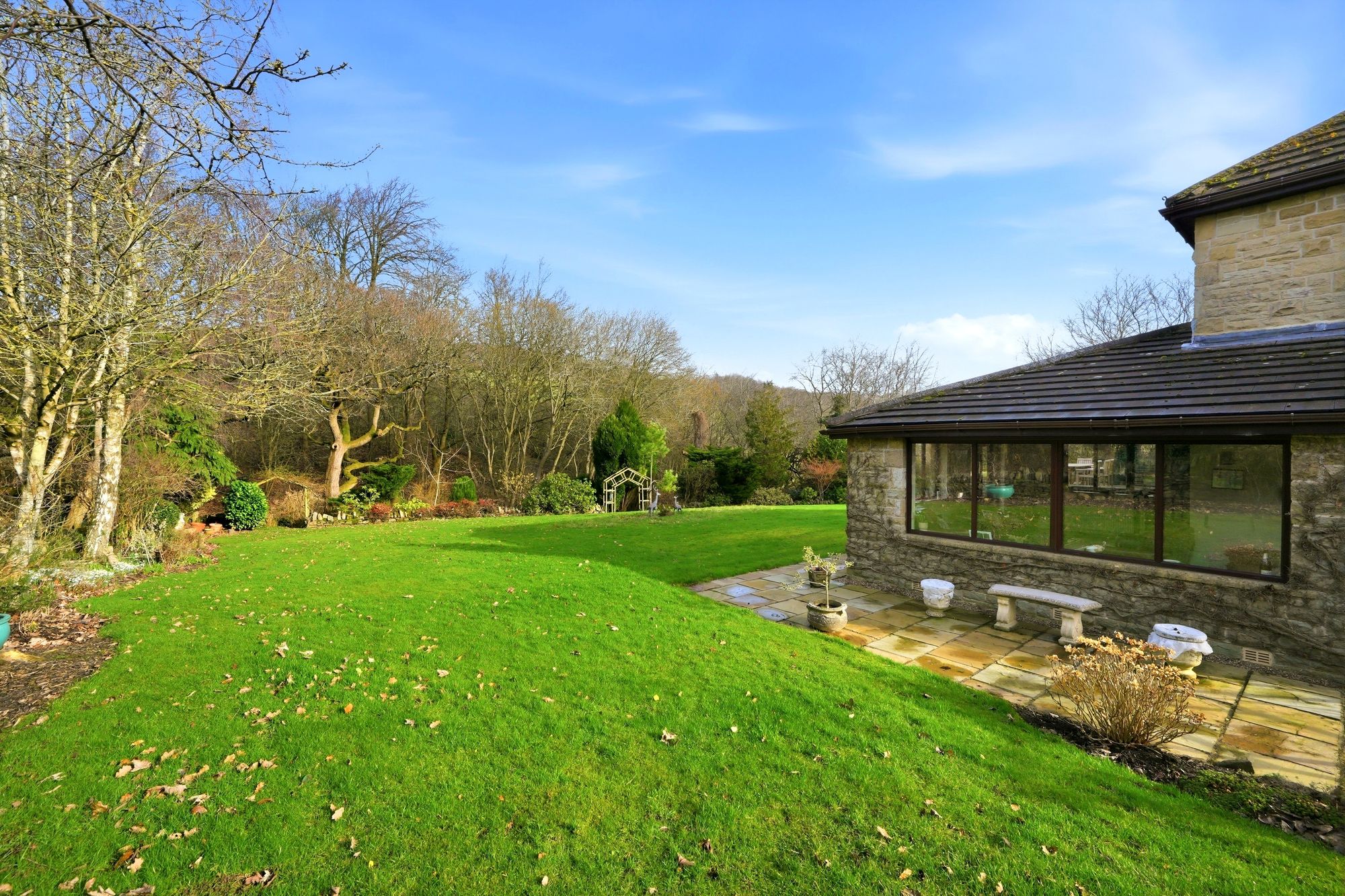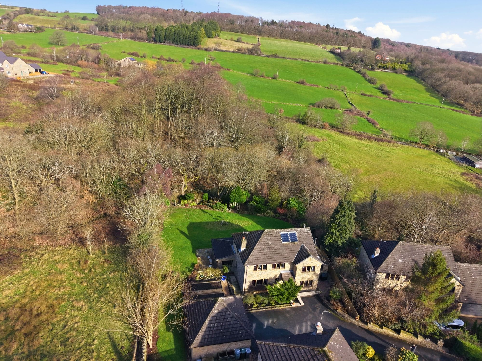 An impressive stone built double fronted executive detached family house situated within a cul de sac at the end of a private drive and standing within large gardens which border fields and woodland.