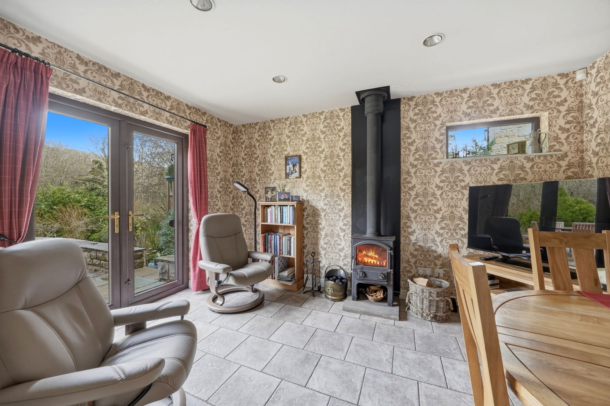 This has a continuation of the tiled floor from the kitchen, there are inset ceiling spotlights, central heating radiator, uPVC double glazed window to the side elevation and uPVC double glazed French doors to the rear opening onto a stone flagged sun terrace. There are fitted wall cupboards, worktop with wine rack beneath and housing for a wine cooler and as the main focal point of the room there is a ‘little thurlow’ multi fuel stove.