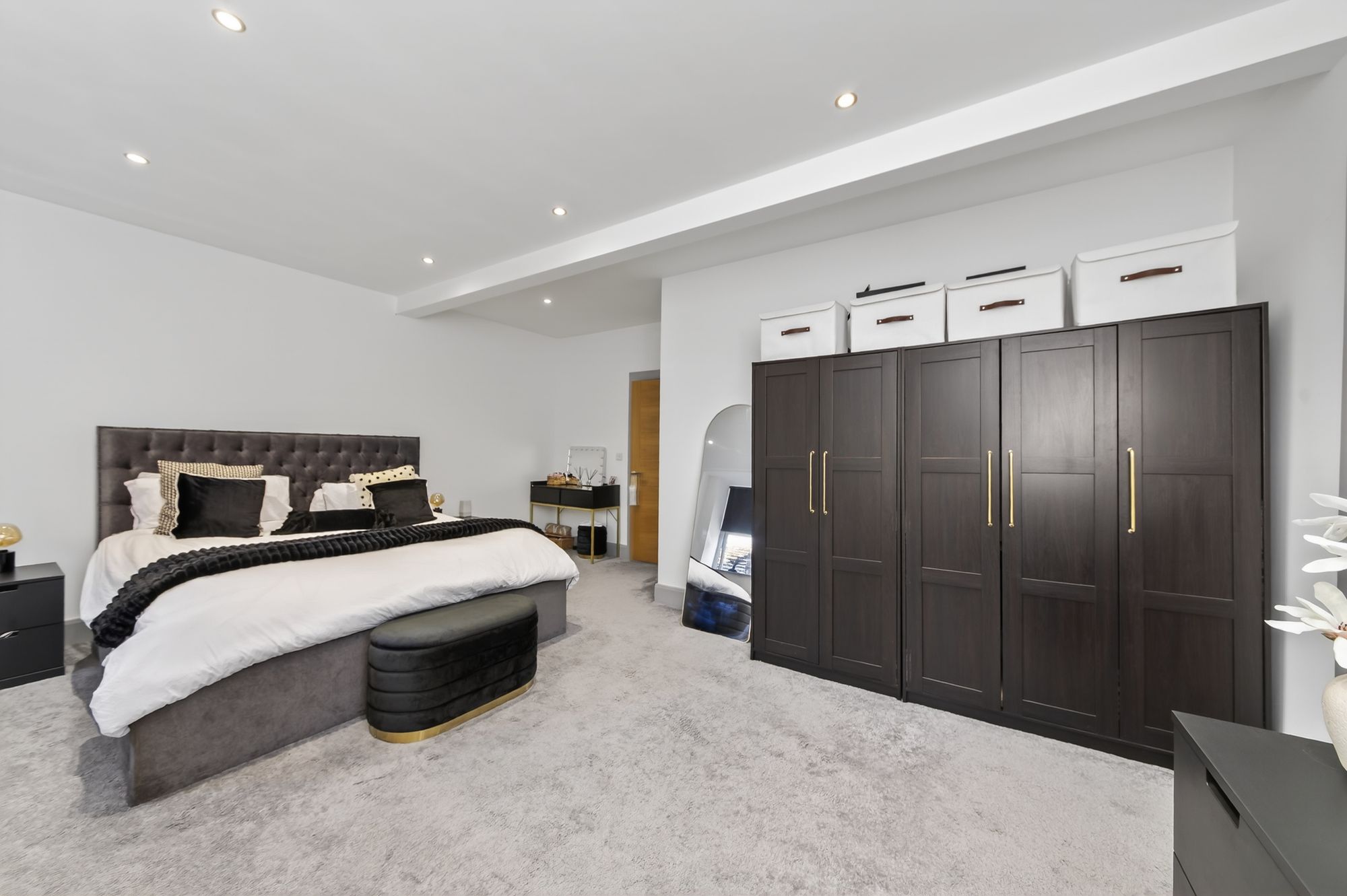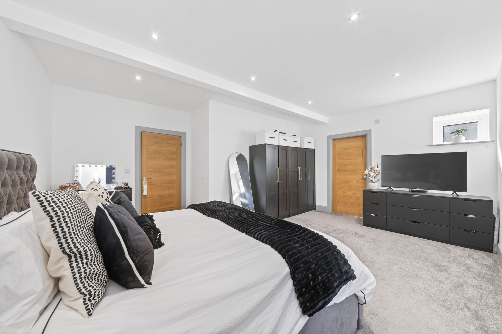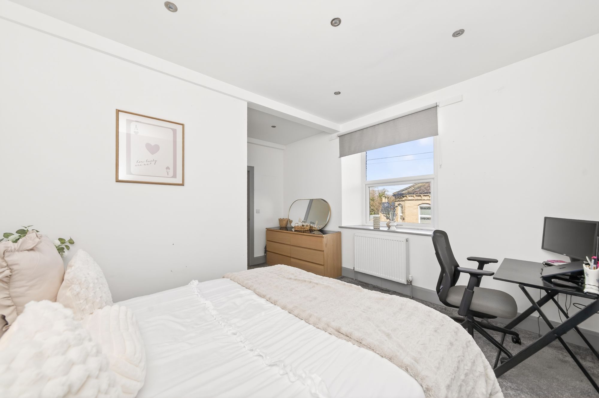 This very large bedroom has a window giving an outlook to the rear and a feature picture window giving an outlook to the side. It boasts a high ceiling heights and inset spotlighting.